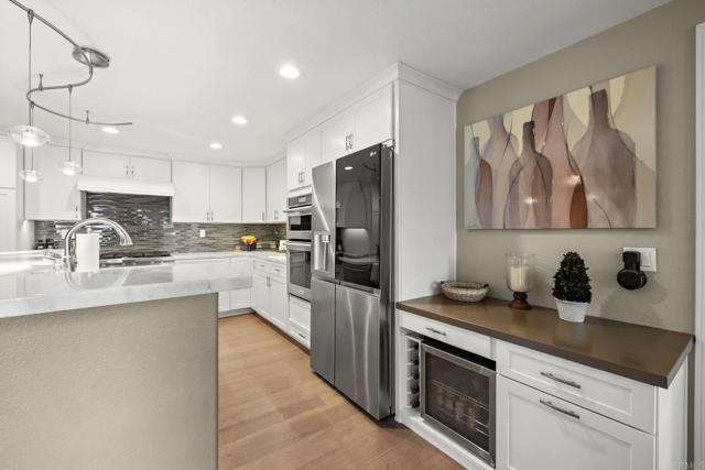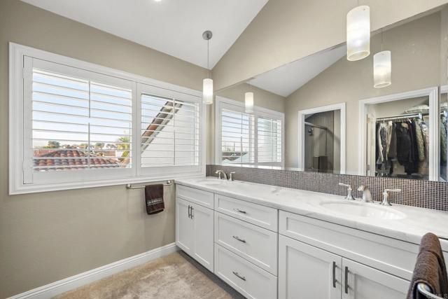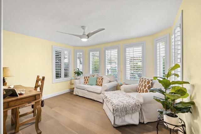 Gated community. This beautifully upgraded home offers a perfect blend of luxury, comfort, and modern convenience. Privacy shutters throughout provide style and tranquility, while carpeted bedrooms add warmth and comfort. Wood flooring flows seamlessly through the main living areas, creating an elegant and timeless look.The loft opens to a private second-story deck with a retractable awning, ideal for relaxing or enjoying San Diego’s year-round outdoor lifestyle. The landscaped yard is designed for both beauty and efficiency, featuring path lighting on a timer and a water-saving drip irrigation system that services the vertical herb garden and all surrounding plants. Additional highlights include an expansive attic storage area above the garage with a folding stairway, a spacious two-car garage, and wiring for a Level 2 (240-volt) electric vehicle charger—perfect for today’s modern homeowner. This is a home that has been thoughtfully cared for and upgraded throughout. A must-see property—schedule your private showing and come experience it for yourself.