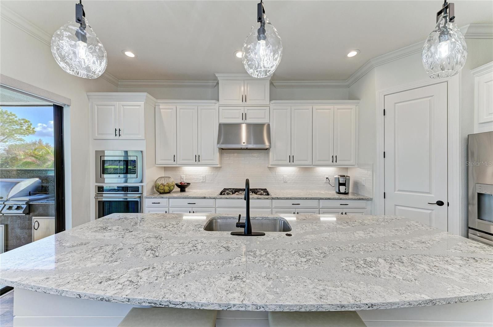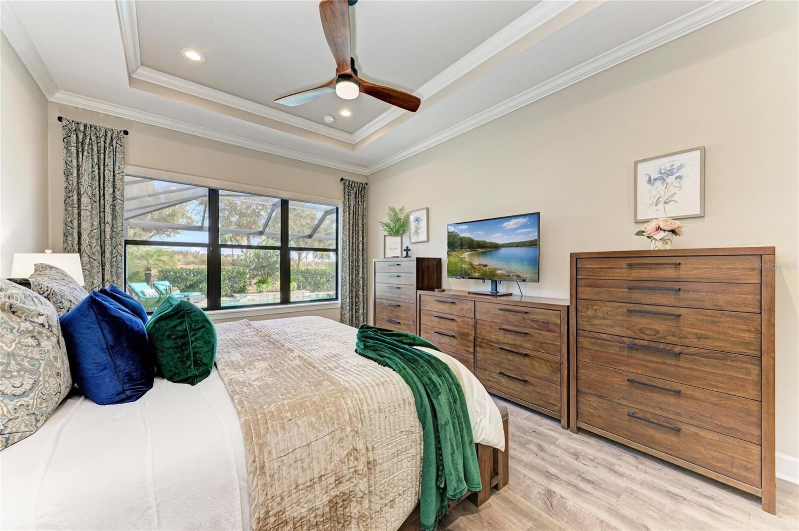 Located within the gated Esplanade Golf & Country Club at Lakewood Ranch, this rarely available and exceptionally upgraded Trevi floorplan offers the ultimate advantage for multi-generational living, with two primary suites, a separate area for guests or dedicated work from home office space. This home includes a coveted Golf Membership. Perfectly positioned near holes 2 and 17, the front of the home capture breathtaking water views with no homes directly in sight while the back offers landscaped berms and distant golf course views. Inside, the two-story design offers exceptional flexibility and thoughtful separation of space. The first-floor features wood-look laminate flooring throughout, a welcoming den or gathering room with water views, a separate dining area enhanced with a tray ceiling and designer wall panels, an open great room with sliders to lanai with new custom bar cabinetry featuring a 48-bottle dual-zone wine cooler and also 2 private bedroom suites ideal for guests or multi- generational living. The expansive primary suite offers a tray ceiling, views to pool area with new electric room darkening shades, spa-like bathroom with oversized shower and separate vanity areas, and a spacious newer custom closet and additional storage under stairs. The gourmet kitchen offers Cambria quartz countertops, Café stainless appliances, a newer GE refrigerator, natural gas cooktop, walk-in pantry with wood shelving, elegant pendant lighting, and sliders leading to lanai. A dreamy lanai frames a gas-heated, saltwater resort-style pool and spa with sun shelf and waterfall feature, complemented by a brand-new travertine deck. On one side of the lanai, a fully appointed granite outdoor kitchen showcases a built-in grill and griddle, newer ice maker, sink and plenty of storage, while the opposite wall features a custom built-in refrigerator and prep and entertaining station, together creating a private retreat designed for effortless hosting. Upstairs, two additional bedrooms share a bath and charming reading nook, plush carpeting, barn doors for complete privacy at staircase, and picturesque water and golf course views from every window create a serene retreat level. The light-filled interior, recently upgraded with modern energy-efficient recessed lighting, designer fixtures, plantation shutters, and new ceiling fans throughout. Additional features include a spacious laundry room, convenient powder bathroom, 8’ doors, and crown molding, while custom electric privacy shades enhance the living and kitchen spaces. The garage continues the elevated standard with an extended garage featuring epoxy-coated floors and new built-in storage closets. The owners of this home will enjoy a renowned 18- hole championship golf course, with additional resort style living amenities of tennis and pickleball courts, two fitness centers with an extensive calendar of classes, two resort-style pools, a full-service spa and salon, on-site dining at the Bahama Bar and Barrel House Bistro where live music, wine dinners, special events and fun holiday activities are part of vibrant social calendar, with landscaping maintenance included in HOA fees. Situated just moments from local town centers, parks, UTC, award winning Gulf Beaches, and convenient access to airports I the #1 Selling community in the U.S. In a fully built-out, established neighborhood, this move-in-ready residence presents an elevated lifestyle at an extraordinary value.