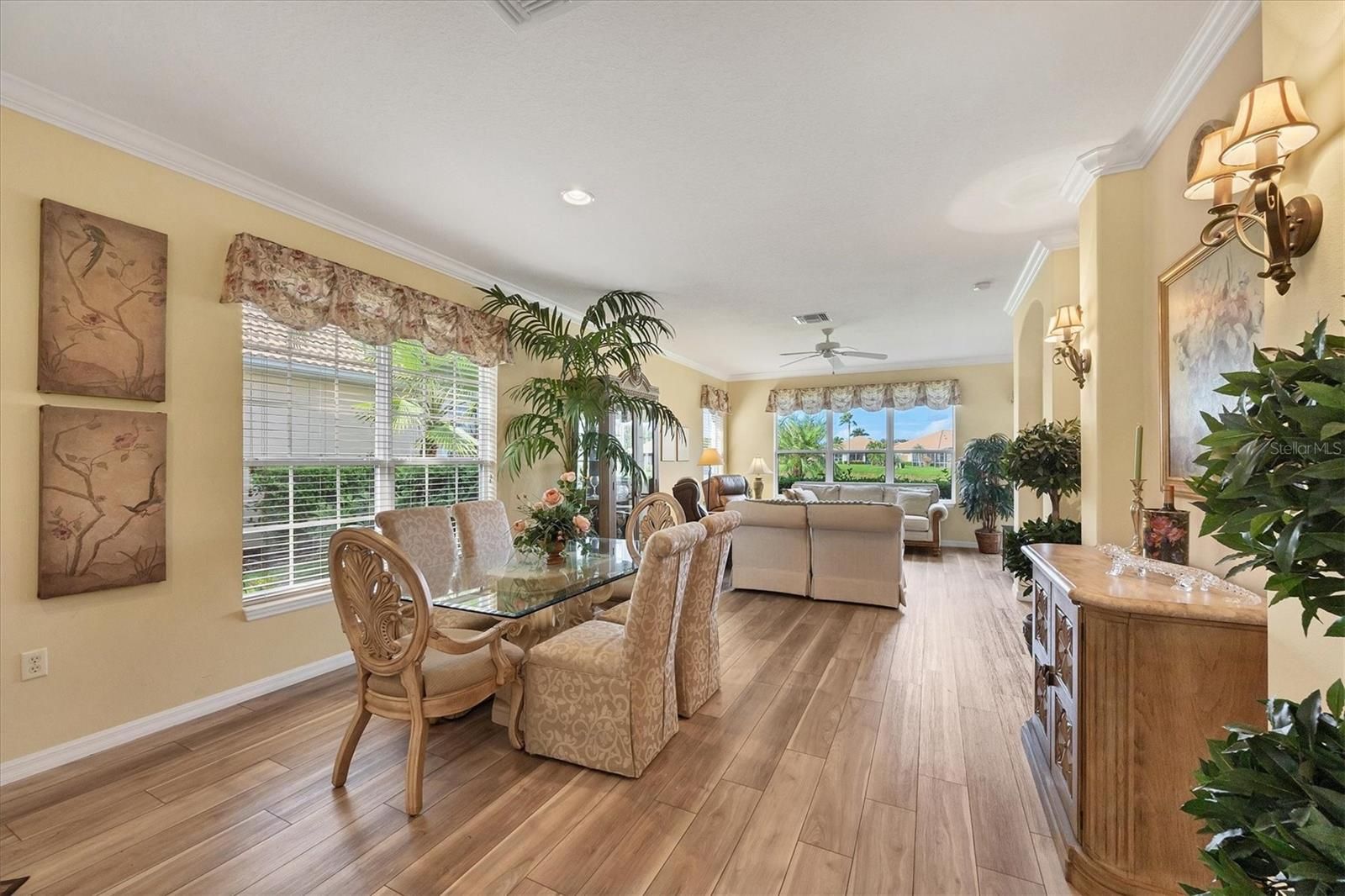 - Ceiling Fan(s), Crown Molding, Eat-in Kitchen, High Ceilings, Living/Dining Room, Open Floorplan, Solid Surface Counters, Solid-Wood Cabinets, Split Bedrooms, Tray Ceiling(s), Walk-In Closet(s), Window Treatments