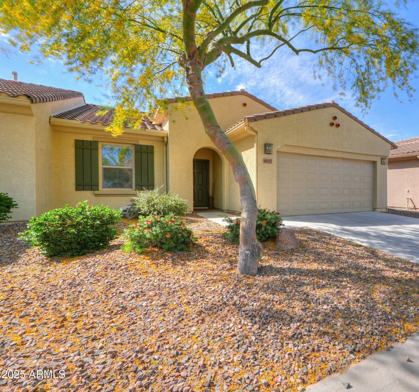 FULLY FURNISHED Sagebrush Villa located in the luxury Active Adult community of Robson Ranch! This charming 2 Bedrooms,2 Baths, 2 Car Garage Villa is ideally located within walking distance to the Clubhouse, Sports Center, Pickleball, Restaurant & numerous Activities. Kitchen features beautiful Beech cabinets w/knobs, roll-out shelves, black appliances, stainless sink w/new faucet, spacious breakfast bar, pantry & pendant lights. Plantation shutters, 2-tone paint, & water softener are some of the upgrades. Don't forget to enjoy your beautiful, spacious back patio admiring the desert views. Exterior maintenance & landscaping is taken care of for you so you can enjoy all this multimillion-dollar resort lifestyle has to offer. Completely furnished & move-in-ready! Everything stays!