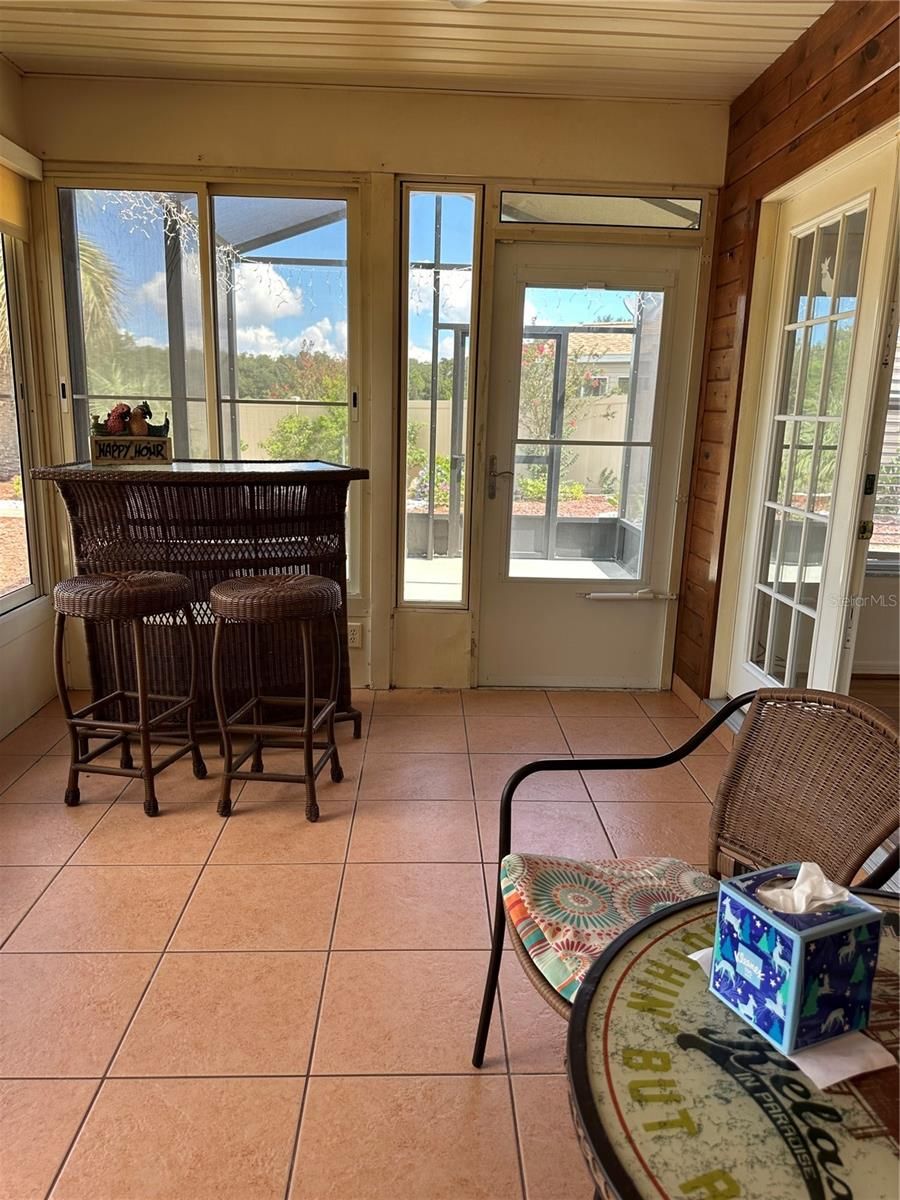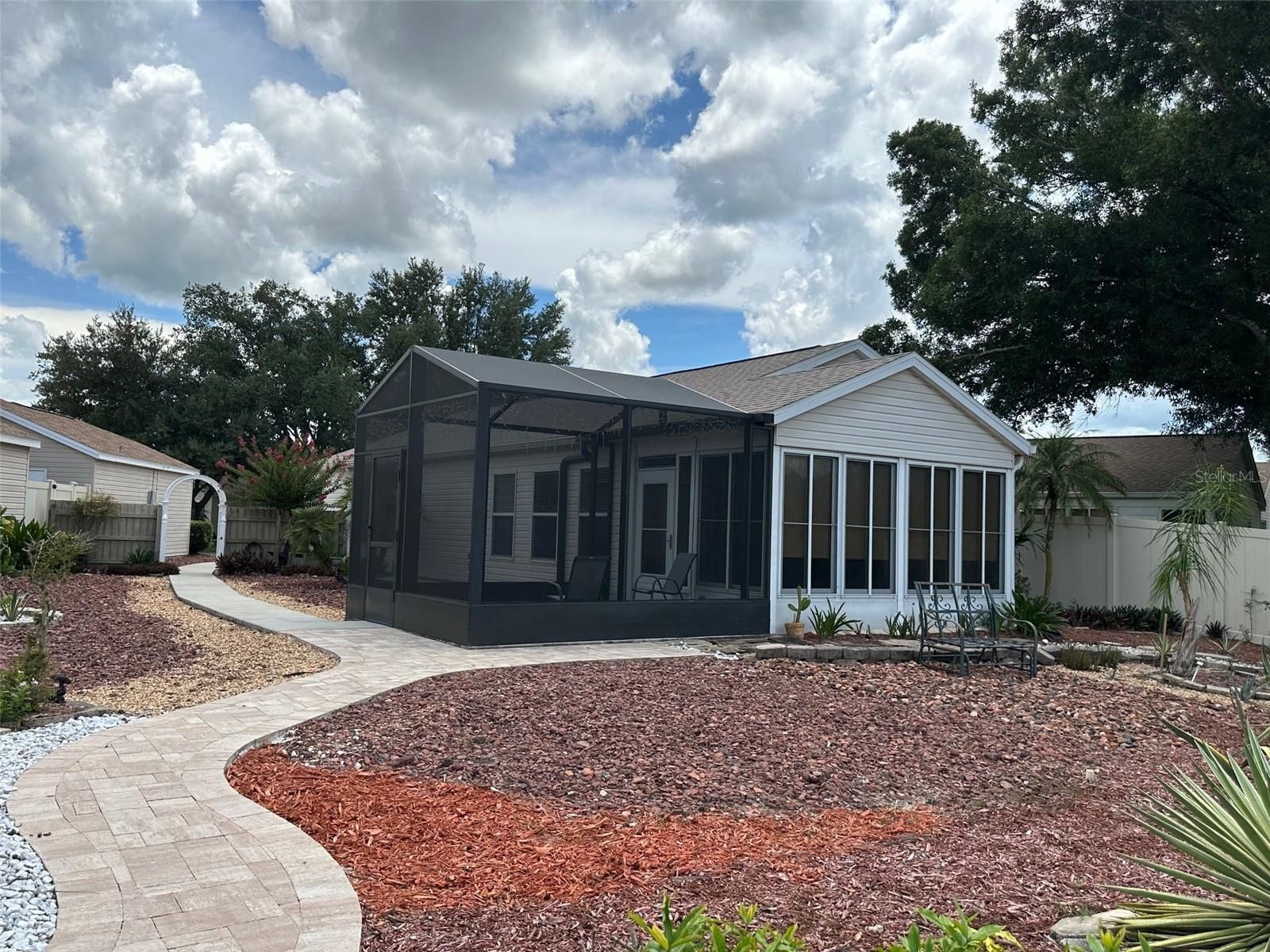 If you love nature and beautiful sunsets your search is over. This 2BR,2B with study/den is located on a large lot with a panoramic view of nature in the backyard surrounded by a new PVC fence. No neighbors behind you, just unlimited fantastic sunsets, tropical fauna. It begins with great curb appeal including a paver driveway and walk leading to the covered front porch. To your right is a walk leading to the backyard through an arched gateway. The property has xeriscape landscaping which reduces outside maintenance. When you enter, to your left is an updated kitchen with beautiful wooden cabinets that provide lots of convenient drawers even in the pantry. Above the Corian counters there is a stone tile backsplash. There is an eating area in the kitchen. In addition there is a large opening to the dining room and living room so you can enjoy visiting with your guests. The formal dining room has an updated nickel light. The space flows to a large living room. Large windows with Plantation shutters provide great natural lighting to this area. Off the living room here is a hall to he bedrooms and guest bathroom. The large primary bedroom has a large walk-in closet and the updated ensuite bath has luxury vinal flooring ,new granite vanity and a large walk-in shower. The guest bedroom has a large closet. The guest bathroom has an updated vanity and a tub/shower combination. The living room ,hall and bedrooms have laminate flooring. At the far end of the living room you enter the study/den which has wonderful new built in office units. French doors lead to the fully enclose lanai. There is a pine accent wall, sliding windows and screens and privacy shades. A door leads to a new 12X13 screen room (birdcage). Step outside and a paver walk leads to a peaceful sitting area under a palm tree. The garage has a screen door and a laundry area with a utility tub. There is a door to a private bonus space that you can use as you wish. This is an ideal home for you to begin living your dream in the Florida sunshine. The Plantation at Leesburg is a a gated 55+ community that offers a great lifestyle and is an active community. It boasts 3 activity center, 3 pools with spas, 2 gyms, tennis and pickleballs courts, a driving range and 2 18 hole golf courses, along with many other amenities, clubs, etc. New Roof 2025, new microwave, dishwasher, washer. Whole house water filter