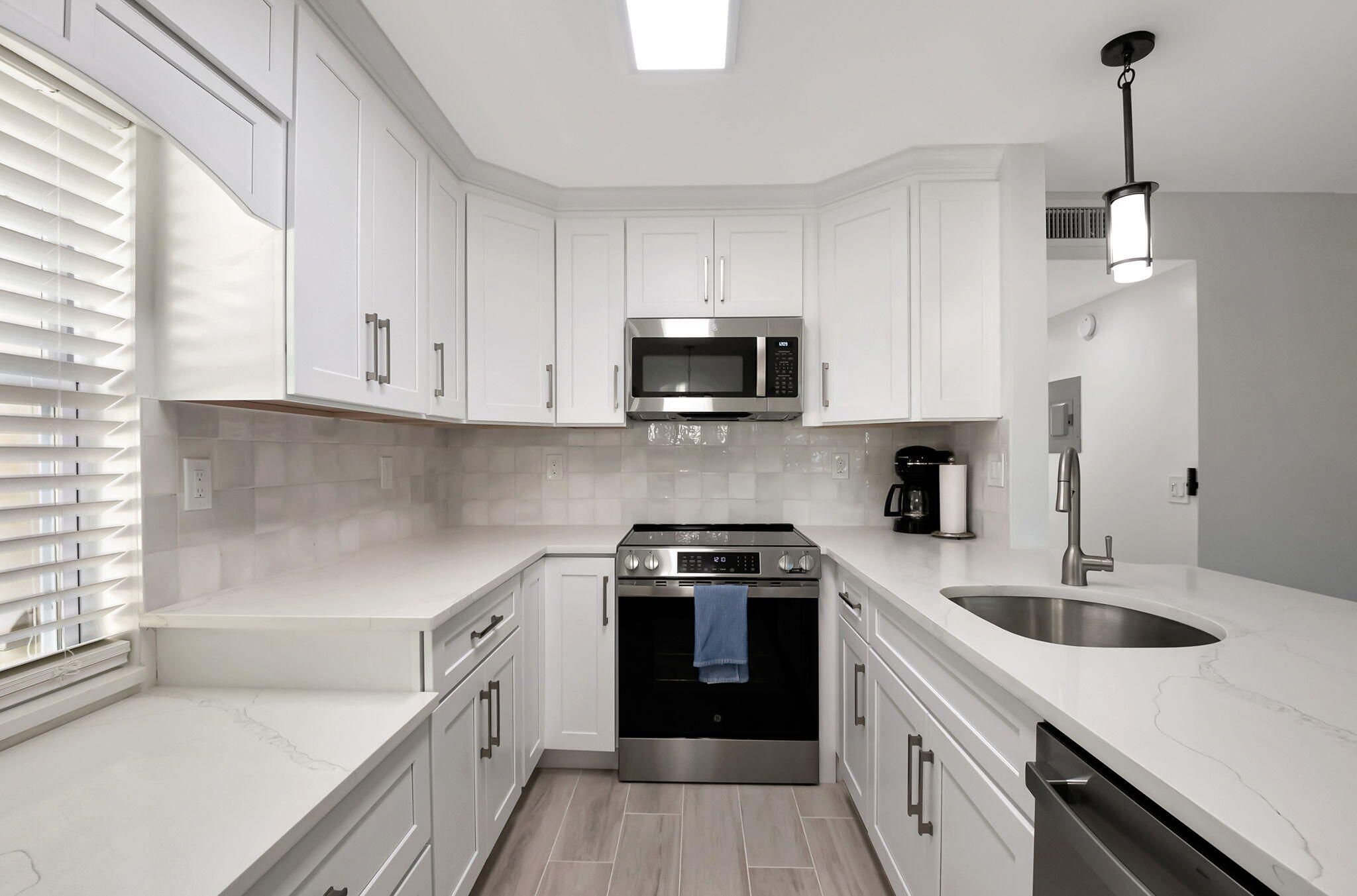 Step into luxury with this completely renovated 2-bed, 2-bath condo at 493 Flanders K, nestled in the vibrant 55+ community of Kings Point Golf and Country Club. RENT RIGHT AWAY NO WAIT! Every inch of this home has been thoughtfully upgraded with top-tier finishes, ensuring a seamless blend of elegance and functionality. This condo features all-new essentials, including a brand-new A/C system, hot water tank, and upgraded electric panel for worry-free living. The stunning open-concept kitchen is a chef's dream, boasting quartz countertops, top-of-the-line stainless steel appliances, a tiled backsplash, and ample natural light. A breakfast bar invites you to pull up a stool and enjoy your morning coffee in style. Freshly painted with smooth ceilings and designer wood-look porcelain tile