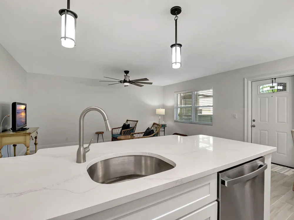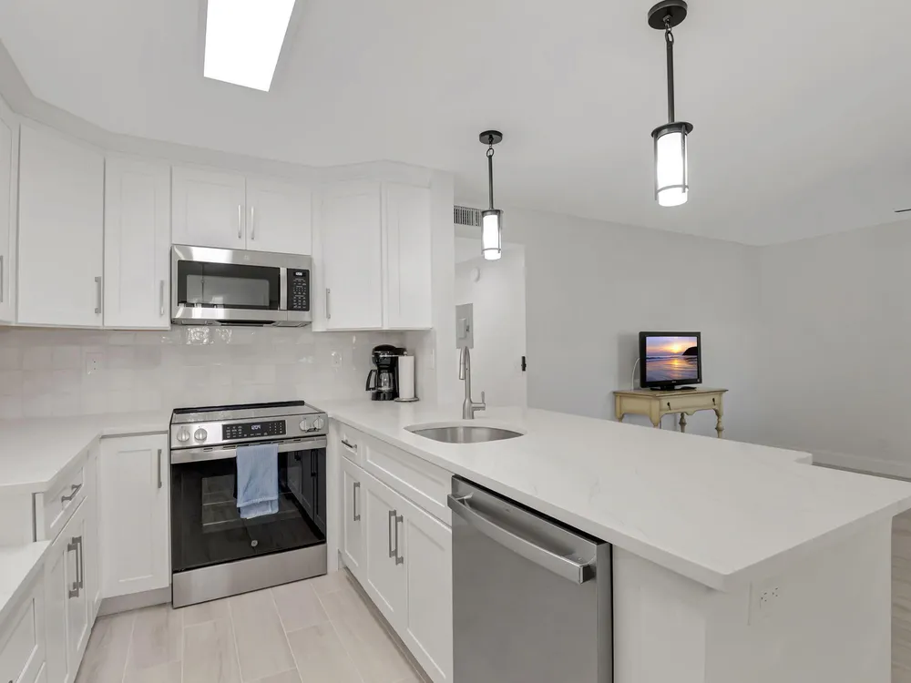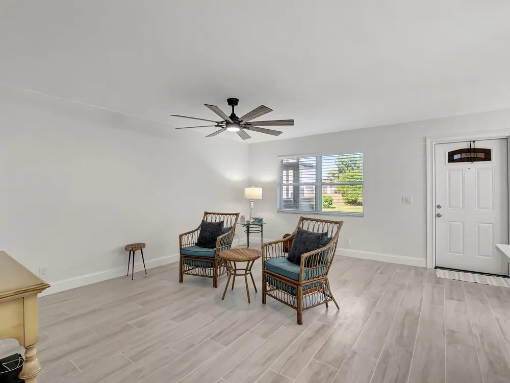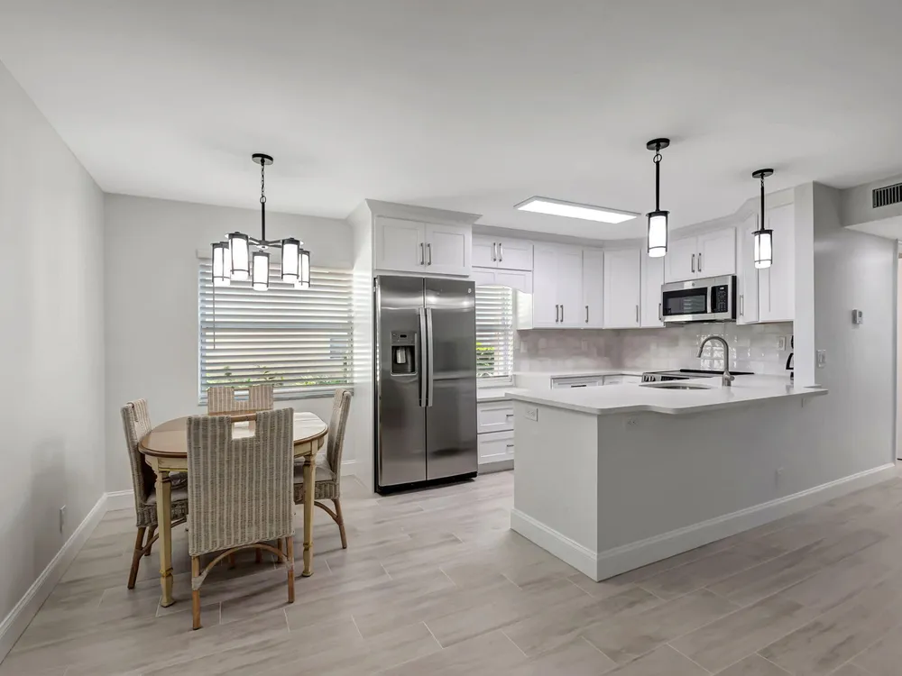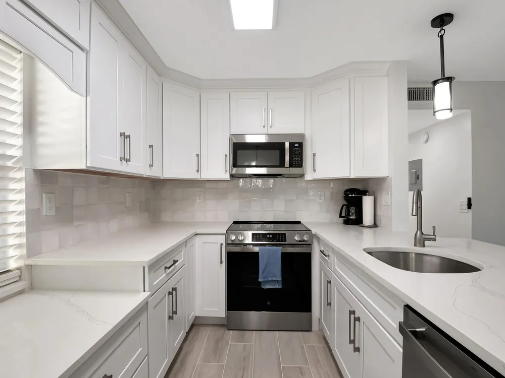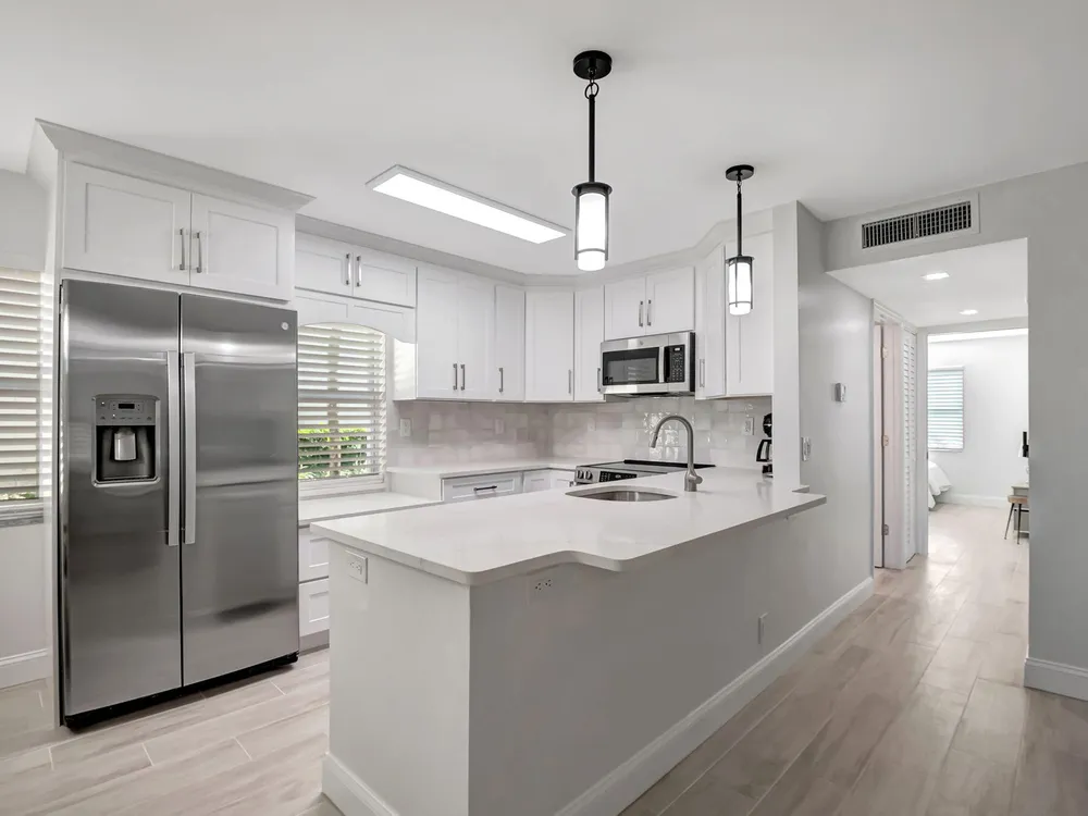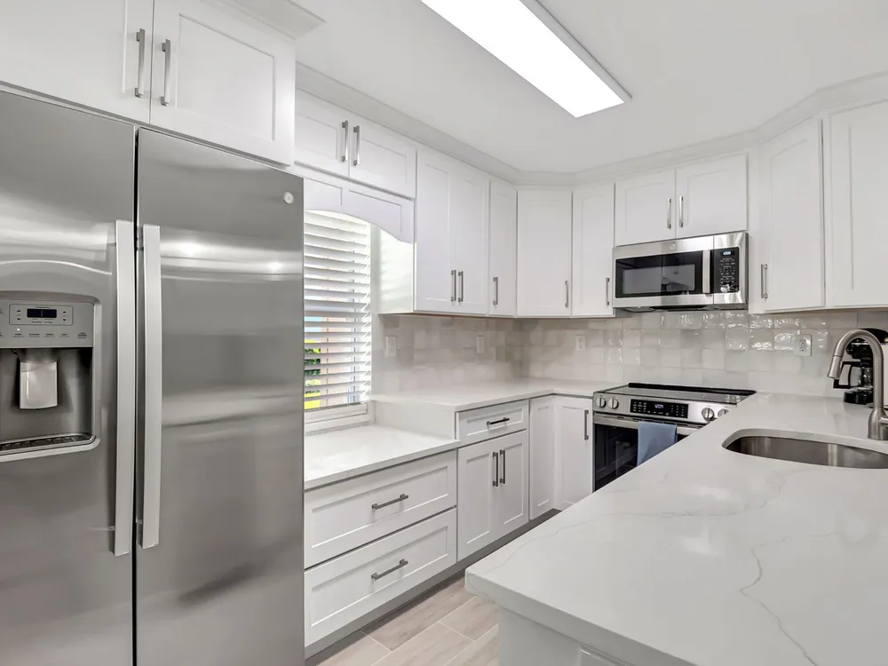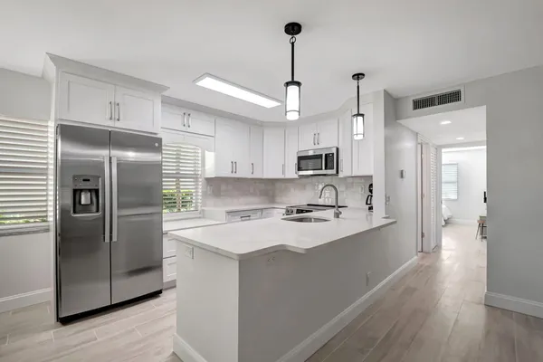 Step into luxury with this completely renovated 2-bed, 2-bath condo at 493 Flanders K, nestled in the vibrant 55+ community of Kings Point Golf and Country Club. RENT RIGHT AWAY NO WAIT! Every inch of this home has been thoughtfully upgraded with top-tier finishes, ensuring a seamless blend of elegance and functionality.This condo features all-new essentials, including a brand-new A/C system, hot water tank, and upgraded electric panel for worry-free living. The stunning open-concept kitchen is a chef's dream, boasting quartz countertops, top-of-the-line stainless steel appliances, a tiled backsplash, and ample natural light. A breakfast bar invites you to pull up a stool and enjoy your morning coffee in style.Freshly painted with smooth ceilings and designer wood-look porcelain tile