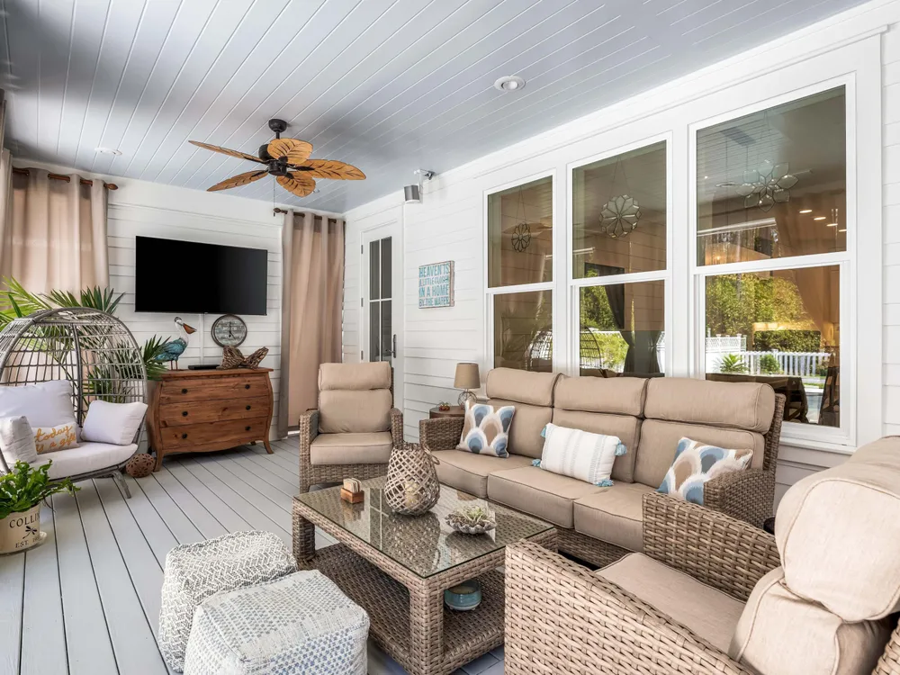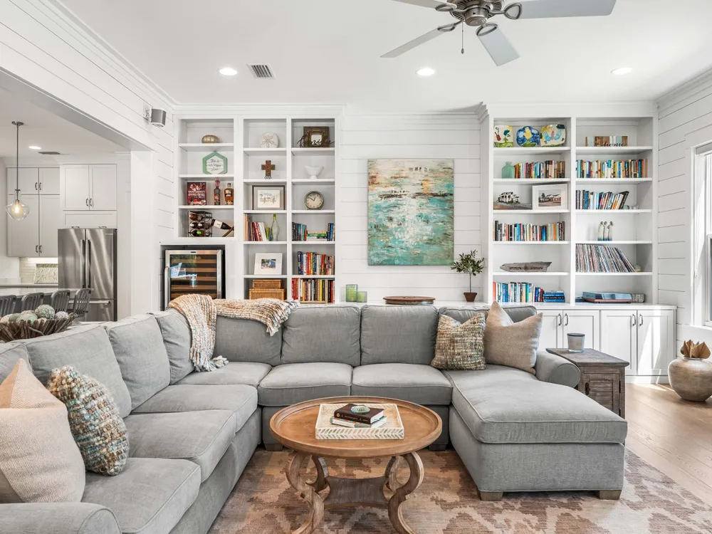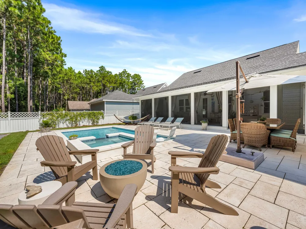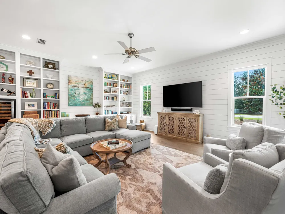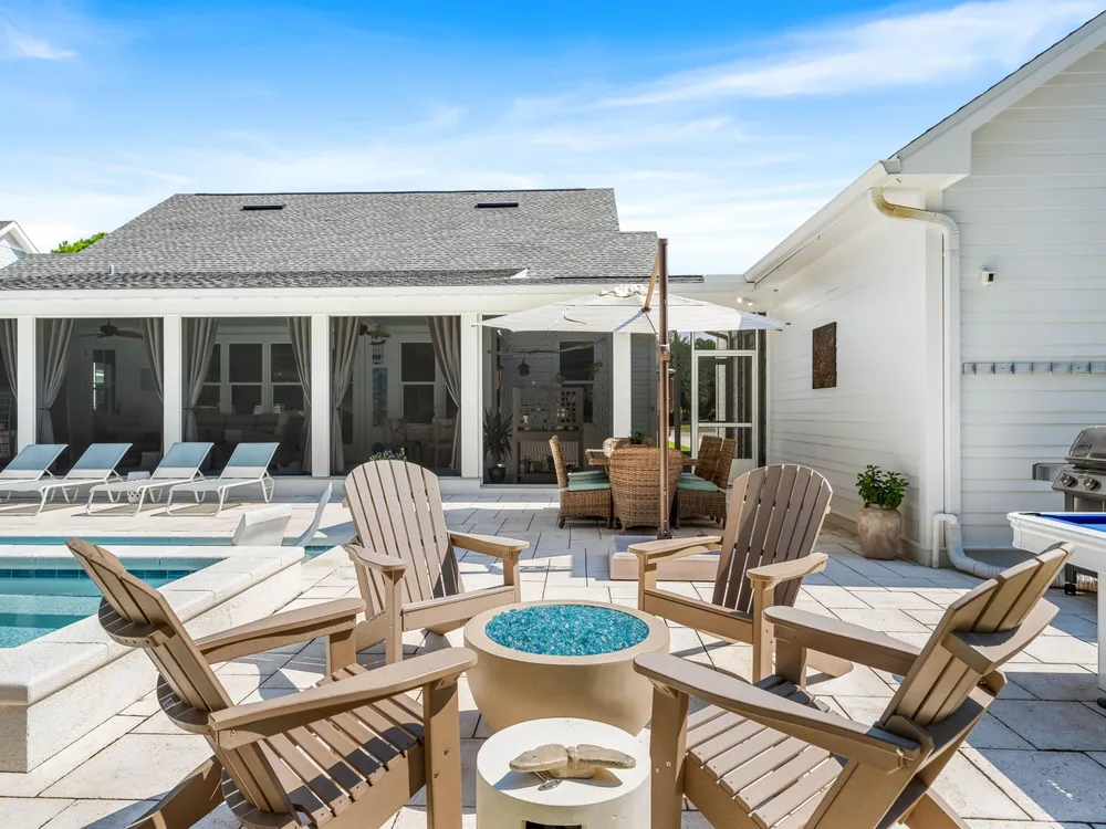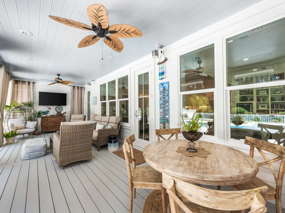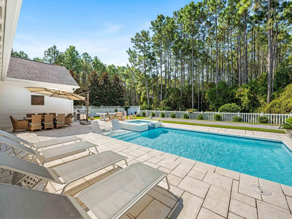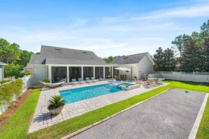 Situated on a spacious corner lot, this charming residence features a private heated pool, spa, fire pit and bocce court providing an idyllic backyard retreat. The immaculate homes sits on an oversized lot and boasts excellent curb appeal and enhanced landscaping. The front walkway leads to a welcoming front porch, inviting guests to relax and unwind.The interior exudes a light and airy ambiance in the open living room, dining and kitchen areas. Shiplap walls, built-in bookcases, medallion wood flooring, ten-foot ceilings, and a beverage/wine refrigerator contribute to the home's unique charm. The kitchen includes a Wolf six-burner stove plus oven and large marble island which is the ideal spot for breakfast gatherings.