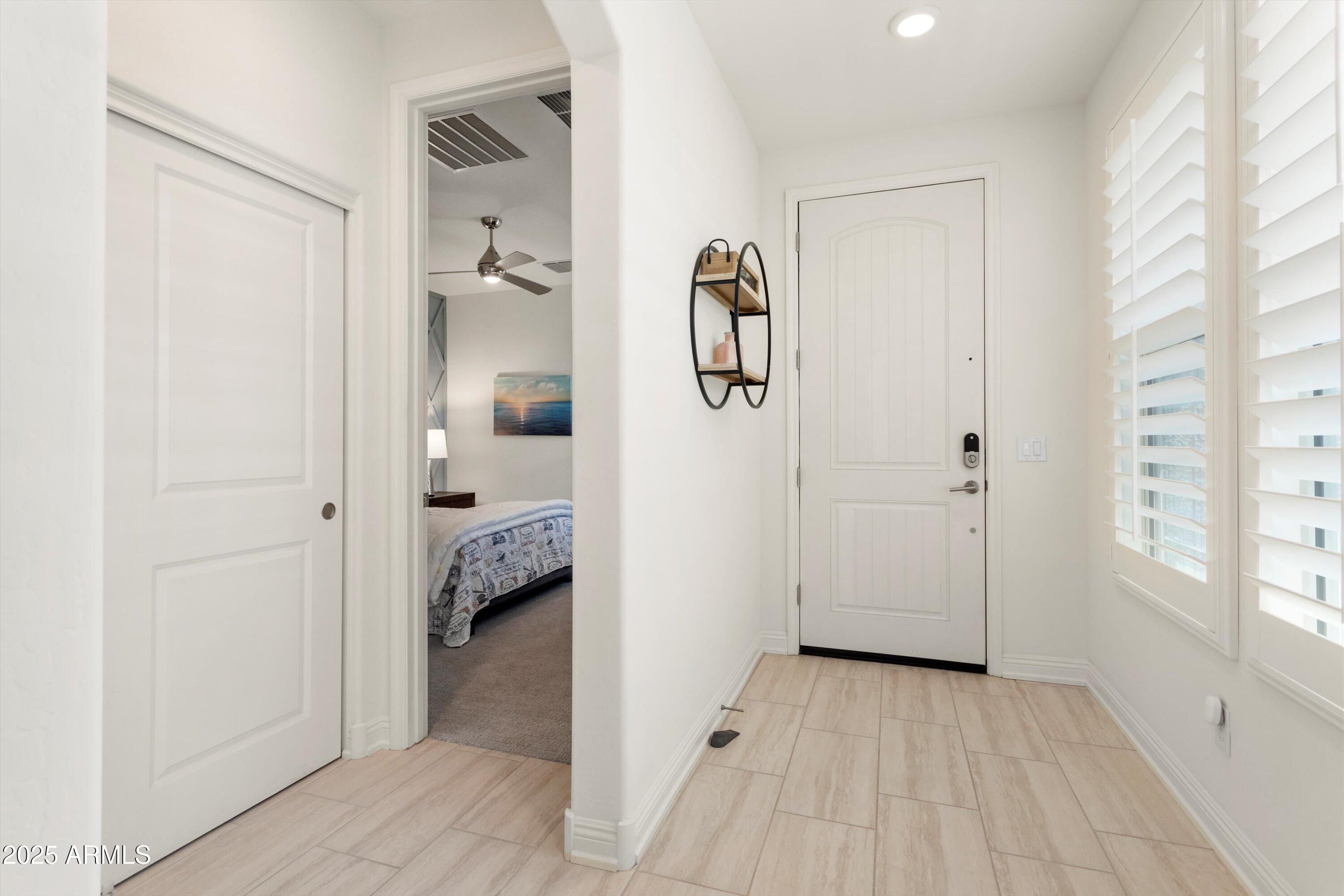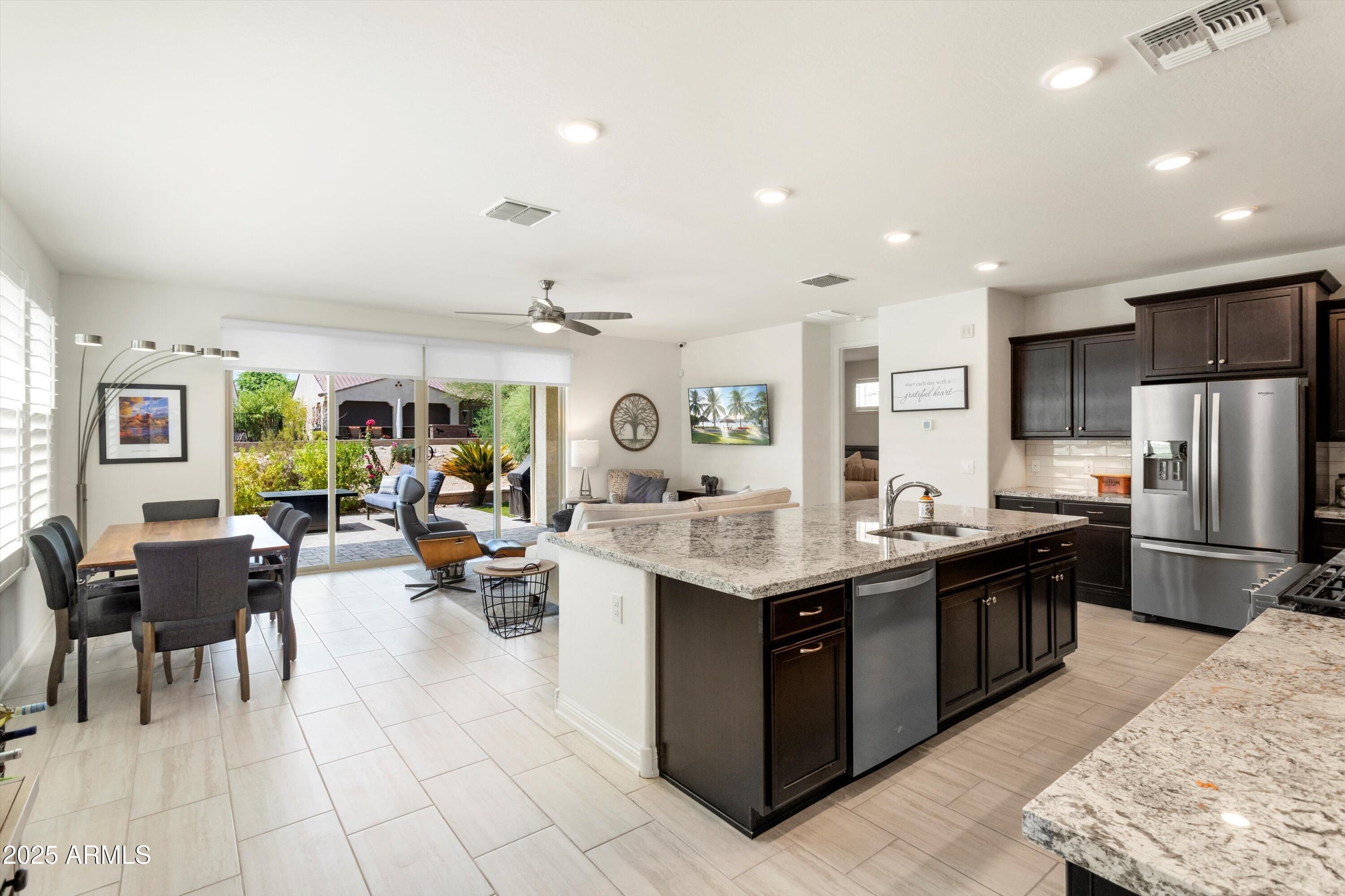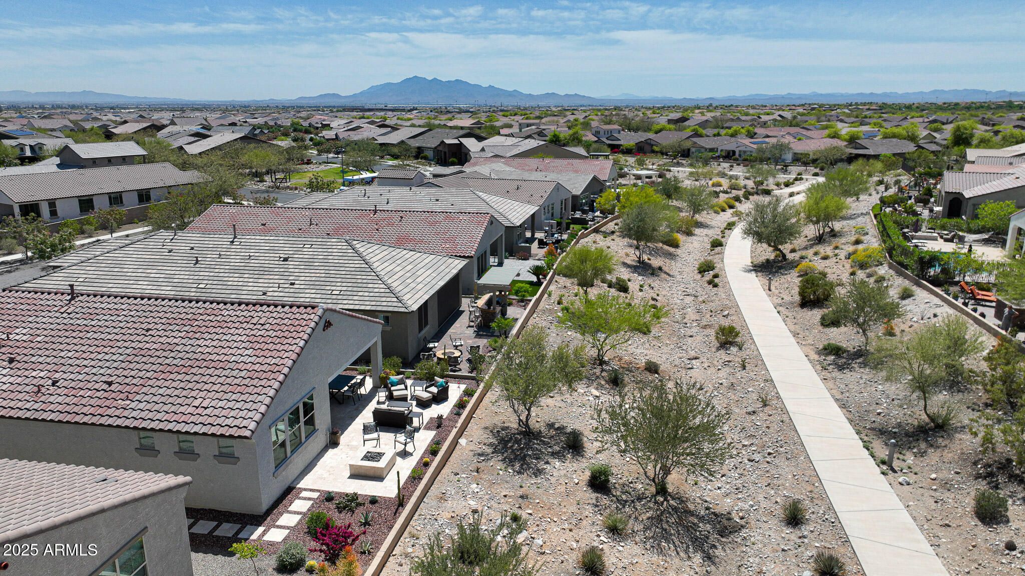 This beautifully maintained home backs to open common space overlooking the lighted walking path and breathtaking mountain views. The interior features upgraded tile, granite countertops, SS appliances, a spacious island, under-cabinet lighting, a large walk-in pantry, and plantation shutters throughout. The guest suite offers its own ensuite and a walk-in closet large enough to double as a flex room. The 3 car tandem garage has epoxy coated flooring. Enjoy outdoor living with a covered patio, extended pavers and a motorized sunscreen—all designed to maximize the mountain views and stunning AZ sunsets.