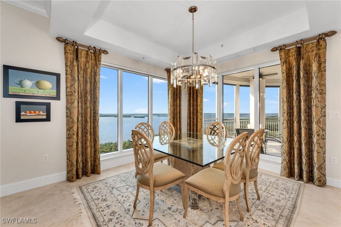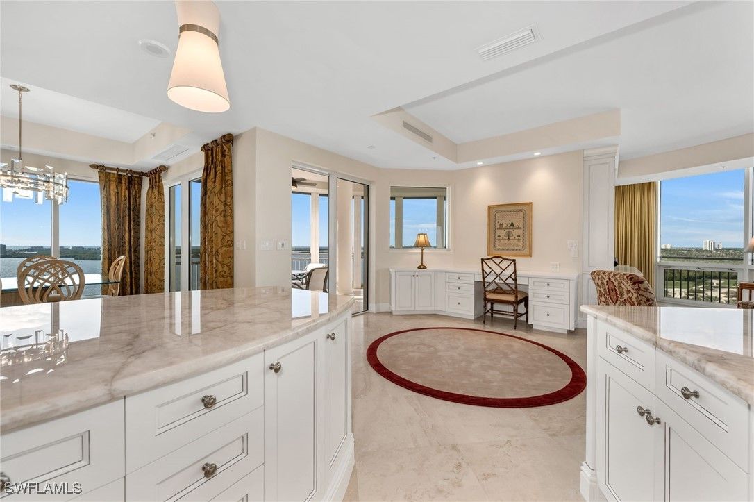 Azure is one of Bonita Bay's finest luxury high-rises situated on a premier site next to Estero Bay Park, one of Bonita Bay’s 4 community parks. This corner high rise residence, with private elevator entry, has three ensuite bathrooms and A PRIVATE ENCLOSED TWO CAR GARAGE. 270-degree floor to ceiling windows, and 10 ft ceilings with floor-to-ceiling windows, provide a light filled living space coupled with panoramic views over the Gulf of Mexico, Estero Bay, and lush green Bonita Bay golf courses. A west facing screened terrace with gas grill creates an ideal place to entertain friends and enjoy the ever-changing dazzling Florida sunsets. Extensive refurbishments in 2022 to the kitchen (with gas stove top), all bathrooms, dry bar, 2 wine coolers, all coordinated by the owner, has modernized this spacious floorplan. Azure offers updated communal areas, live-in manager, two guest suites, theater, fitness center with massage & steam room, club & card rooms, saltwater pool & spa, two fire pits and a covered screened social area with outside grilling. Enjoy sunsets over the Gulf of Mexico on the roof top terrace with TV, bar & grill. Bonita Bay has 3 golf courses onsite and 2 additional golf courses and clubhouse off site, 15 tennis courts, 18,000 sf. fitness center, 8,000 sf. Lifestyle spa and salon, full-service marina with dry and wet slips, Gulf front beach park, 5 restaurants, 15 pickle ball courts, croquet, bocce ball, canoeing, “Life Enrichment Center”, 10+ miles of walking and biking trails and 3 parks.