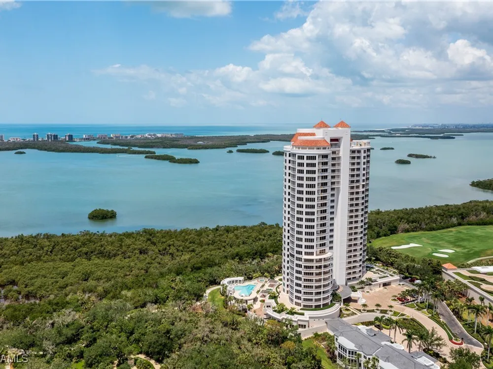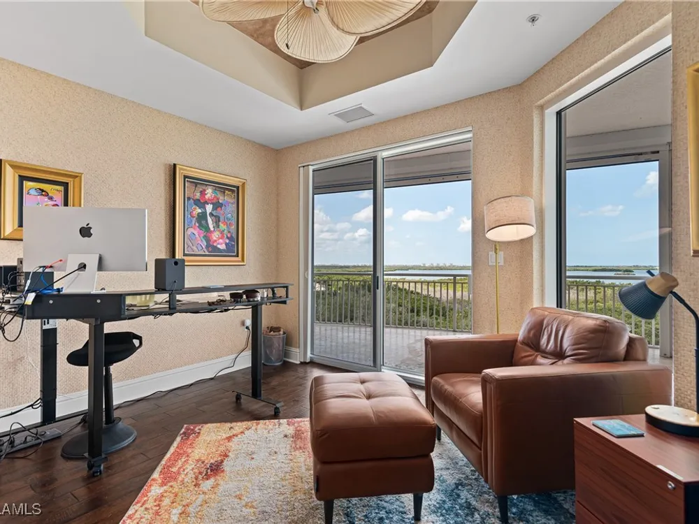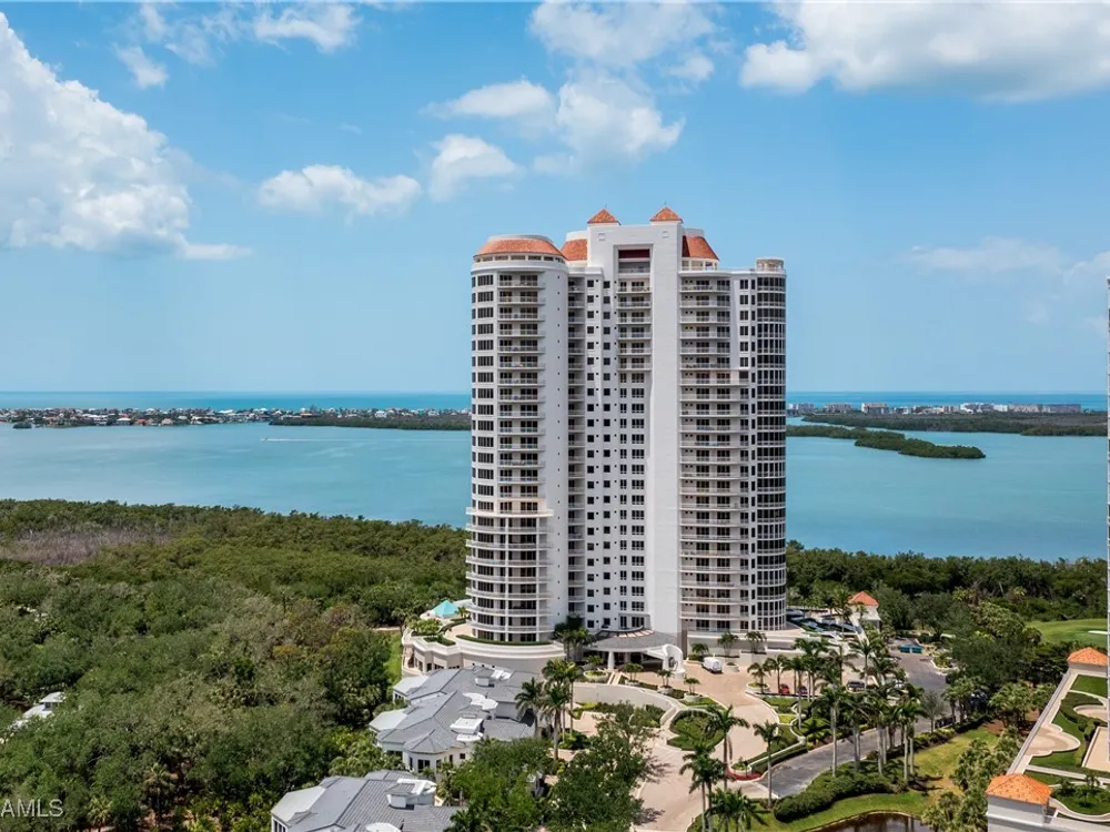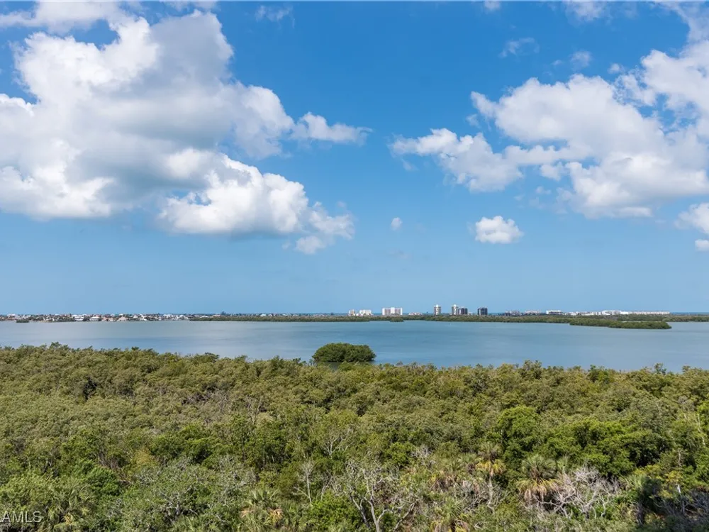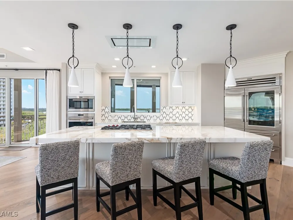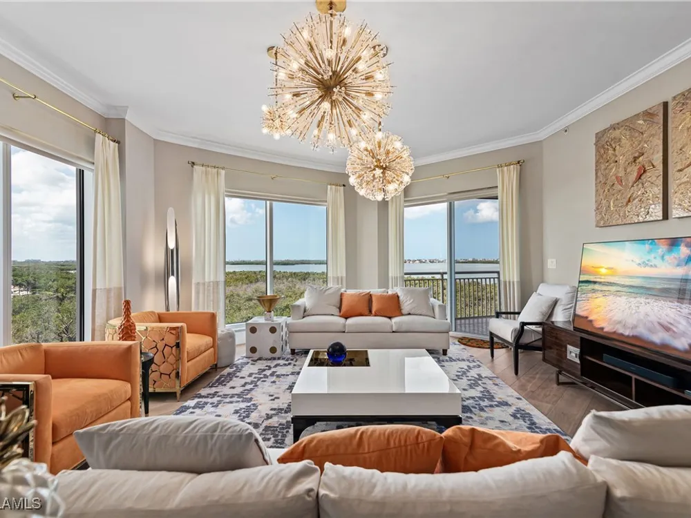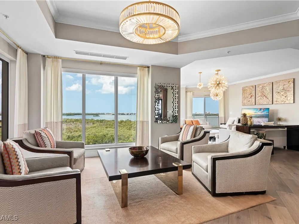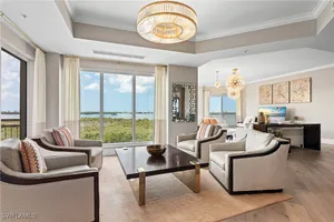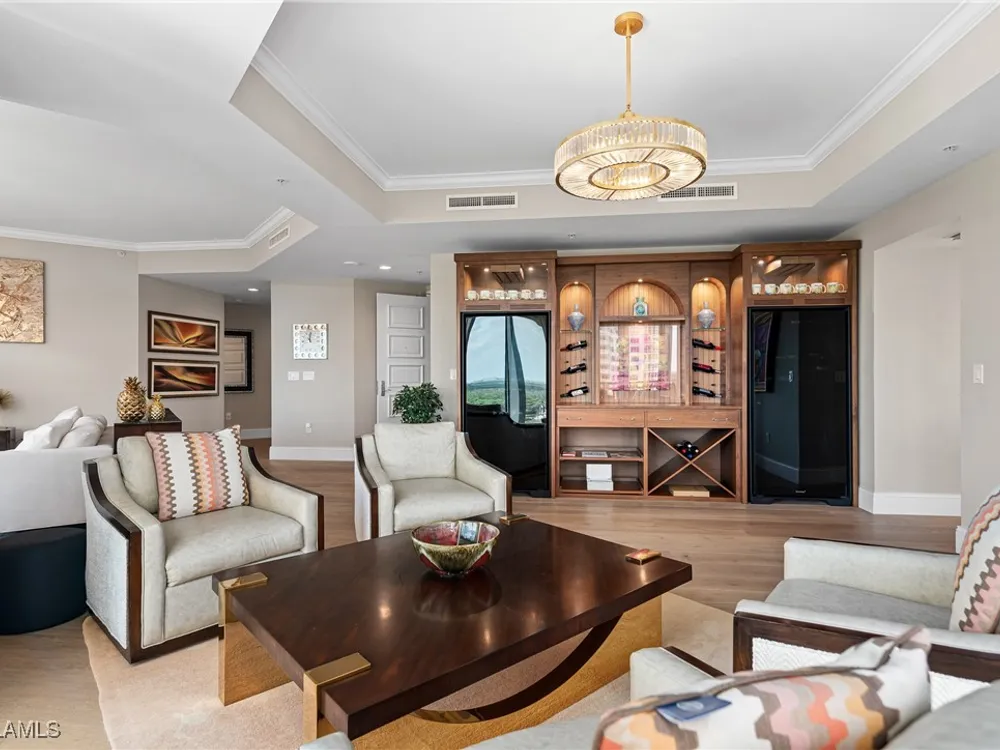 Exceptional, spacious luxury high-rise corner residence in Azure at Bonita Bay with 4,200 sq ft of living space and an additional 1,500 sq ft of outdoor space, with four terraces to entertain and enjoy the stunning 270-degree views of Estero Bay, Little Hickory Island, and the Gulf—sunrise to sunset. This residence is offered professionally decorated and furnished with high-end furniture. Three bedrooms + den, four full baths. A private elevator opens to the grand living and dining area framed by floor-to-ceiling windows. The reimagined kitchen flows into an expansive family room and features a large Italian marble island, Wolf appliances including a gas cooktop, Sub-Zero fridge, and custom cabinetry. The family room includes a custom entertainment center with an electric fireplace, and the dining room offers a custom-built wine bar with a 240-bottle EuroCave wine cellar. This residence is a paradise for entertaining. The primary suite offers a large bedroom, two custom walk-in closets, a luxurious marble-clad bathroom, and a private terrace. Both guest suites have their own terraces and en-suite baths with numerous high-end finishes. Outdoor spaces include covered terraces, a screened terrace with a gas grill, and stunning bay and Gulf views. Updates in 2021: A/C systems (3 zones), water heater, and wood flooring in guest rooms and closets. Stormsmart electric shutters have also been added to the terrace shared by the main bedroom and the den. The two spacious parking spaces under the building and the AC storage are conveniently located near the elevator. Azure amenities include a full-time resident manager, a social room with a catering kitchen, guest suites, card and billiard rooms, a fitness center, a movie theater, a pool and spa, two fire pits, a pavilion with a fireplace, and a 26th-floor rooftop terrace with a BBQ and panoramic views. Azure is adjacent to Bonita Bay Park, which offers a fishing pier overlooking Estero Bay. Bonita Bay also offers five golf courses, a magnificent clubhouse, six restaurants, 18 tennis courts, pickleball, a beach park, a 18,000-square-foot fitness center and spa, and a full-service marina.