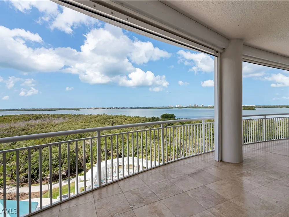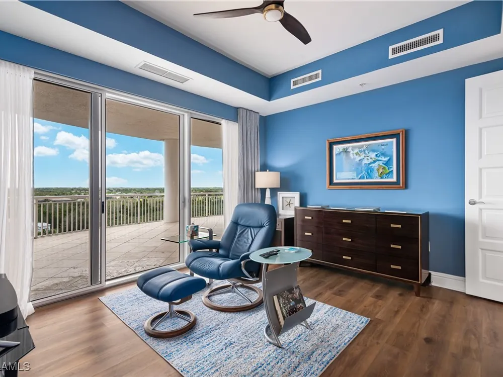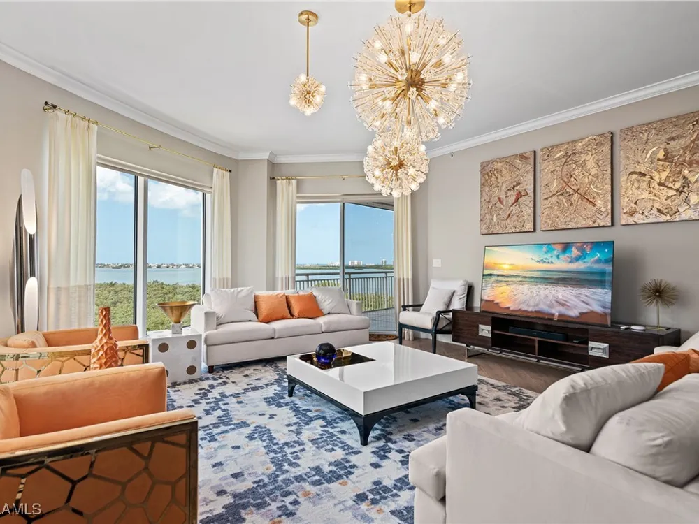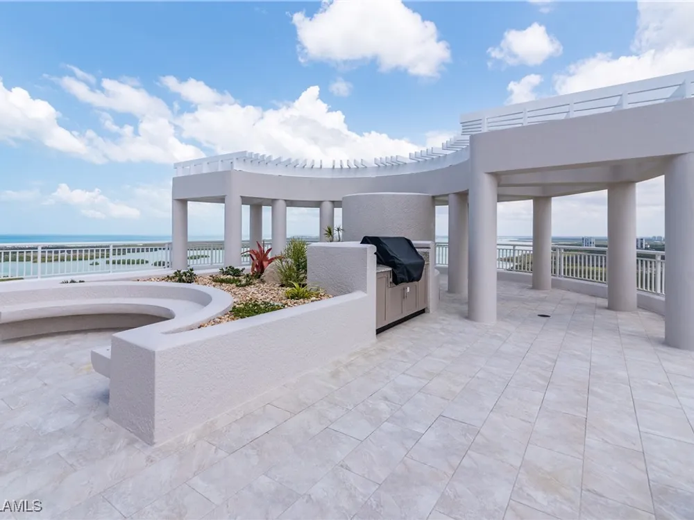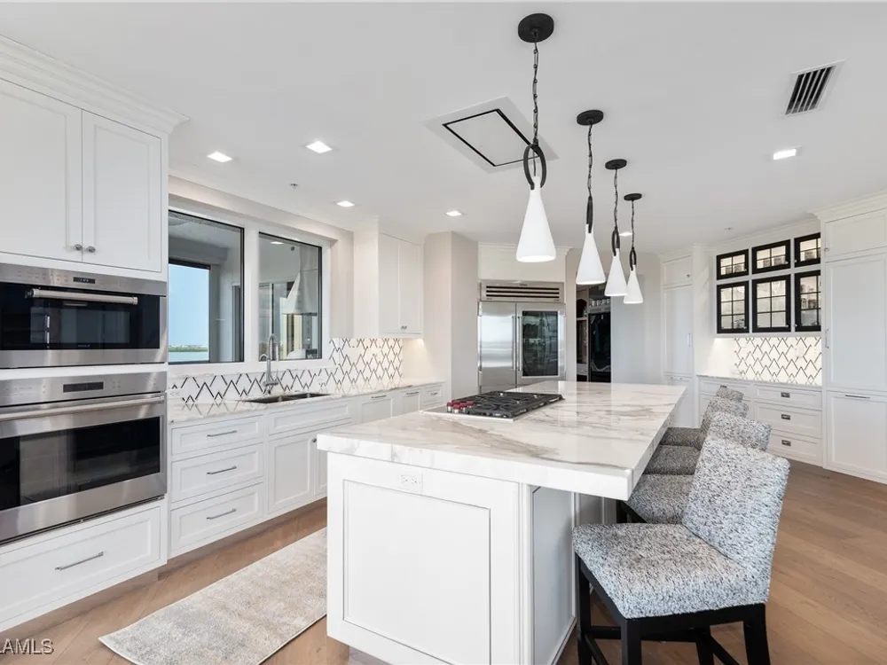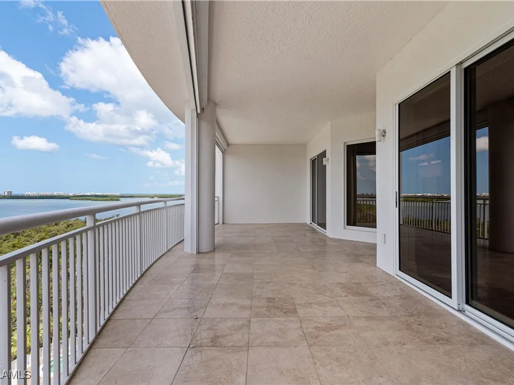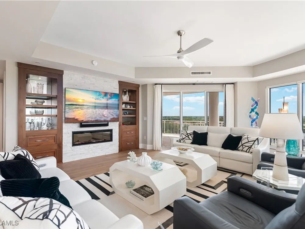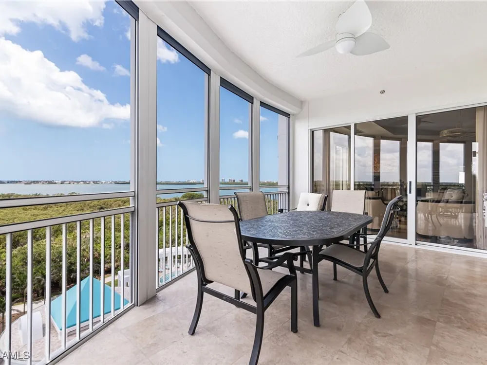 Exceptional, spacious luxury high-rise corner residence in Azure at Bonita Bay with 4,200 sq ft of living space and an additional 1,500 sq ft of outdoor space, with four terraces to entertain and enjoy the stunning 270-degree views of Estero Bay, Little Hickory Island, and the Gulf—sunrise to sunset. This residence is offered professionally decorated and furnished with high-end furniture. Three bedrooms + den, four full baths. A private elevator opens to the grand living and dining area framed by floor-to-ceiling windows. The reimagined kitchen flows into an expansive family room and features a large Italian marble island, Wolf appliances including a gas cooktop, Sub-Zero fridge, and custom cabinetry. The family room includes a custom entertainment center with an electric fireplace, and the dining room offers a custom-built wine bar with a 240-bottle EuroCave wine cellar. This residence is a paradise for entertaining. The primary suite offers a large bedroom, two custom walk-in closets, a luxurious marble-clad bathroom, and a private terrace. Both guest suites have their own terraces and en-suite baths with numerous high-end finishes. Outdoor spaces include covered terraces, a screened terrace with a gas grill, and stunning bay and Gulf views. Updates in 2021: A/C systems (3 zones), water heater, and wood flooring in guest rooms and closets. Stormsmart electric shutters have also been added to the terrace shared by the main bedroom and the den. The two spacious parking spaces under the building and the AC storage are conveniently located near the elevator. Azure amenities include a full-time resident manager, a social room with a catering kitchen, guest suites, card and billiard rooms, a fitness center, a movie theater, a pool and spa, two fire pits, a pavilion with a fireplace, and a 26th-floor rooftop terrace with a BBQ and panoramic views. Azure is adjacent to Bonita Bay Park, which offers a fishing pier overlooking Estero Bay. Bonita Bay also offers five golf courses, a magnificent clubhouse, six restaurants, 18 tennis courts, pickleball, a beach park, a 18,000-square-foot fitness center and spa, and a full-service marina.
