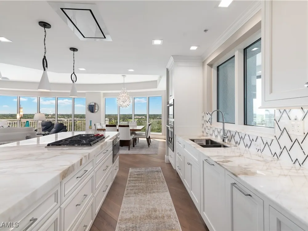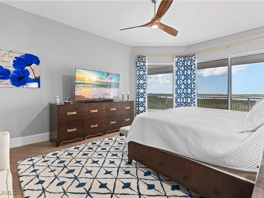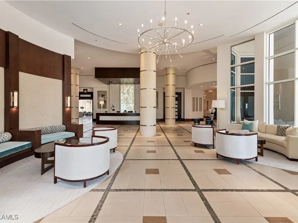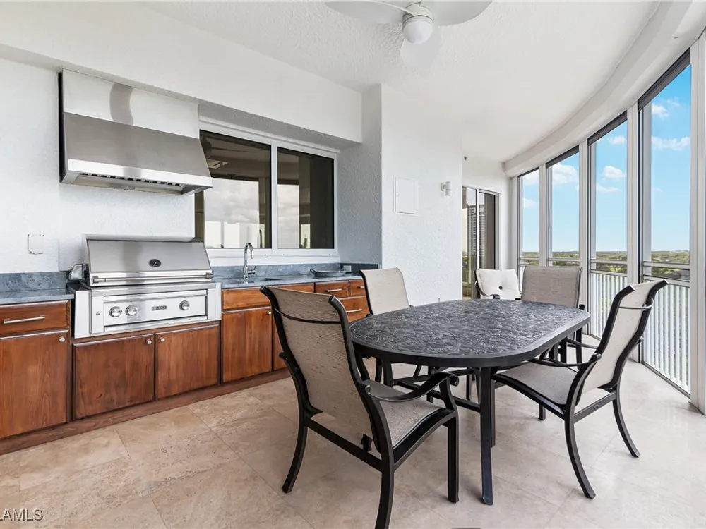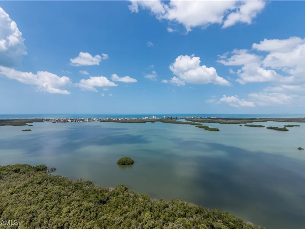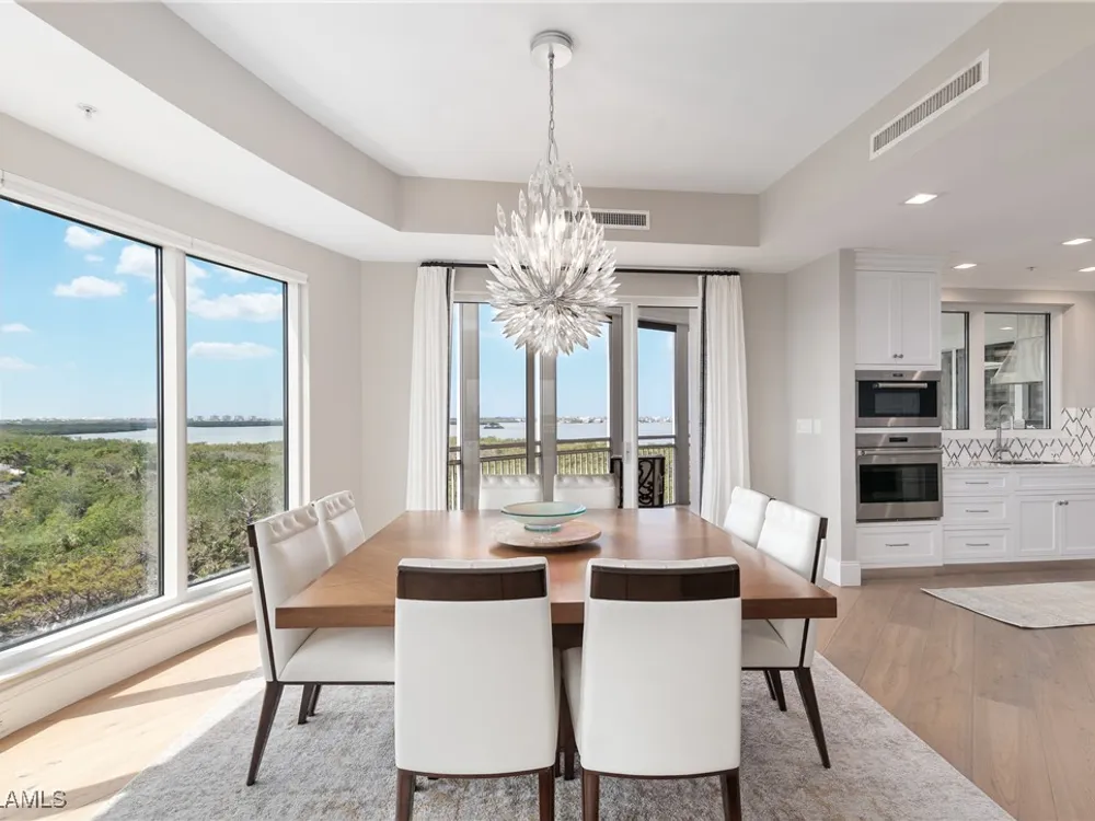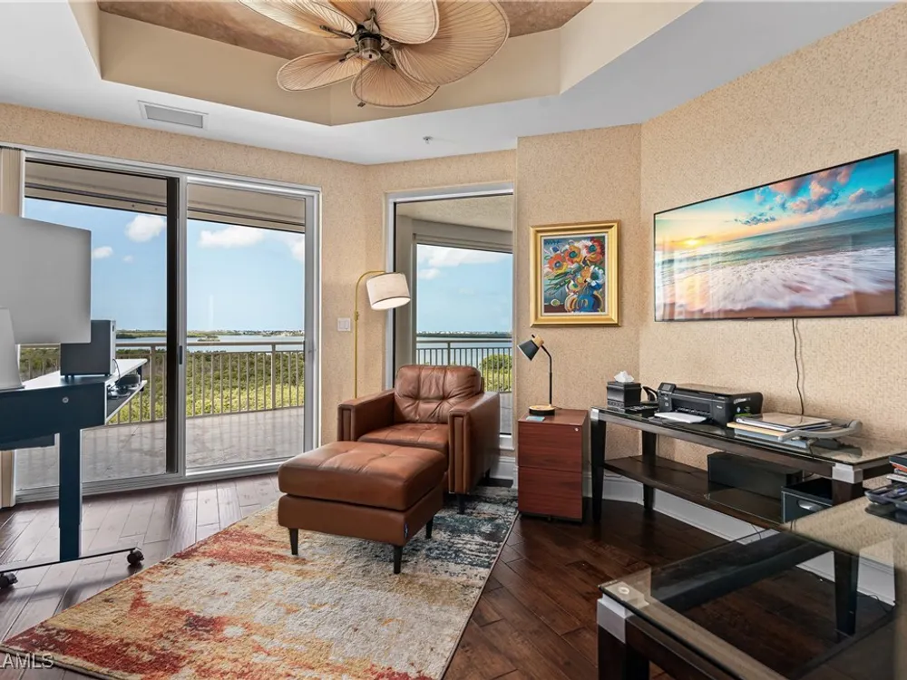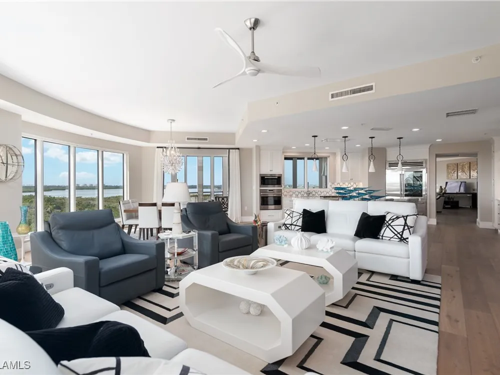 Exceptional, spacious luxury high-rise corner residence in Azure at Bonita Bay with 4,200 sq ft of living space and an additional 1,500 sq ft of outdoor space, with four terraces to entertain and enjoy the stunning 270-degree views of Estero Bay, Little Hickory Island, and the Gulf—sunrise to sunset. This residence is offered professionally decorated and furnished with high-end furniture. Three bedrooms + den, four full baths. A private elevator opens to the grand living and dining area framed by floor-to-ceiling windows. The reimagined kitchen flows into an expansive family room and features a large Italian marble island, Wolf appliances including a gas cooktop, Sub-Zero fridge, and custom cabinetry. The family room includes a custom entertainment center with an electric fireplace, and the dining room offers a custom-built wine bar with a 240-bottle EuroCave wine cellar. This residence is a paradise for entertaining. The primary suite offers a large bedroom, two custom walk-in closets, a luxurious marble-clad bathroom, and a private terrace. Both guest suites have their own terraces and en-suite baths with numerous high-end finishes. Outdoor spaces include covered terraces, a screened terrace with a gas grill, and stunning bay and Gulf views. Updates in 2021: A/C systems (3 zones), water heater, and wood flooring in guest rooms and closets. Stormsmart electric shutters have also been added to the terrace shared by the main bedroom and the den. The two spacious parking spaces under the building and the AC storage are conveniently located near the elevator. Azure amenities include a full-time resident manager, a social room with a catering kitchen, guest suites, card and billiard rooms, a fitness center, a movie theater, a pool and spa, two fire pits, a pavilion with a fireplace, and a 26th-floor rooftop terrace with a BBQ and panoramic views. Azure is adjacent to Bonita Bay Park, which offers a fishing pier overlooking Estero Bay. Bonita Bay also offers five golf courses, a magnificent clubhouse, six restaurants, 18 tennis courts, pickleball, a beach park, a 18,000-square-foot fitness center and spa, and a full-service marina.