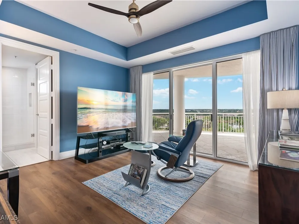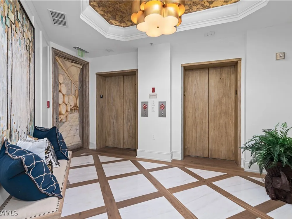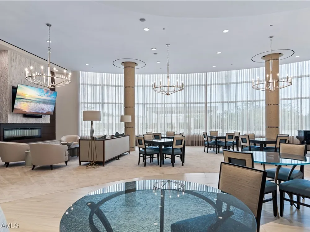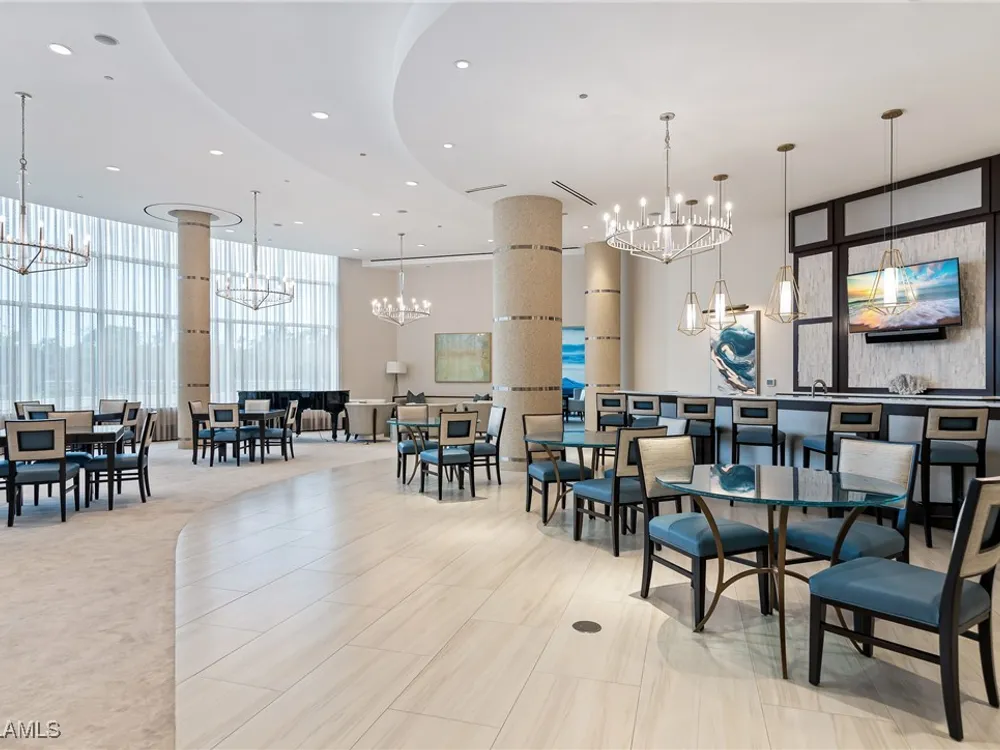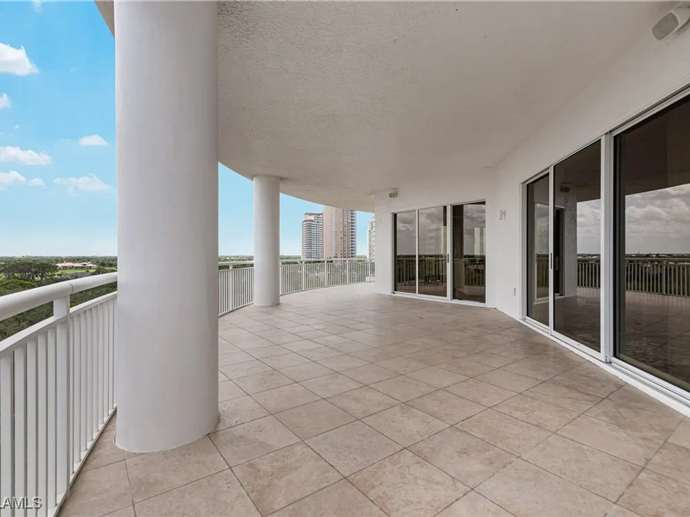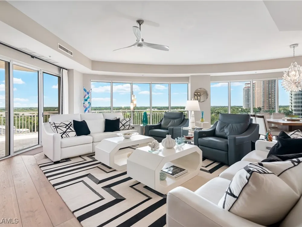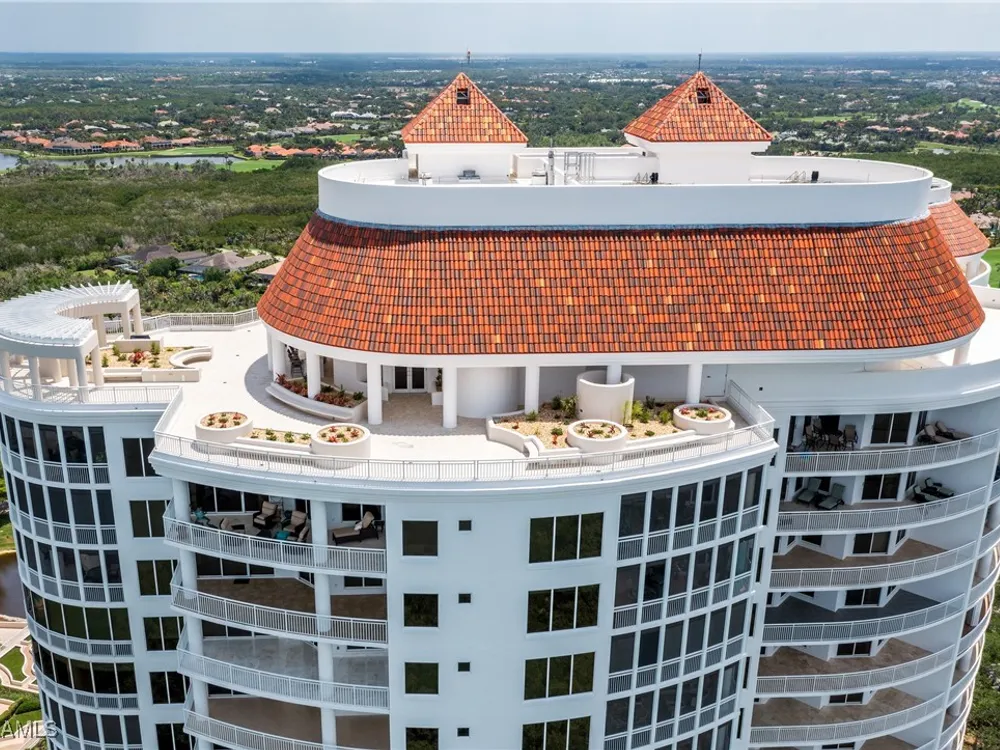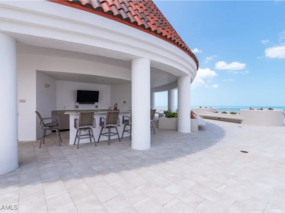 Exceptional, spacious luxury high-rise corner residence in Azure at Bonita Bay with 4,200 sq ft of living space and an additional 1,500 sq ft of outdoor space, with four terraces to entertain and enjoy the stunning 270-degree views of Estero Bay, Little Hickory Island, and the Gulf—sunrise to sunset. This residence is offered professionally decorated and furnished with high-end furniture. Three bedrooms + den, four full baths. A private elevator opens to the grand living and dining area framed by floor-to-ceiling windows. The reimagined kitchen flows into an expansive family room and features a large Italian marble island, Wolf appliances including a gas cooktop, Sub-Zero fridge, and custom cabinetry. The family room includes a custom entertainment center with an electric fireplace, and the dining room offers a custom-built wine bar with a 240-bottle EuroCave wine cellar. This residence is a paradise for entertaining. The primary suite offers a large bedroom, two custom walk-in closets, a luxurious marble-clad bathroom, and a private terrace. Both guest suites have their own terraces and en-suite baths with numerous high-end finishes. Outdoor spaces include covered terraces, a screened terrace with a gas grill, and stunning bay and Gulf views. Updates in 2021: A/C systems (3 zones), water heater, and wood flooring in guest rooms and closets. Stormsmart electric shutters have also been added to the terrace shared by the main bedroom and the den. The two spacious parking spaces under the building and the AC storage are conveniently located near the elevator. Azure amenities include a full-time resident manager, a social room with a catering kitchen, guest suites, card and billiard rooms, a fitness center, a movie theater, a pool and spa, two fire pits, a pavilion with a fireplace, and a 26th-floor rooftop terrace with a BBQ and panoramic views. Azure is adjacent to Bonita Bay Park, which offers a fishing pier overlooking Estero Bay. Bonita Bay also offers five golf courses, a magnificent clubhouse, six restaurants, 18 tennis courts, pickleball, a beach park, a 18,000-square-foot fitness center and spa, and a full-service marina.