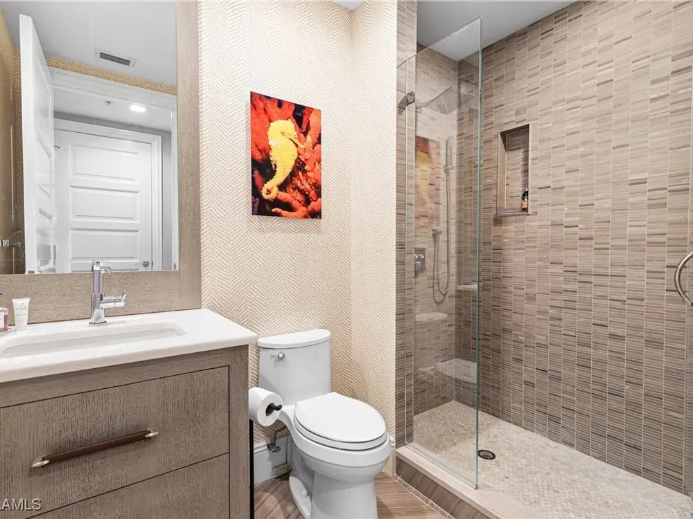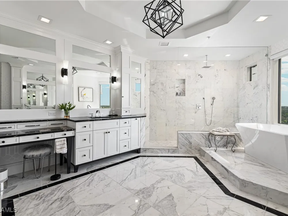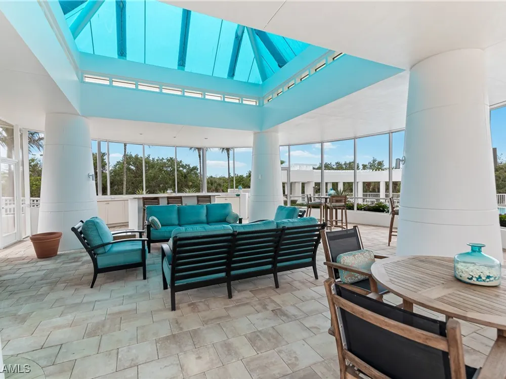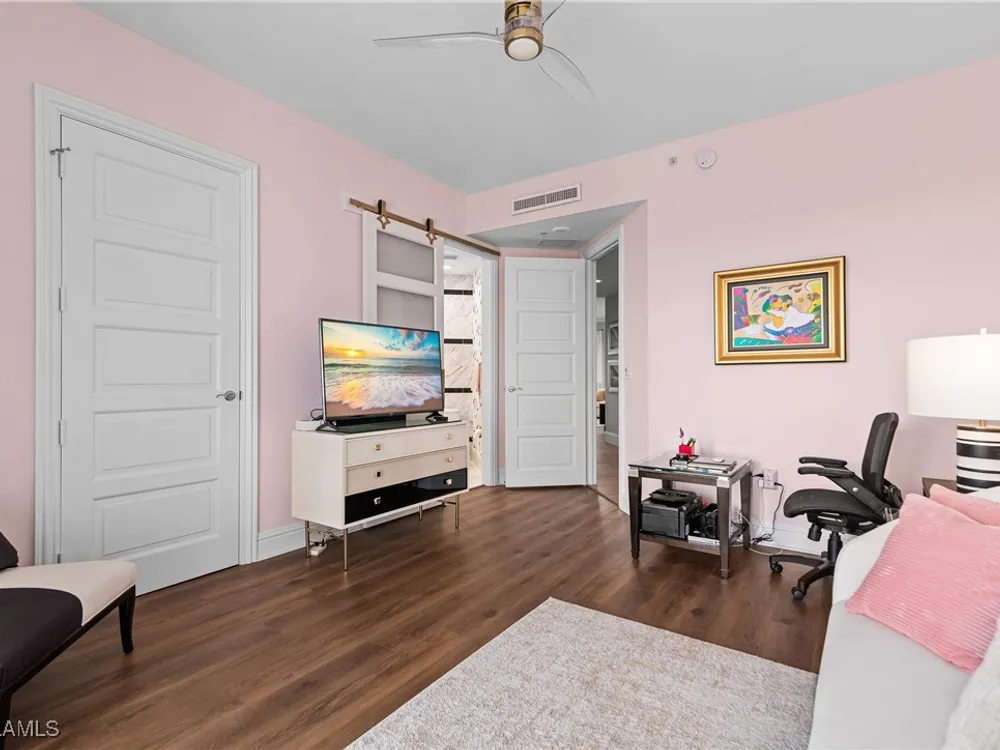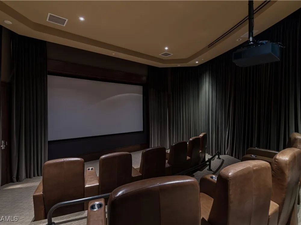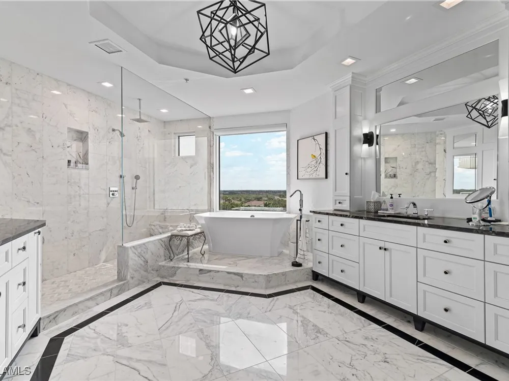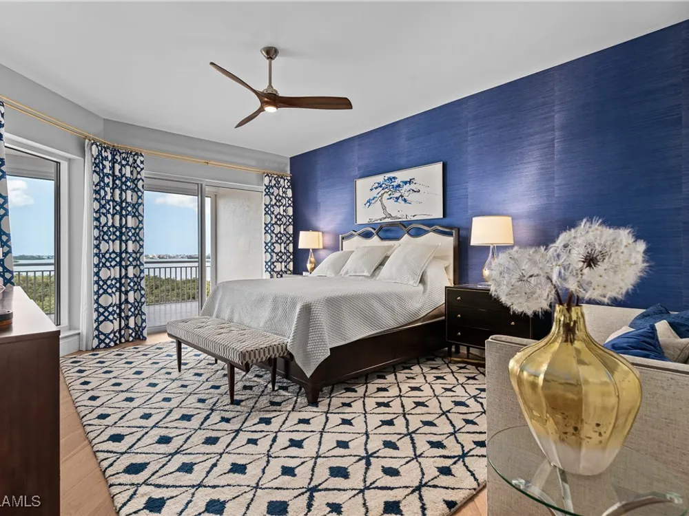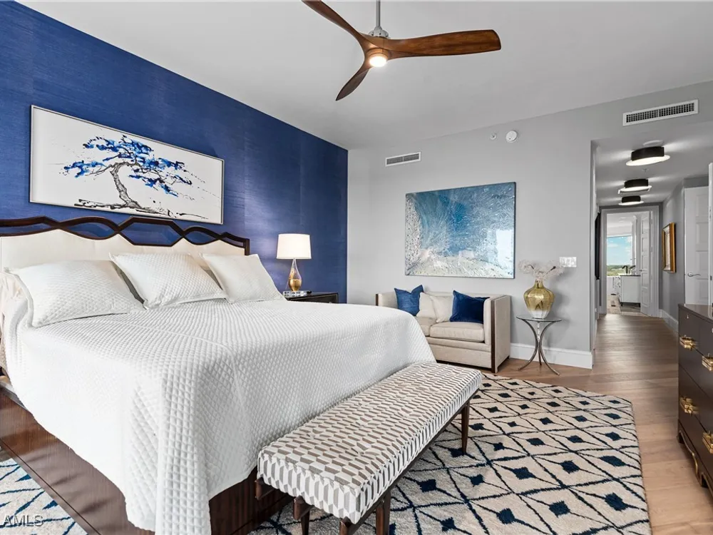 Exceptional, spacious luxury high-rise corner residence in Azure at Bonita Bay with 4,200 sq ft of living space and an additional 1,500 sq ft of outdoor space, with four terraces to entertain and enjoy the stunning 270-degree views of Estero Bay, Little Hickory Island, and the Gulf—sunrise to sunset. This residence is offered professionally decorated and furnished with high-end furniture. Three bedrooms + den, four full baths. A private elevator opens to the grand living and dining area framed by floor-to-ceiling windows. The reimagined kitchen flows into an expansive family room and features a large Italian marble island, Wolf appliances including a gas cooktop, Sub-Zero fridge, and custom cabinetry. The family room includes a custom entertainment center with an electric fireplace, and the dining room offers a custom-built wine bar with a 240-bottle EuroCave wine cellar. This residence is a paradise for entertaining. The primary suite offers a large bedroom, two custom walk-in closets, a luxurious marble-clad bathroom, and a private terrace. Both guest suites have their own terraces and en-suite baths with numerous high-end finishes. Outdoor spaces include covered terraces, a screened terrace with a gas grill, and stunning bay and Gulf views. Updates in 2021: A/C systems (3 zones), water heater, and wood flooring in guest rooms and closets. Stormsmart electric shutters have also been added to the terrace shared by the main bedroom and the den. The two spacious parking spaces under the building and the AC storage are conveniently located near the elevator. Azure amenities include a full-time resident manager, a social room with a catering kitchen, guest suites, card and billiard rooms, a fitness center, a movie theater, a pool and spa, two fire pits, a pavilion with a fireplace, and a 26th-floor rooftop terrace with a BBQ and panoramic views. Azure is adjacent to Bonita Bay Park, which offers a fishing pier overlooking Estero Bay. Bonita Bay also offers five golf courses, a magnificent clubhouse, six restaurants, 18 tennis courts, pickleball, a beach park, a 18,000-square-foot fitness center and spa, and a full-service marina.