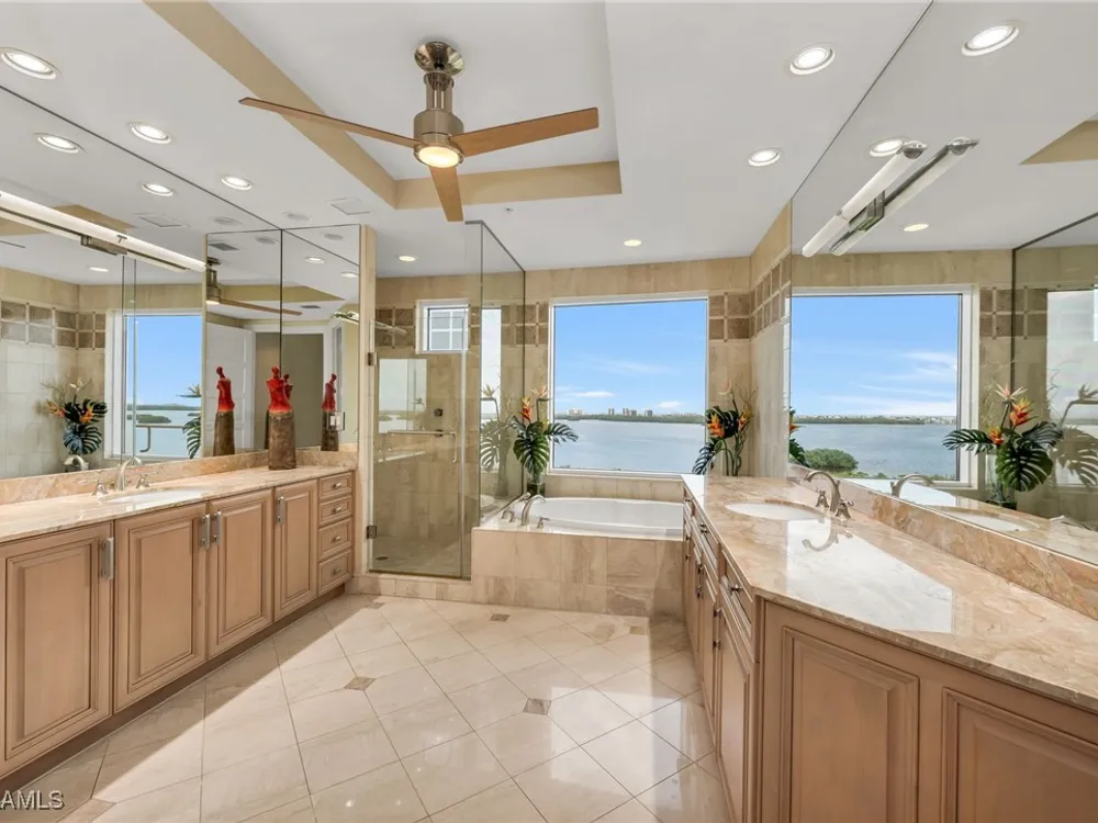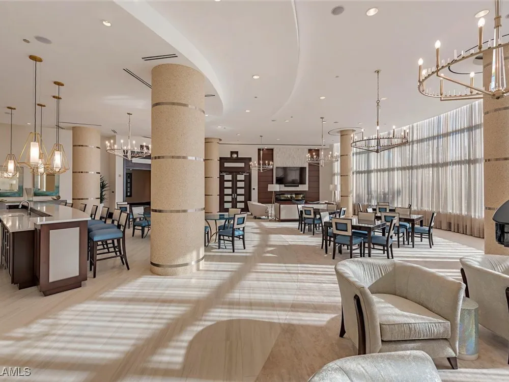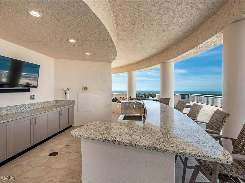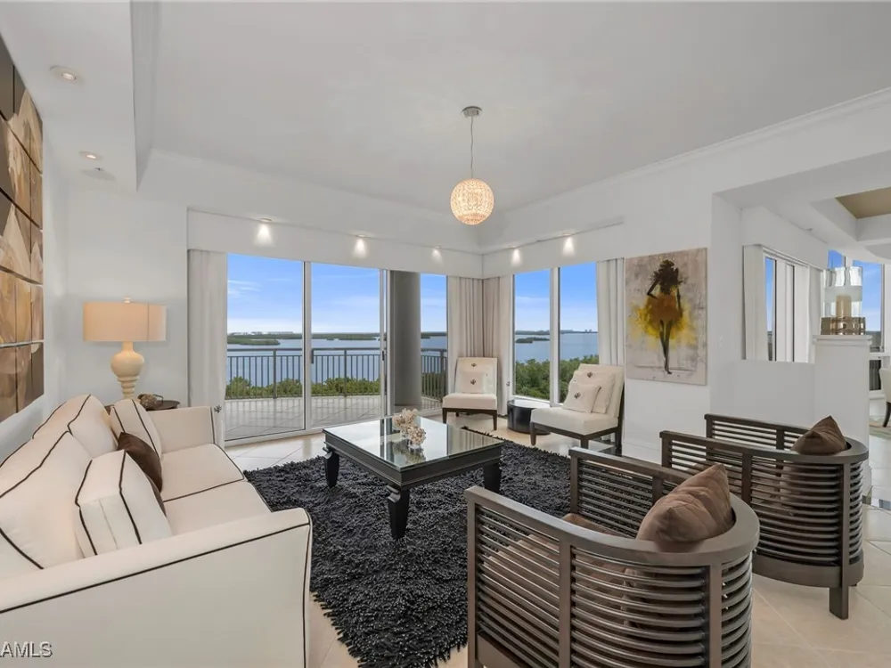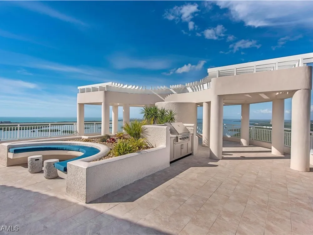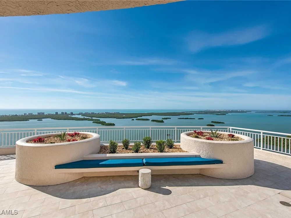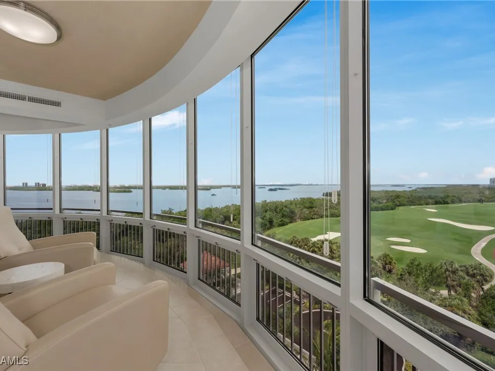 Azure is one of Bonita Bay's finest luxury high-rises situated on a premier site next to Estero Bay Park. This corner residence with 3 ensuite bathrooms, with 2 built-out walk in closets, plus den and has a beautifully appointed private elevator entry foyer. 270-degree floor to ceiling windows provide views of sunrise and sunsets over the gulf, bay, lake, and golf courses. This spacious floor plan with 10’ ceilings and chef's kitchen with gas stove top, makes entertaining friends and family a pleasure. Superb finishes typical of this price range were selected and coordinated by the owner. PRIVATE ENCLOSED TWO CAR GARAGE. Azure offers updated communal areas, live-in manager, 2 guest suites, fitness & massage room, club & card room. saltwater pool, spa, two fire pits, covered screened social area with outside grilling. Bonita Bay has 5 golf courses, 18 court tennis, 18,000 sf. fitness, 8,000 sf. Lifestyle spa & salon, full-service marina, Gulf front beach park, 5 restaurants, 10 pickle ball courts, crochet, bocce ball, canoeing, Life Enrichment Center & 3 parks.