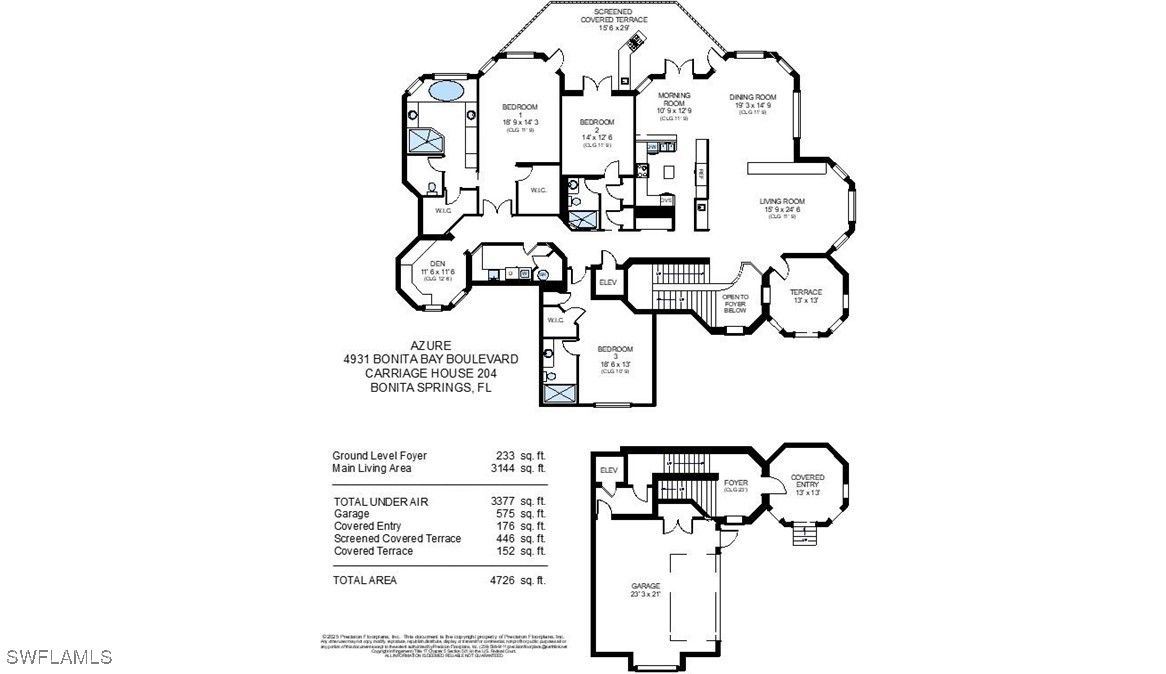 Welcome to this spacious 2nd floor, 3-bedroom with den, carriage home which is part of the Azure high-rise condominium that includes many luxury amenities. Enjoy the rooftop terrace with gas grill overlooking the Estero Bay and the Gulf of Mexico, media theater, fitness room, saltwater swimming pool and billiards room. There is live-in management and a staff of six that support this extraordinary and exclusive lifestyle that allows you to lock and leave with confidence. A new roof and exterior paint in 2024/5 together with the addition of new LED carriage lights makes the street view most appealing. This home has a large private south-facing screened and shuttered terrace with summer kitchen and built in gas grill overlooking the Estero Bay Park. The residence elevator is being replaced with the newest technology, with no expense spared. The 12' ceiling height throughout and built-in fresh air system coupled with recently replaced AC units provide a comfortable living environment. The large kitchen has a gas stove top and new appliances. This is a unique carriage home that has the benefits of a luxury high rise with the privacy of an individual home. Azure offers a fitness center, theater, billiard room, pool & spa with gas grills, screened poolside cabana with bar & fireplace, 2 guest suites, full-time resident manager, and a rooftop terrace with bar & grills. Bonita Bay has 5 golf courses, 18 court tennis center, 18,000 sf. fitness center, 8,000 sf. Lifestyle spa & salon, full-service marina, Gulf front beach park, 6 restaurants, 8 pickle ball courts, croquet, bocce ball, canoeing, life enrichment center, 3 parks, & much more.