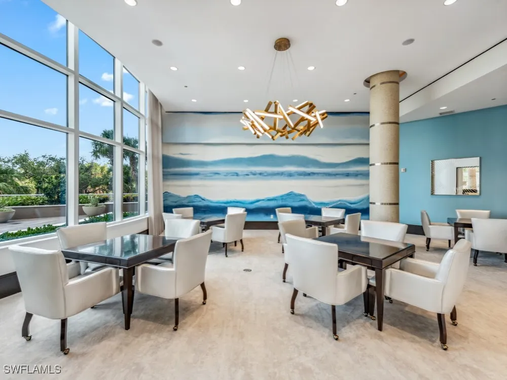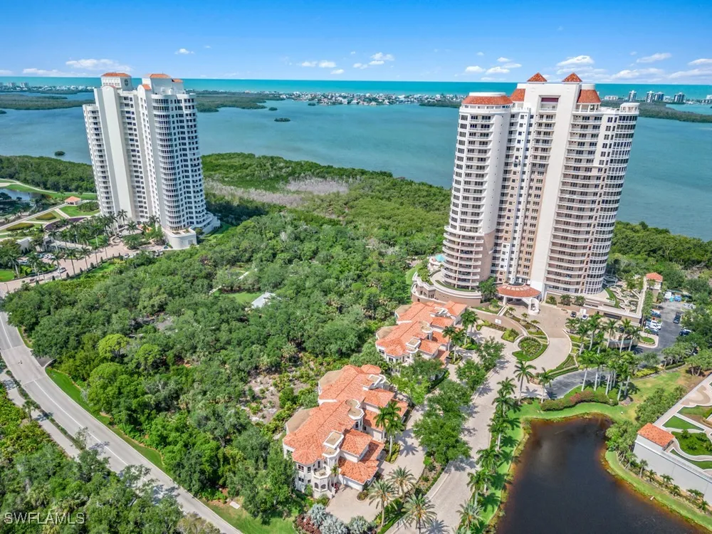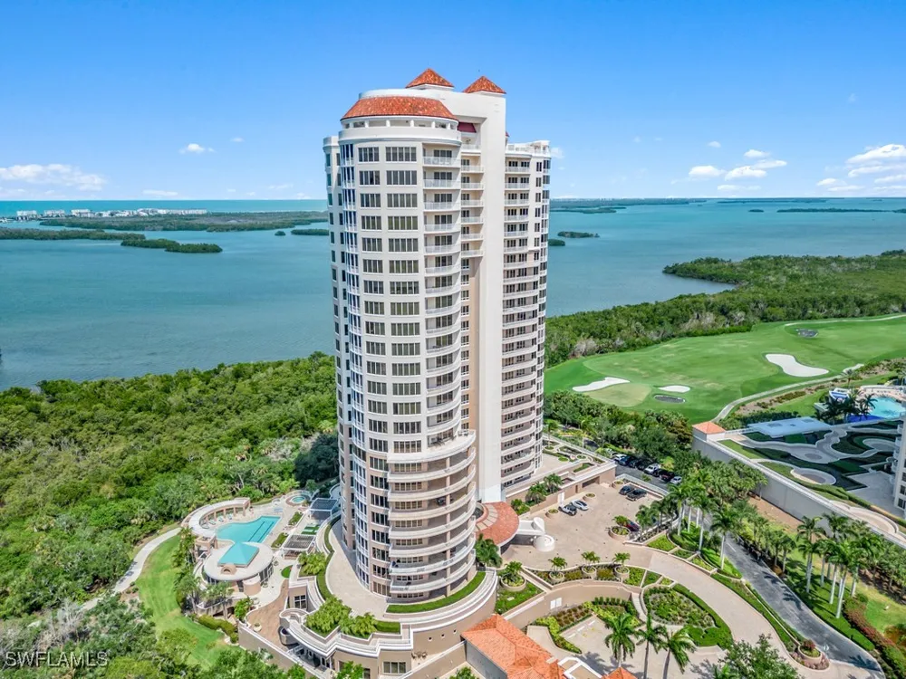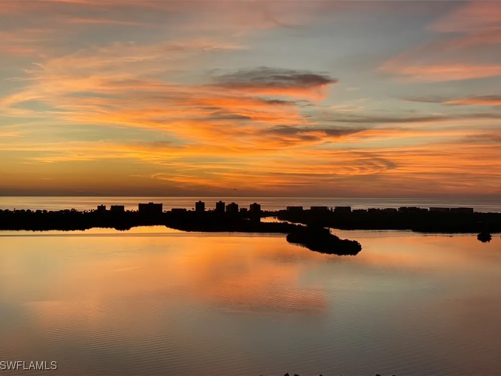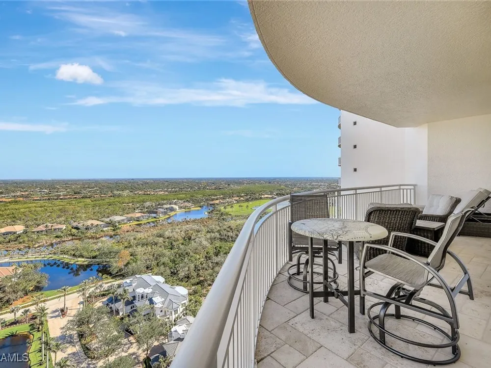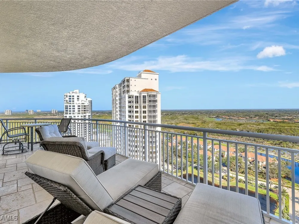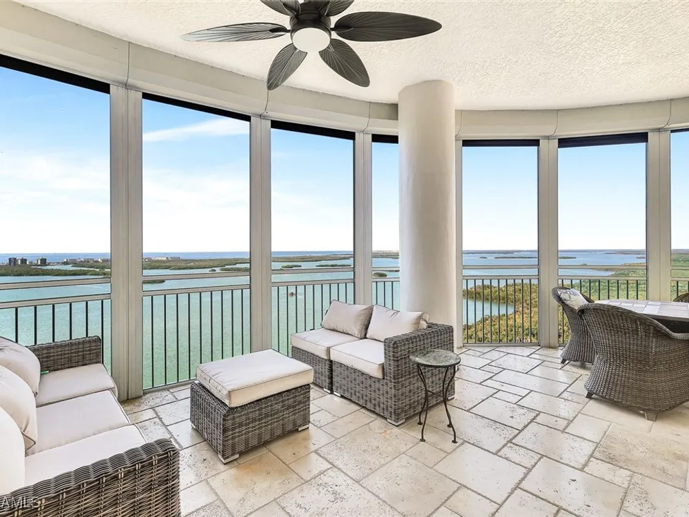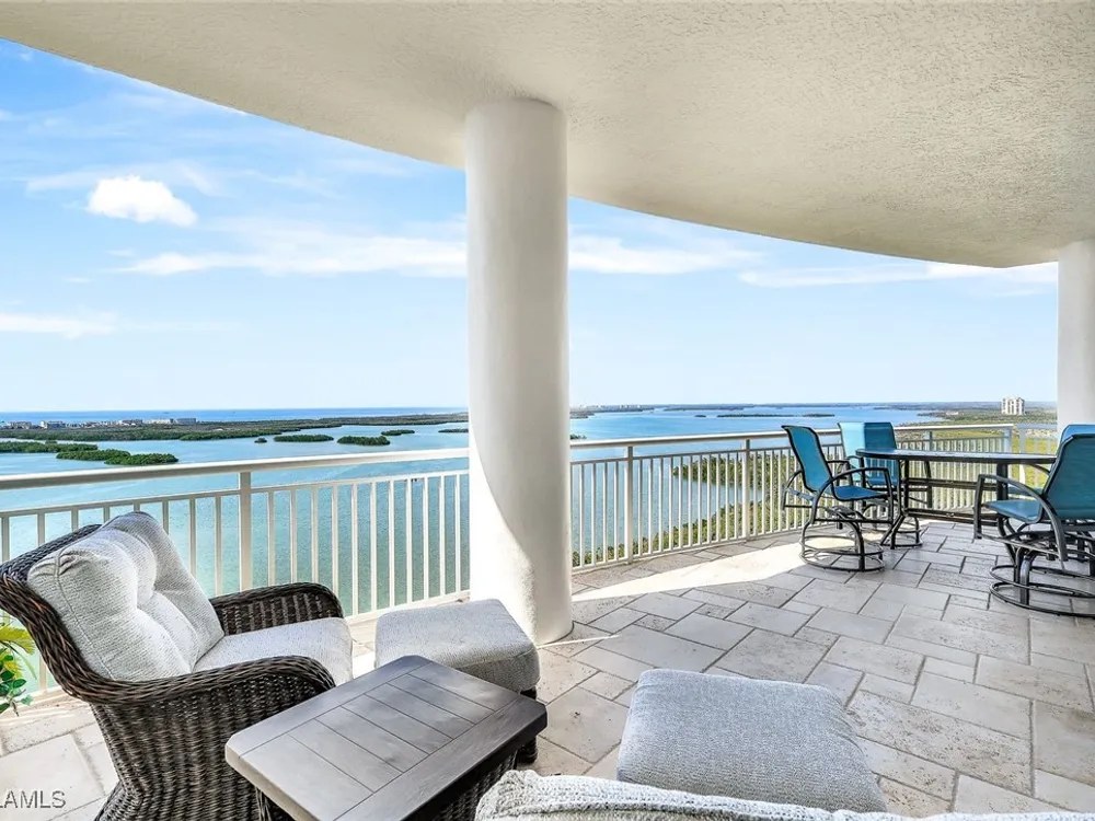 Beautifully updated and furnished, with breath-taking panoramic views and ready to move in! Tastefully updated luxury condo end unit on the 21st floor of Azure in Bonita Bay. Dramatic sunset views over Estero Bay and the Gulf. 2 large open terraces plus screened lanai with gas grill. Make sure that you see the photos! Lovely formal living room with electric fireplace. Living room opens to large West facing terrace. Formal dining room & separate breakfast/informal dining area. The elevator goes directly to the entry foyer of your home. Spacious primary bedroom with large bath and 2 walk-in closets. 2 more guest bedrooms both with an en suite bath. Gourmet kitchen with GE Café appliances (gas cooktop) and quartz countertops. Separate large kitchen island with wine/beverage refrigerator. Kitchen opens to expansive family room. California closets in all the bedrooms. SONOS sound system throughout. This unit includes 2 assigned under-building parking spaces on the SECOND-FLOOR PARKING level with electric available. Separate climate-controlled storage space. Azure has a beautiful pool, spa, fitness room, billiards room, card room, theater and large social room. 2 guest suites on the lobby level are available for use by your special guests or family members. Offered BEAUTIFULLY FURNISHED. Start living your dream Florida lifestyle today!