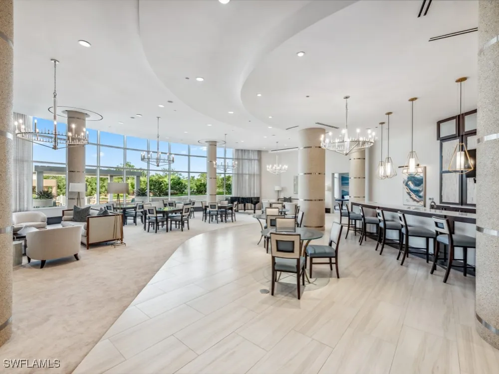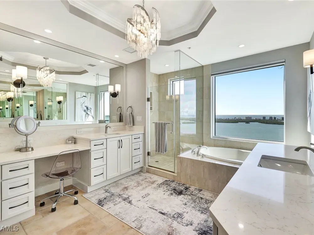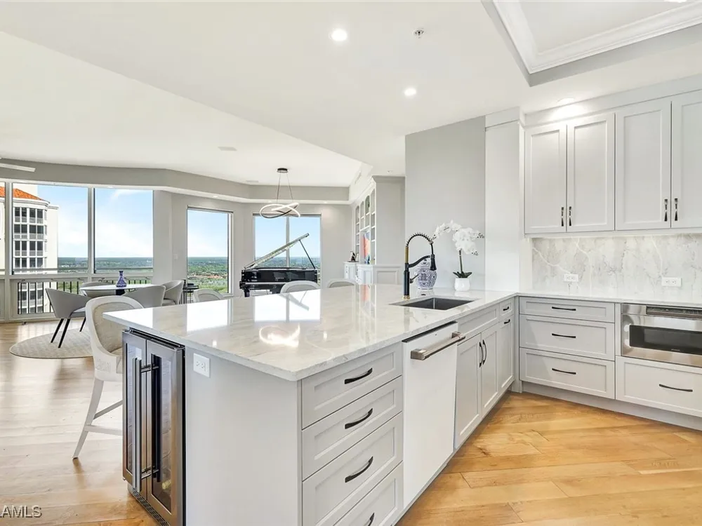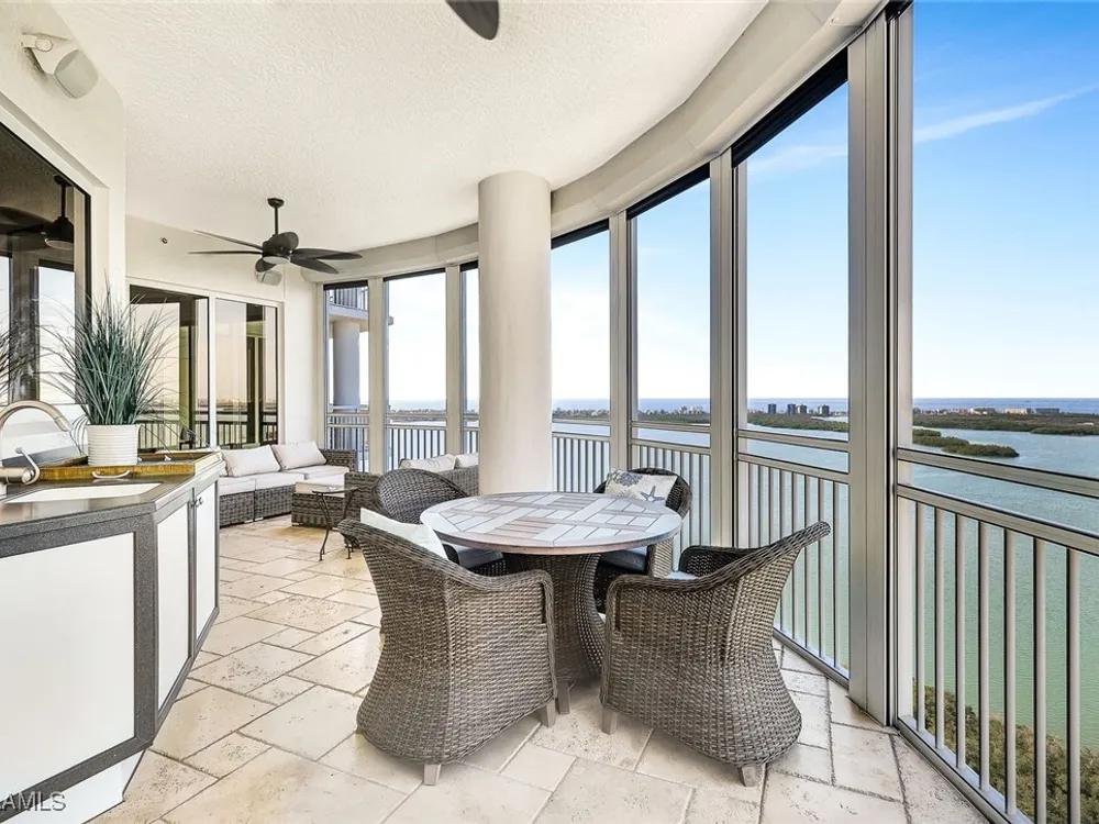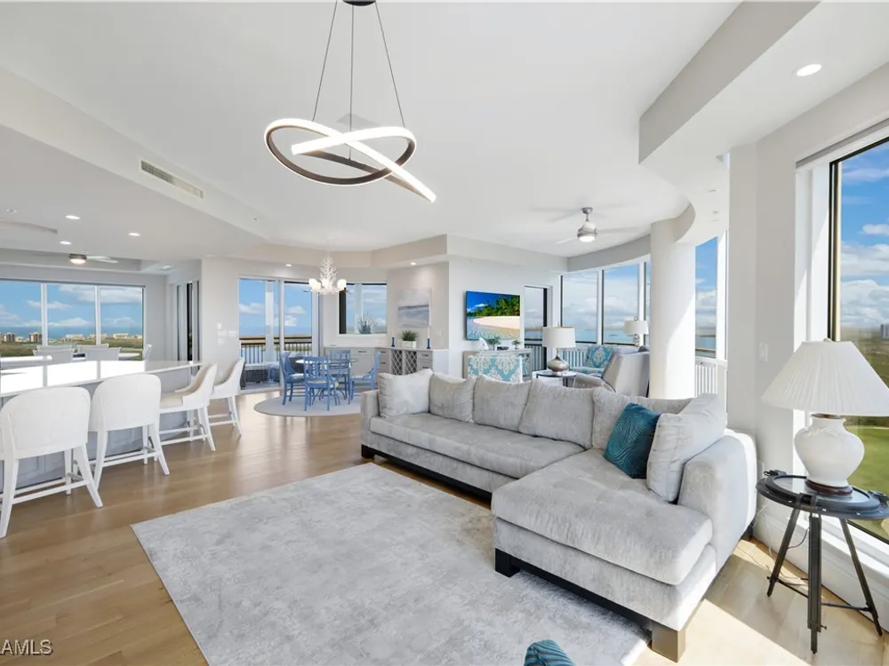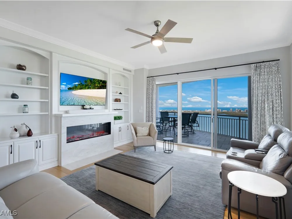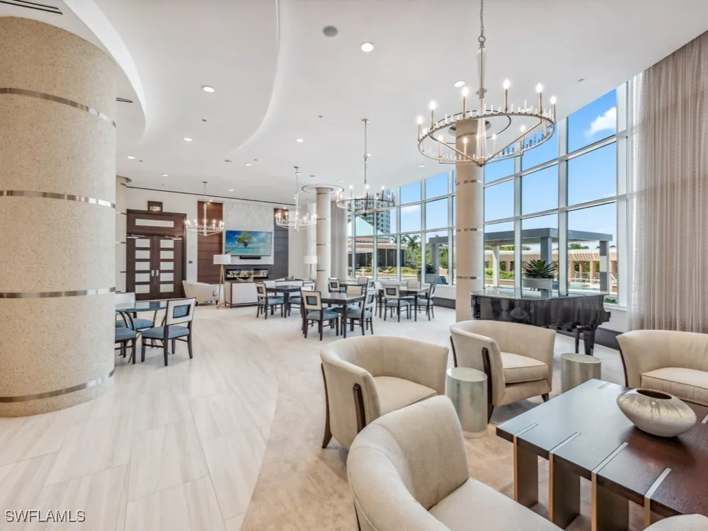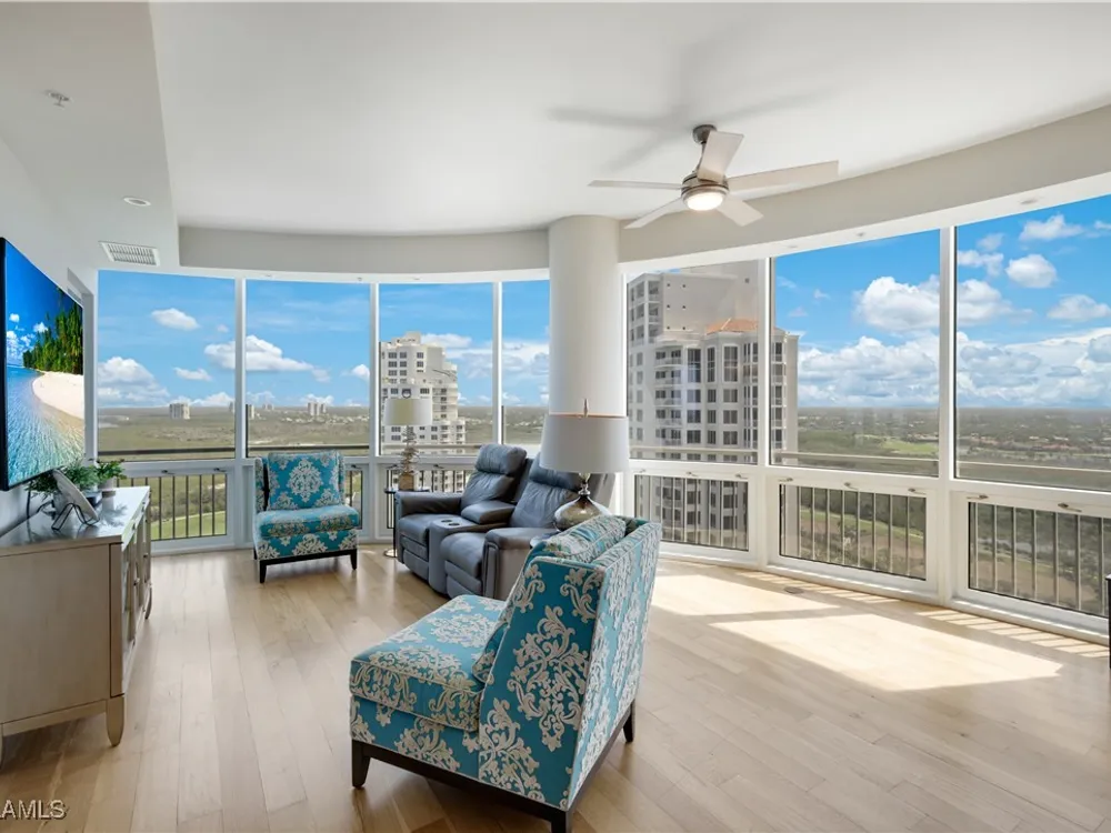Beautifully updated and furnished, with breath-taking panoramic views and ready to move in! Tastefully updated luxury condo end unit on the 21st floor of Azure in Bonita Bay. Dramatic sunset views over Estero Bay and the Gulf. 2 large open terraces plus screened lanai with gas grill. Make sure that you see the photos! Lovely formal living room with electric fireplace. Living room opens to large West facing terrace. Formal dining room & separate breakfast/informal dining area. The elevator goes directly to the entry foyer of your home. Spacious primary bedroom with large bath and 2 walk-in closets. 2 more guest bedrooms both with an en suite bath. Gourmet kitchen with GE Café appliances (gas cooktop) and quartz countertops. Separate large kitchen island with wine/beverage refrigerator. Kitchen opens to expansive family room. California closets in all the bedrooms. SONOS sound system throughout. This unit includes 2 assigned under-building parking spaces on the SECOND-FLOOR PARKING level with electric available. Separate climate-controlled storage space. Azure has a beautiful pool, spa, fitness room, billiards room, card room, theater and large social room. 2 guest suites on the lobby level are available for use by your special guests or family members. Offered BEAUTIFULLY FURNISHED. Start living your dream Florida lifestyle today!
