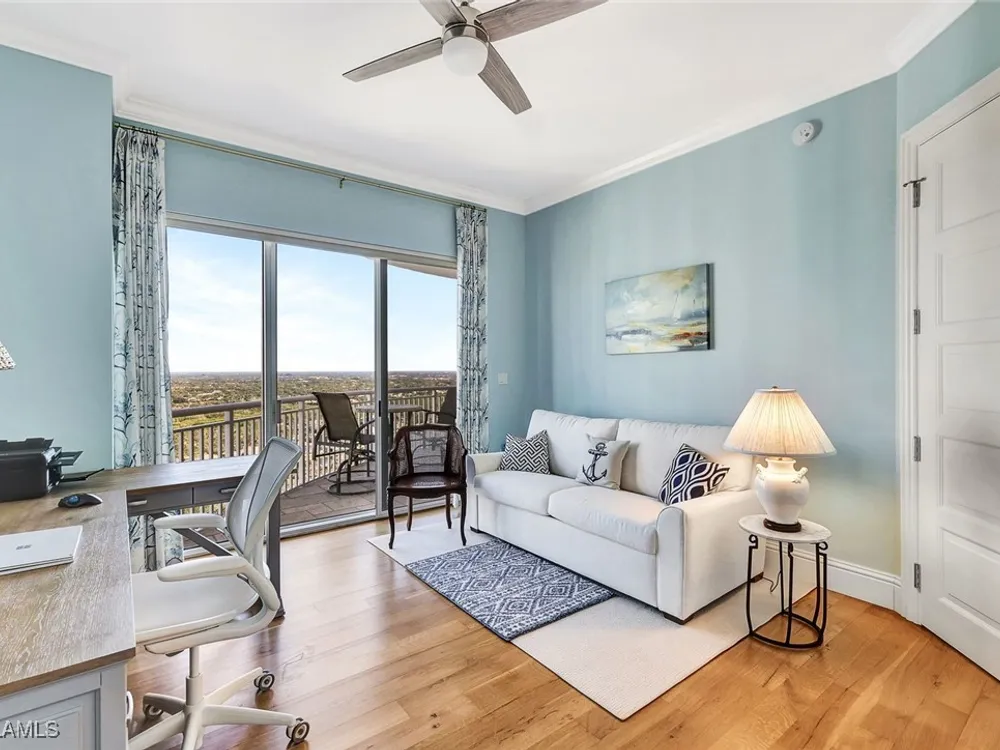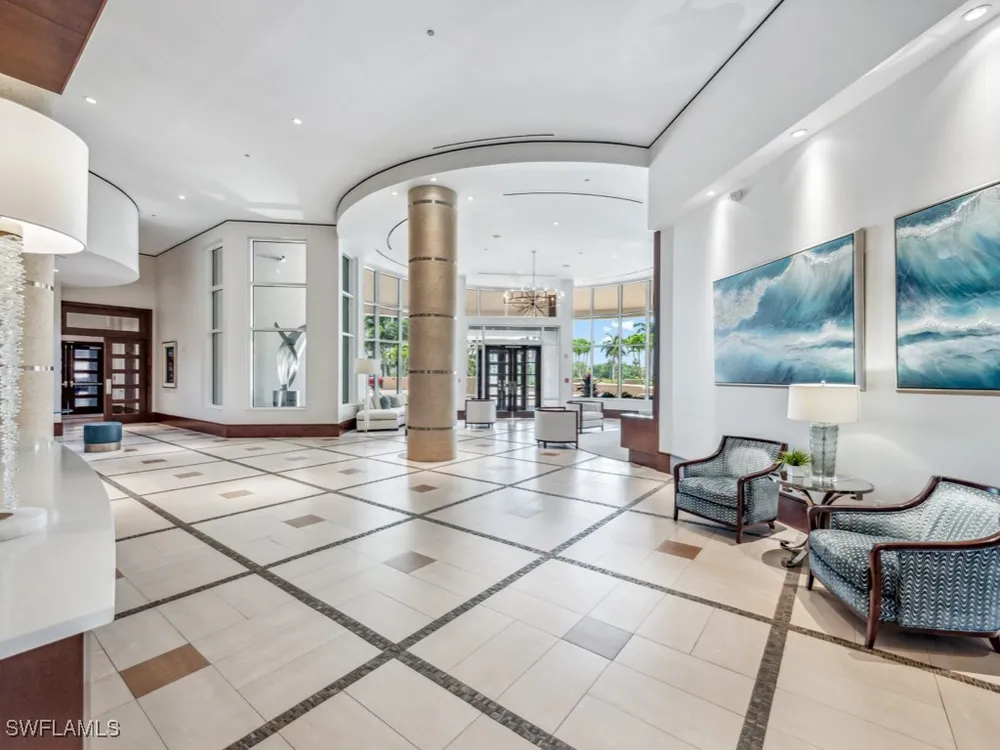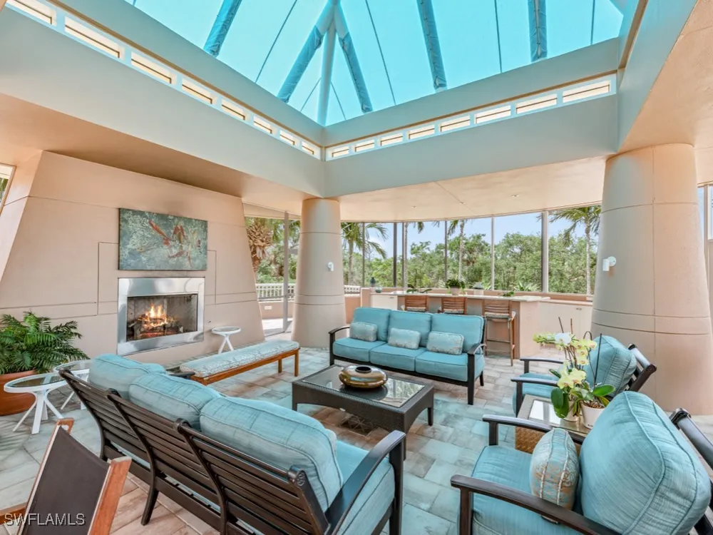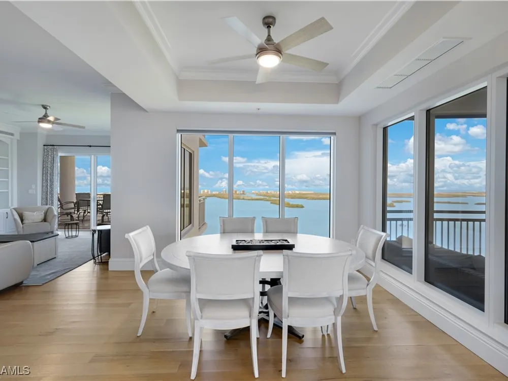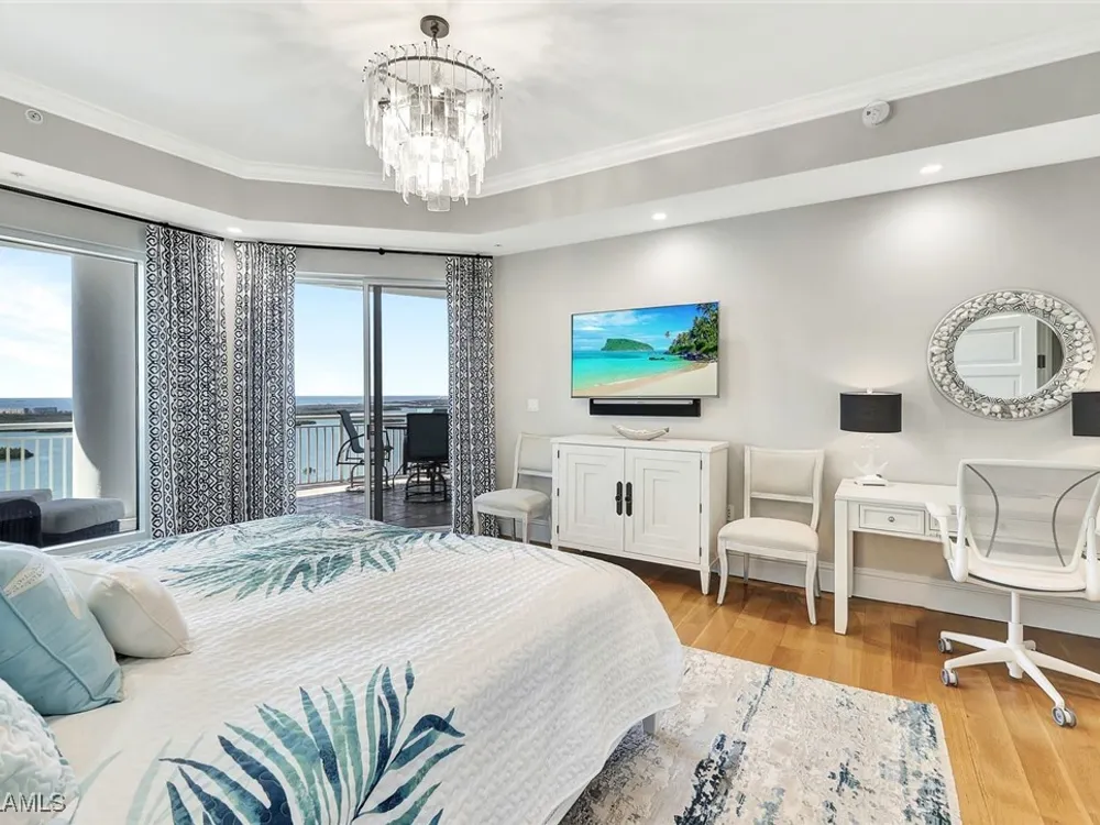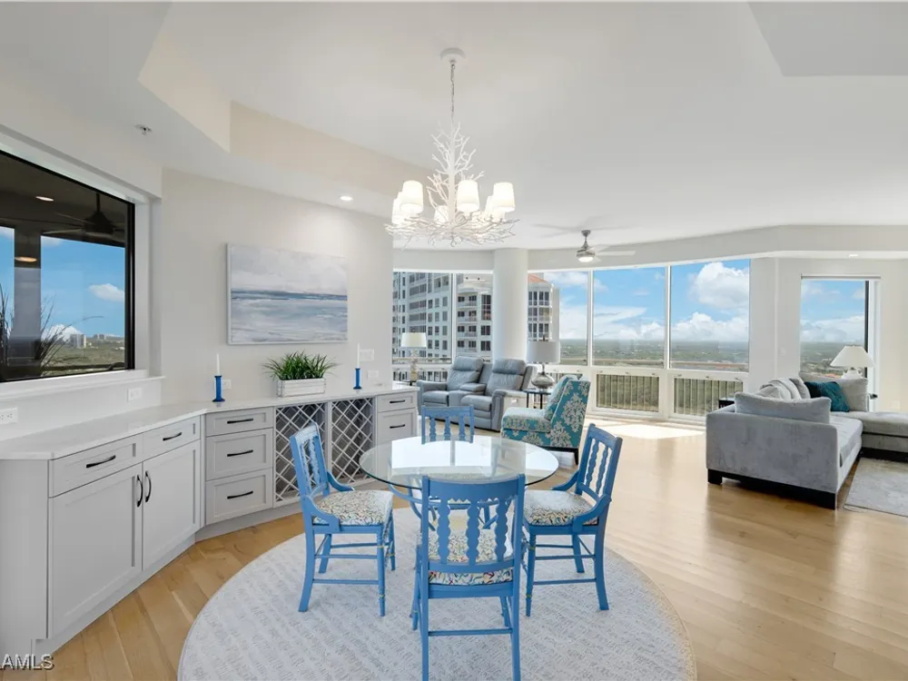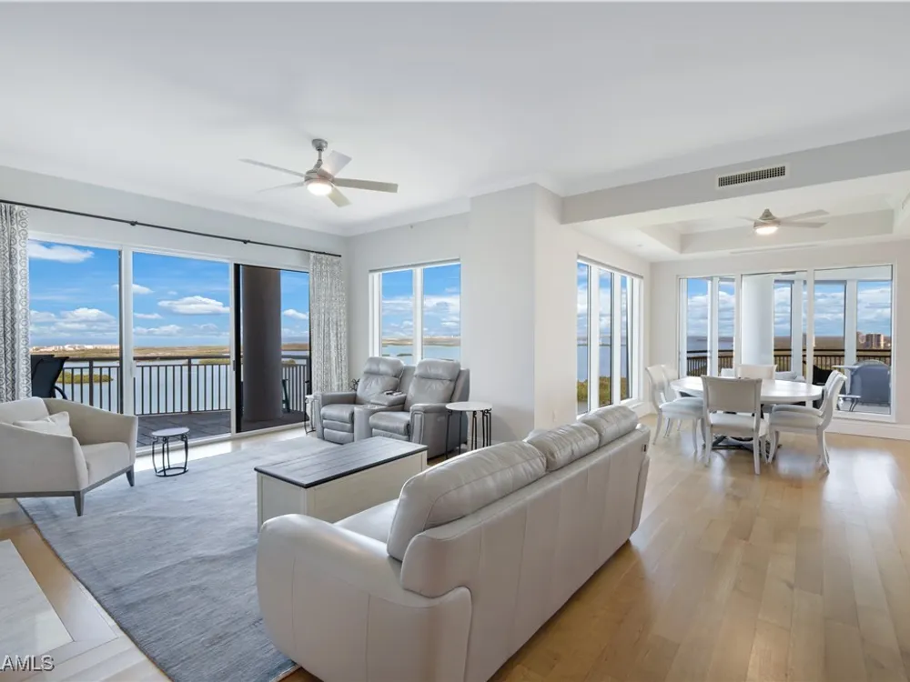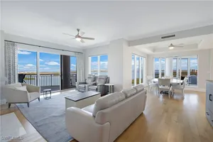 Beautifully updated and furnished, with breath-taking panoramic views and ready to move in! Tastefully updated luxury condo end unit on the 21st floor of Azure in Bonita Bay. Dramatic sunset views over Estero Bay and the Gulf. 2 large open terraces plus screened lanai with gas grill. Make sure that you see the photos! Lovely formal living room with electric fireplace. Living room opens to large West facing terrace. Formal dining room & separate breakfast/informal dining area. The elevator goes directly to the entry foyer of your home. Spacious primary bedroom with large bath and 2 walk-in closets. 2 more guest bedrooms both with an en suite bath. Gourmet kitchen with GE Café appliances (gas cooktop) and quartz countertops. Separate large kitchen island with wine/beverage refrigerator. Kitchen opens to expansive family room. California closets in all the bedrooms. SONOS sound system throughout. This unit includes 2 assigned under-building parking spaces on the SECOND-FLOOR PARKING level with electric available. Separate climate-controlled storage space. Azure has a beautiful pool, spa, fitness room, billiards room, card room, theater and large social room. 2 guest suites on the lobby level are available for use by your special guests or family members. Offered BEAUTIFULLY FURNISHED. Start living your dream Florida lifestyle today!
