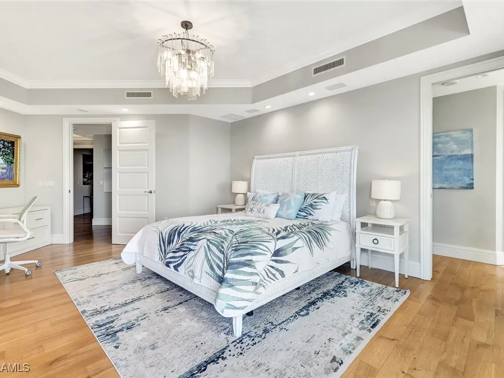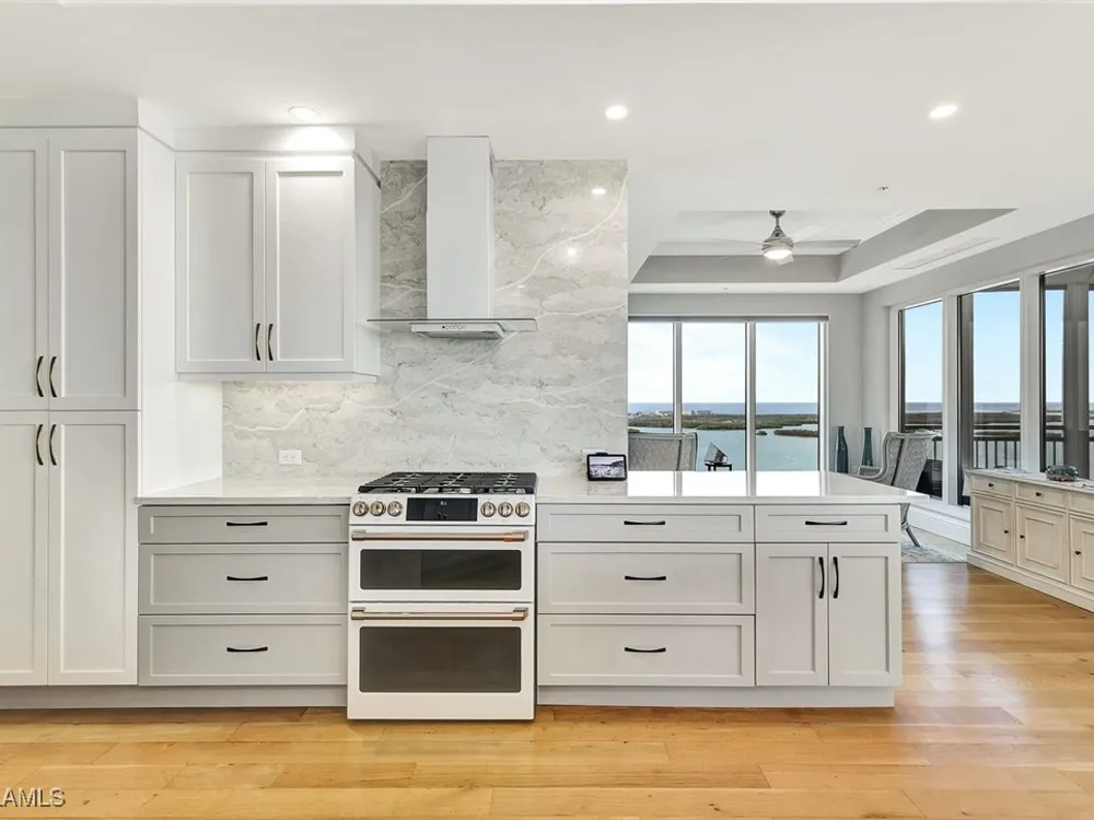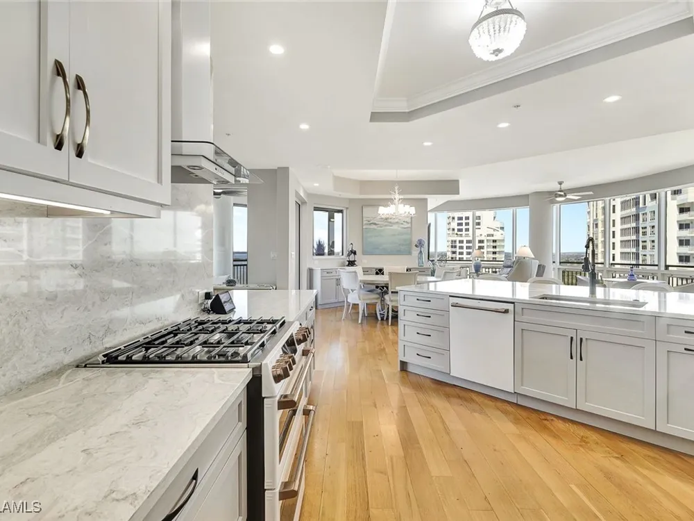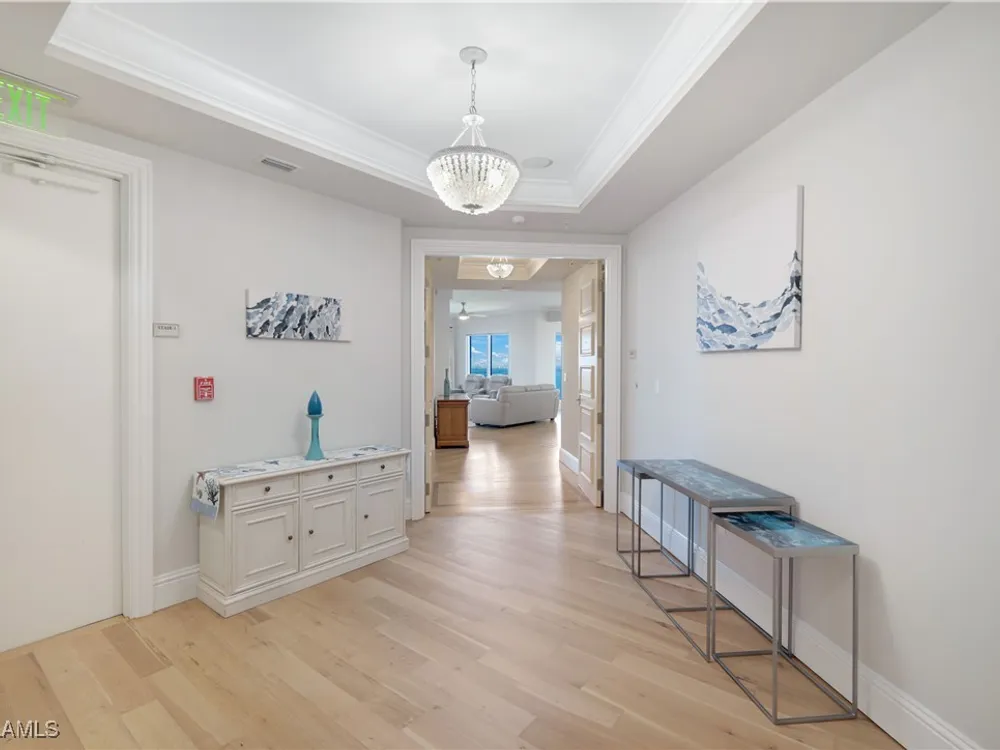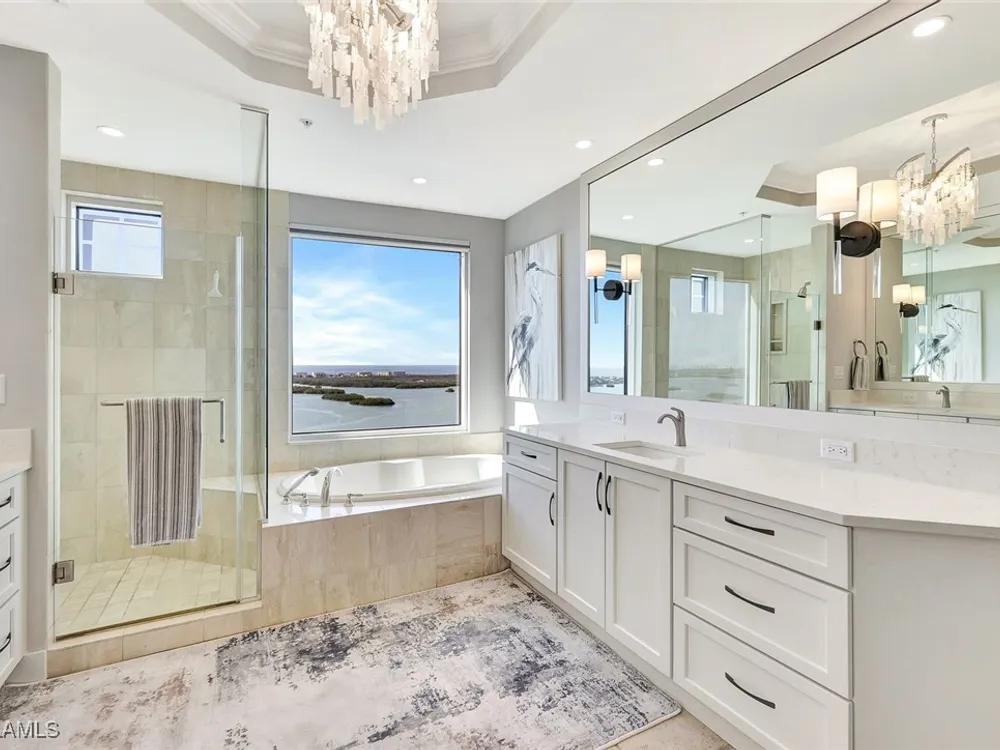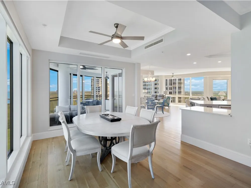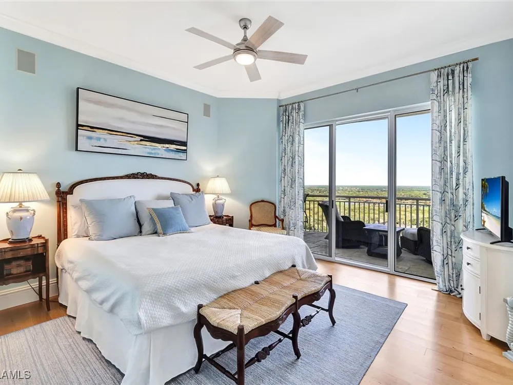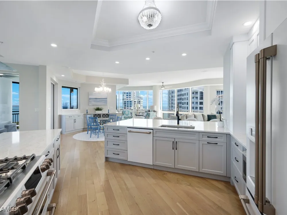 Beautifully updated and furnished, with breath-taking panoramic views and ready to move in! Tastefully updated luxury condo end unit on the 21st floor of Azure in Bonita Bay. Dramatic sunset views over Estero Bay and the Gulf. 2 large open terraces plus screened lanai with gas grill. Make sure that you see the photos! Lovely formal living room with electric fireplace. Living room opens to large West facing terrace. Formal dining room & separate breakfast/informal dining area. The elevator goes directly to the entry foyer of your home. Spacious primary bedroom with large bath and 2 walk-in closets. 2 more guest bedrooms both with an en suite bath. Gourmet kitchen with GE Café appliances (gas cooktop) and quartz countertops. Separate large kitchen island with wine/beverage refrigerator. Kitchen opens to expansive family room. California closets in all the bedrooms. SONOS sound system throughout. This unit includes 2 assigned under-building parking spaces on the SECOND-FLOOR PARKING level with electric available. Separate climate-controlled storage space. Azure has a beautiful pool, spa, fitness room, billiards room, card room, theater and large social room. 2 guest suites on the lobby level are available for use by your special guests or family members. Offered BEAUTIFULLY FURNISHED. Start living your dream Florida lifestyle today!