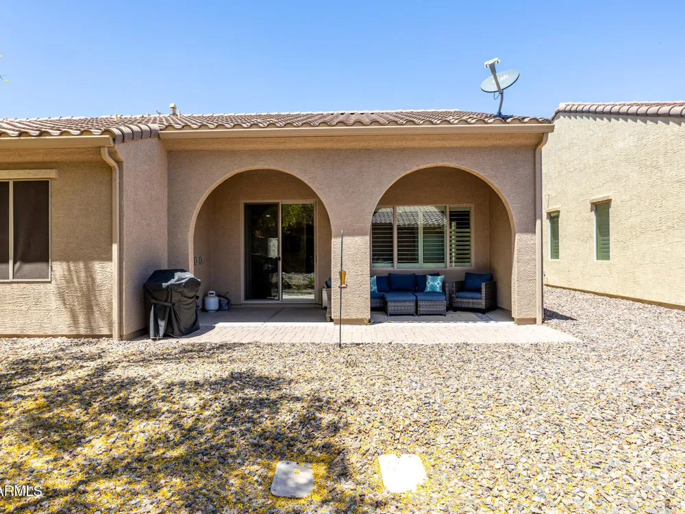Furnished Villa - Just Bring Your Bags! This gorgeous 2-bedroom, 2-bath, 2-car garage villa is move-in ready and absolutely adorable! Ideally located within walking distance to the Sports Center, Clubhouse, Restaurant, and Pro Shop, you'll love the convenience and lifestyle this home offers. Offered fully furnished — everything inside stays, down to the bedding, kitchen items, and decor — making your move effortless. The golf cart is negotiable. The kitchen is a highlight of the home with upgraded cabinetry featuring roll-out shelves, under-cabinet lighting, stainless steel appliances, a spacious island with breakfast bar, a skylight, granite countertops, and a stylish backsplash. Upgrades continue throughout with quartz vanities, 20'' x 20'' tile flooring, plantation shutters, custom window treatments, two-tone paint, and an epoxy-coated garage with built-in cabinets, workbench and soft water system. Enjoy Arizona's beautiful weather on the south-facing covered patio, complete with a 5-foot paver extension, perfect for relaxing or entertaining. Enjoy golf, pickleball, tennis, swimming, exercise facilities and softball. Even better, the HOA handles all exterior and landscaping maintenance so you can simply relax and enjoy the incredible amenities this multi-million-dollar resort community has to offer.