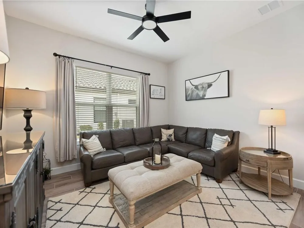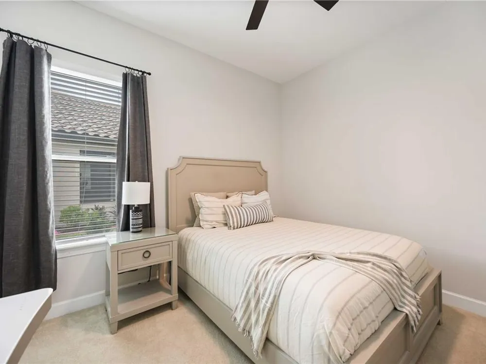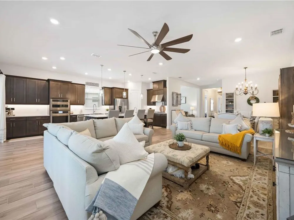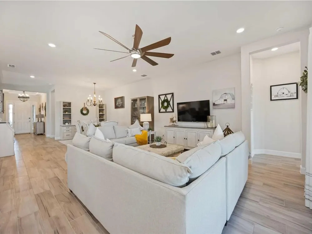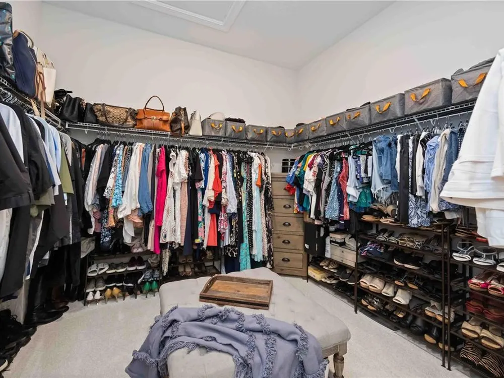 - Ceiling Fan(s), Crown Molding, Dry Bar, Eat-in Kitchen, High Ceilings, In-Wall Pest Control, Kitchen/Family Room Combo, Open Floorplan, Main Level Primary, Solid Surface Counters, Walk-In Closet(s), Window Treatments