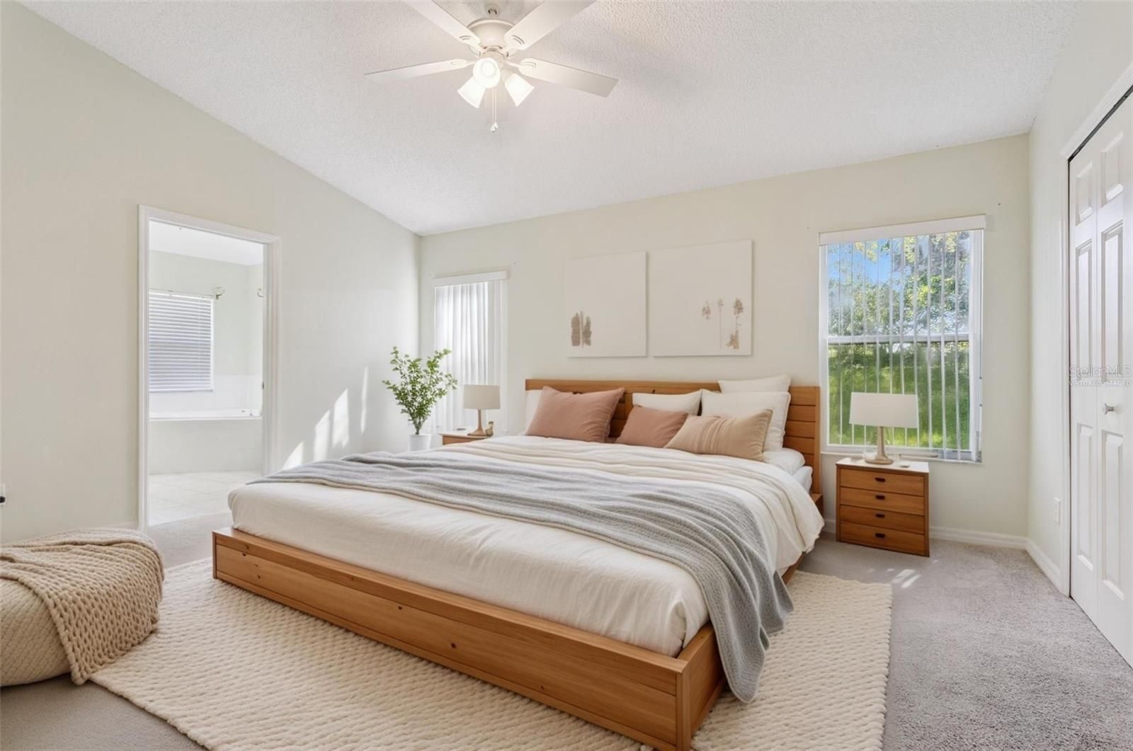 - Ceiling Fan(s), Eat-in Kitchen, High Ceilings, Living/Dining Room, Main Level Primary, Solid Surface Counters, Thermostat, Walk-In Closet(s), Window Treatments