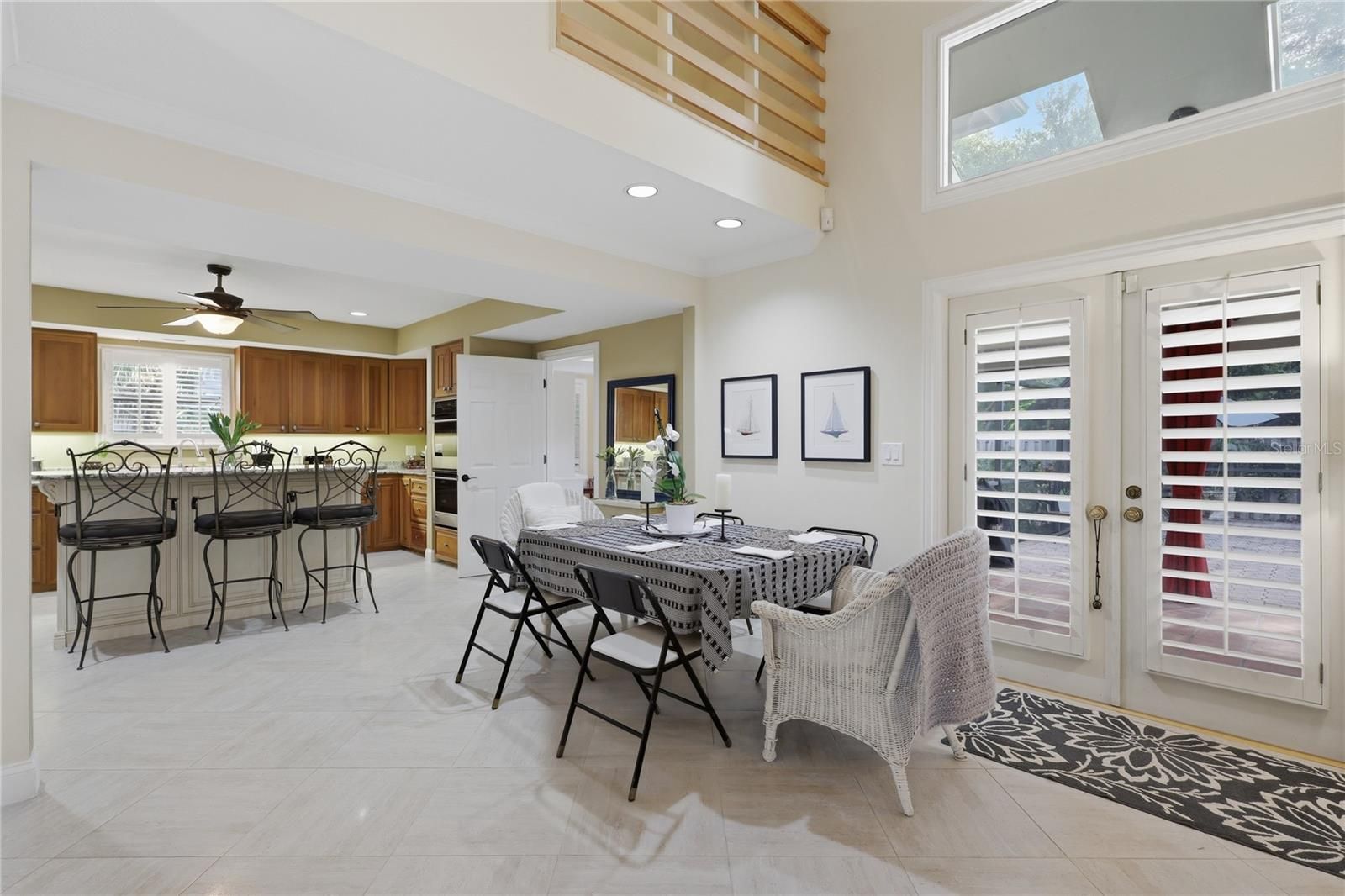 Soaring ceilings and an abundance of natural light define this spacious 4-bedroom, 4-bath residence, thoughtfully designed and custom built by the original owner for both everyday living and effortless entertaining. Rich Cypress siding, elegant crown molding, plantation shutters, and imported Italian porcelain tile add warmth, architectural refinement, and timeless style throughout the home. The open floor-plan creates a seamless flow between living spaces, while a striking floor-to-ceiling white brick wood-burning fireplace serves as a dramatic focal point in the great room. Clerestory windows and skylights enhance the bright, airy ambiance, and custom built-in cabinetry compliments the home's clean, coastal-inspired design. Step outside to a private pool with an inviting setting for relaxing or hosting guests. A flexible office/den provides the ideal space for working from home or enjoying a quiet retreat, while generously sized bedrooms ensure comfort and privacy for family and visitors alike. Located within The Landings, a highly sought-after and gated West-of-Trail community, residents enjoy a lush, park-like environment with mature landscaping, scenic walking trails, and access to the Intracoastal Waterway. Community amenities include a kayak launch, kayak racks (as available), and a fishing pier situated at the end of a scenic nature trail, perfect for embracing Sarasota's waterfront lifestyle. Optional membership to the Landings Racquet Club offers tennis courts, a fitness center, clubhouse, and a vibrant social calendar. Ideally situated just minutes from downtown Sarasota, fine dining, shopping, and the world-renowned beaches of Siesta Key, The Landings offers an exceptional blend of privacy, natural beauty, and active living.