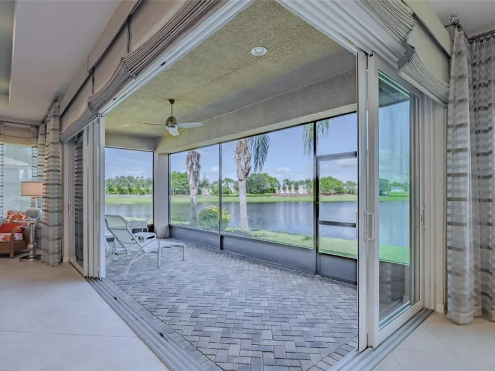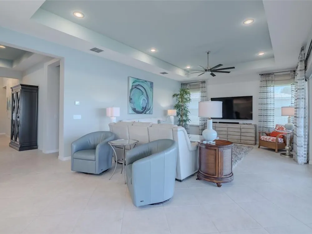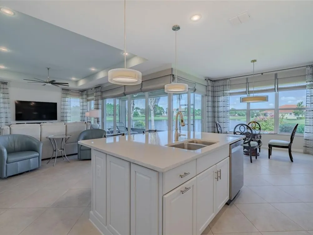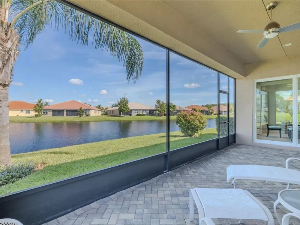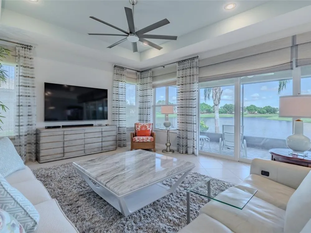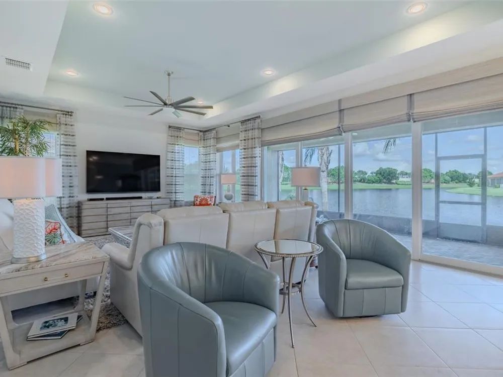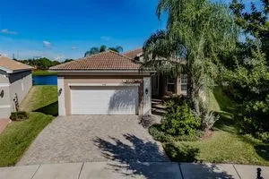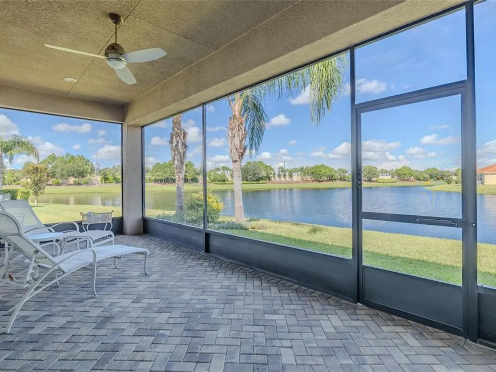 Sometimes, gemstones rise to the surface. This ARUBA model is just one of nine in all of Valencia Lakes, Tampa Bay’s premier 55+ Active Adult Community. This ARUBA has 2,362SF under air and sits on an exceptional lot with a gorgeous Northwest water-view providing exceptional sunset vistas. Hurricane resistant impact-glass windows throughout, including the 24’ wide, 8’ high zero-corner sliding glass doors bask this ARUBA in natural sunlight, improve HVAC and noise efficiencies and provide worry-free protection year-round. A full width pavered driveway and walkway, complimented by manicured Florida landscaping graces the entrance. A towering 13’-14’ Tray Ceiling crowns an expansive and welcoming Foyer. Immediately left of the Foyer is a wonderful Laundry Room replete with upper and lower cabinets, a cabinet utility sink, and GE front-load washer & dryer. Bedroom 2 is at the front of the house and features a bay window with plantation shutters overlooking the front gardens, a lighted ceiling fan, and a generous Walk-In Closet. Directly accessible from the hallway is a large and bright Office with recessed lights, and a lighted ceiling fan. How will you use this space? The Primary Bedroom is 14’x18’ with a 10’-11’ Tray Ceiling with a lighted ceiling fan and two large Walk-In Closets, and its distinguishing feature is that it has two separate Bathrooms: one for you, and one for me … “I love you, but stay out of my bathroom.” Floor-to-ceiling wall tile features in all showers, MOEN faucets with dual showerheads, and bespoke lighting and designer mirrors in the larger bathroom make the Primary Bedroom and its two Ensuite Bathrooms a delightful retreat. At the rear of the house is a spectacular open floorplan with a wall of windows capturing an amazing water view. The Gourmet Kitchen features solid maple wood cabinetry, upper cabinets with over and under cabinet lighting, soft close drawers, lower cabinets with sliders, pot drawers, a Pantry with sliding shelves, extensive Quartz counters topped by a chic optical glass backsplash, SAMSUNG SS appliances including an induction range with convection oven, and a large center Island with cabinet siding that will comfortable seat 4 persons. With a commanding view of the open floorplan, this Gourmet Kitchen is a Chef’s delight. The Dining Room will comfortably accommodate 8 persons, and it has stunning water views. The Great Room is 27’x17’ with a 10’-to-11’ Tray ceiling; one wall is 21’ of glass overlooking the water. Incredible serenity will become your norm. ANN LUBNER DESIGNS has artfully designed the window treatments and interior with Hunter-Douglass treatments and delightful wall colors. 20’x20’ ceramic tile on the diagonal runs throughout the common and wet areas and carpet adorns the bedrooms. The 20’x20’ garage features a lux epoxy floor and overhead storage. This ARUBA is a rare gemstone that is certain to make you comfortable and proud. Valencia Lakes is a highly desired 55+ community that offers exceptional amenities, and is close to downtown Tampa, Sarasota, TPA and SRQ, excellent shopping and exceptional medical services, and some of Florida’s finest beaches. Seize this day and begin to live your idyllic life today. The HOA FEE includes: lawn, garden and tree upkeep, SPECTRUM Cable Television with premium channels, Hi-Speed internet, ADT Monitored Security, and use of all Amenities.