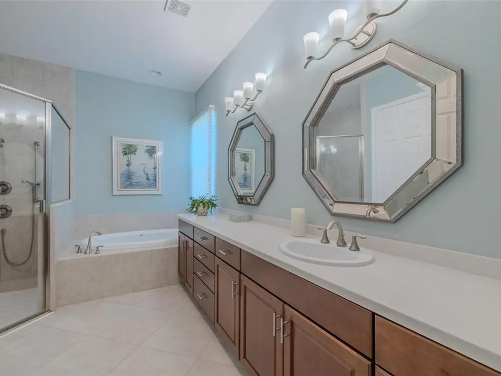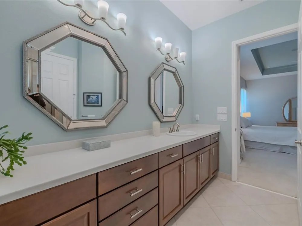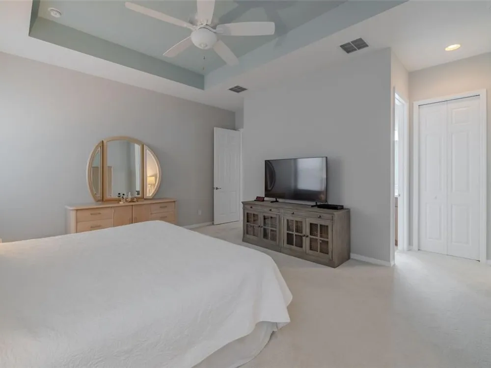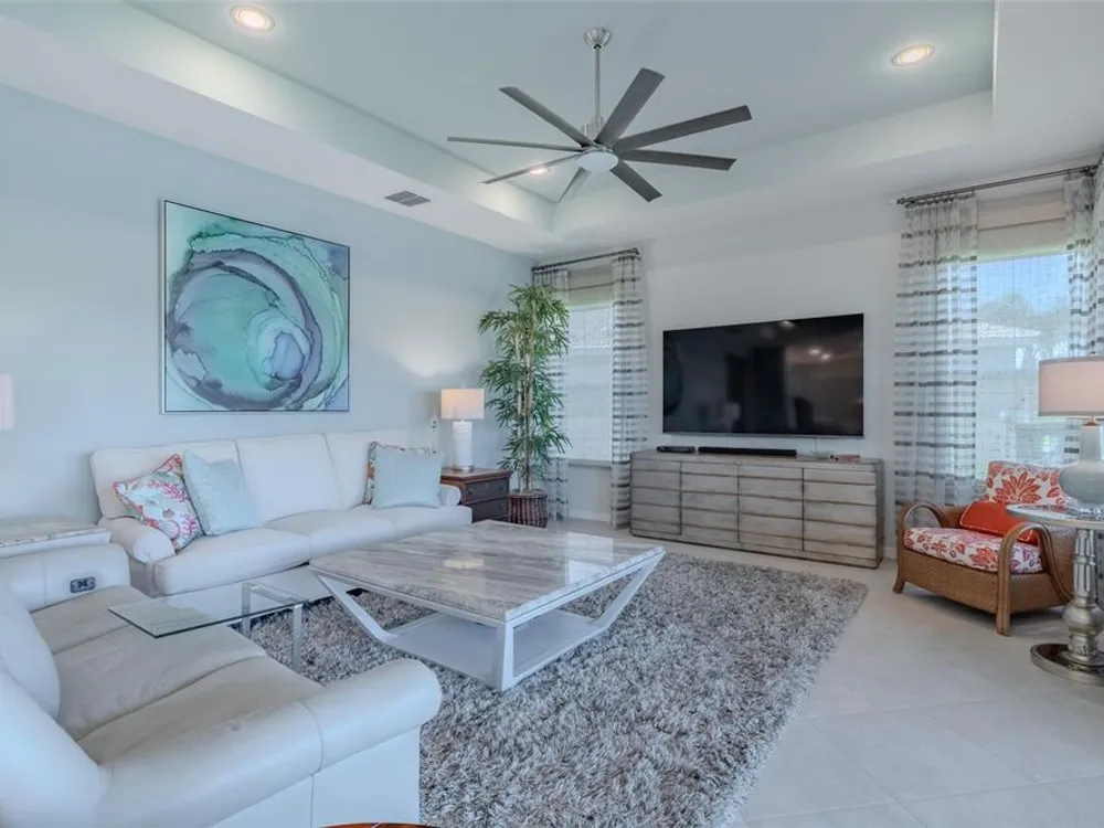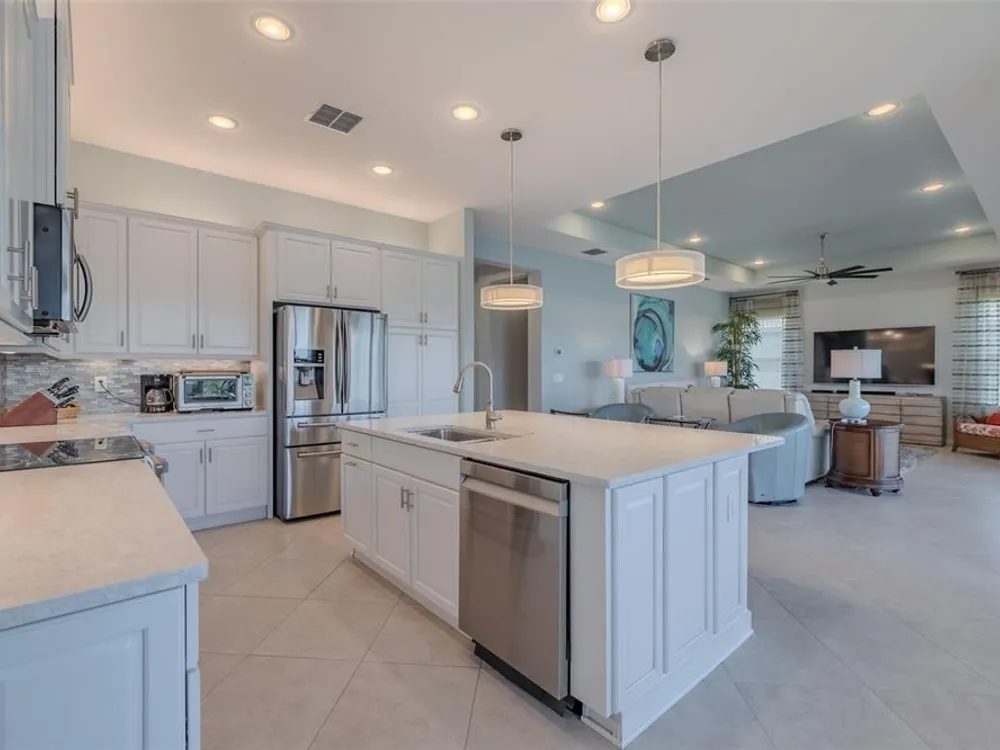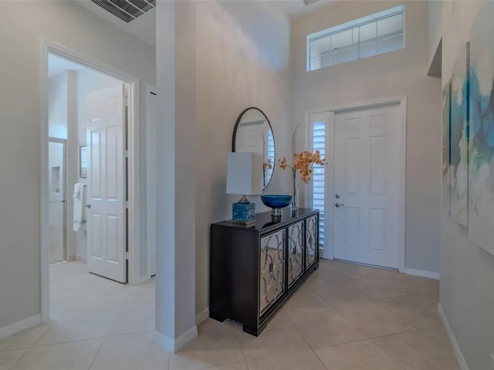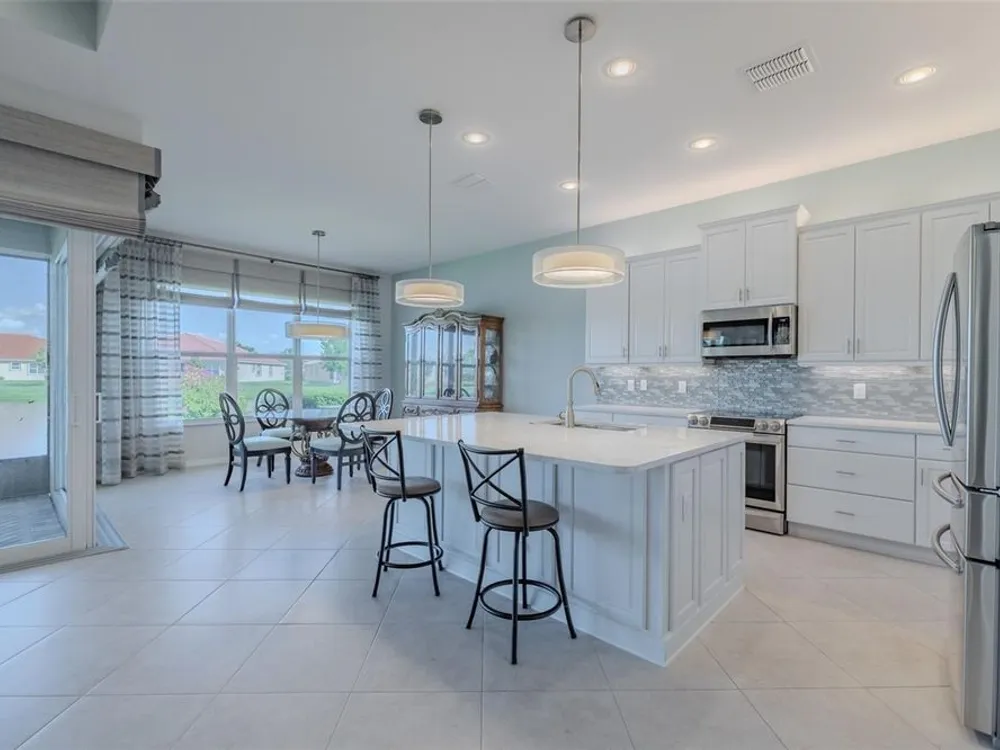 Sometimes, gemstones rise to the surface. This ARUBA model is just one of nine in all of Valencia Lakes, Tampa Bay’s premier 55+ Active Adult Community. This ARUBA has 2,362SF under air and sits on an exceptional lot with a gorgeous Northwest water-view providing exceptional sunset vistas. Hurricane resistant impact-glass windows throughout, including the 24’ wide, 8’ high zero-corner sliding glass doors bask this ARUBA in natural sunlight, improve HVAC and noise efficiencies and provide worry-free protection year-round. A full width pavered driveway and walkway, complimented by manicured Florida landscaping graces the entrance. A towering 13’-14’ Tray Ceiling crowns an expansive and welcoming Foyer. Immediately left of the Foyer is a wonderful Laundry Room replete with upper and lower cabinets, a cabinet utility sink, and GE front-load washer & dryer. Bedroom 2 is at the front of the house and features a bay window with plantation shutters overlooking the front gardens, a lighted ceiling fan, and a generous Walk-In Closet. Directly accessible from the hallway is a large and bright Office with recessed lights, and a lighted ceiling fan. How will you use this space? The Primary Bedroom is 14’x18’ with a 10’-11’ Tray Ceiling with a lighted ceiling fan and two large Walk-In Closets, and its distinguishing feature is that it has two separate Bathrooms: one for you, and one for me … “I love you, but stay out of my bathroom.” Floor-to-ceiling wall tile features in all showers, MOEN faucets with dual showerheads, and bespoke lighting and designer mirrors in the larger bathroom make the Primary Bedroom and its two Ensuite Bathrooms a delightful retreat. At the rear of the house is a spectacular open floorplan with a wall of windows capturing an amazing water view. The Gourmet Kitchen features solid maple wood cabinetry, upper cabinets with over and under cabinet lighting, soft close drawers, lower cabinets with sliders, pot drawers, a Pantry with sliding shelves, extensive Quartz counters topped by a chic optical glass backsplash, SAMSUNG SS appliances including an induction range with convection oven, and a large center Island with cabinet siding that will comfortable seat 4 persons. With a commanding view of the open floorplan, this Gourmet Kitchen is a Chef’s delight. The Dining Room will comfortably accommodate 8 persons, and it has stunning water views. The Great Room is 27’x17’ with a 10’-to-11’ Tray ceiling; one wall is 21’ of glass overlooking the water. Incredible serenity will become your norm. ANN LUBNER DESIGNS has artfully designed the window treatments and interior with Hunter-Douglass treatments and delightful wall colors. 20’x20’ ceramic tile on the diagonal runs throughout the common and wet areas and carpet adorns the bedrooms. The 20’x20’ garage features a lux epoxy floor and overhead storage. This ARUBA is a rare gemstone that is certain to make you comfortable and proud. Valencia Lakes is a highly desired 55+ community that offers exceptional amenities, and is close to downtown Tampa, Sarasota, TPA and SRQ, excellent shopping and exceptional medical services, and some of Florida’s finest beaches. Seize this day and begin to live your idyllic life today. The HOA FEE includes: lawn, garden and tree upkeep, SPECTRUM Cable Television with premium channels, Hi-Speed internet, ADT Monitored Security, and use of all Amenities.