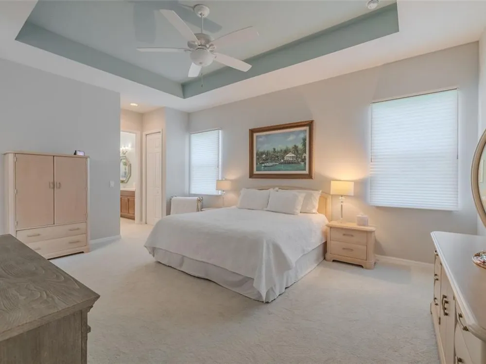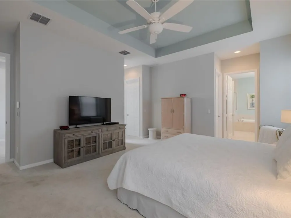 - Ceiling Fan(s), Eat-in Kitchen, High Ceilings, Open Floorplan, Main Level Primary, Solid Surface Counters, Solid-Wood Cabinets, Split Bedrooms, Thermostat, Tray Ceiling(s), Walk-In Closet(s), Window Treatments
