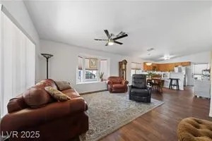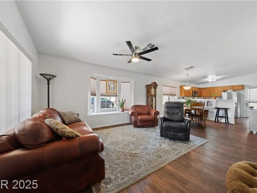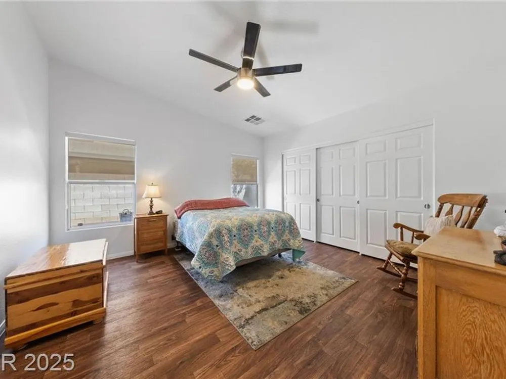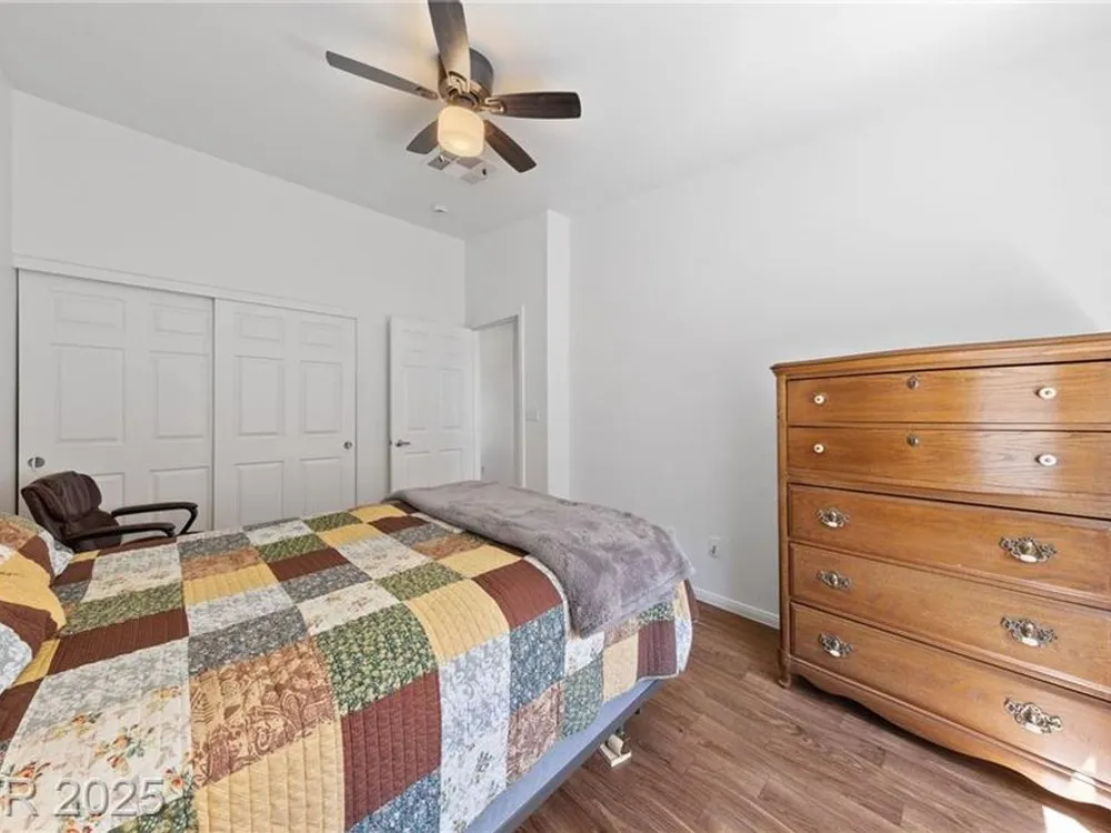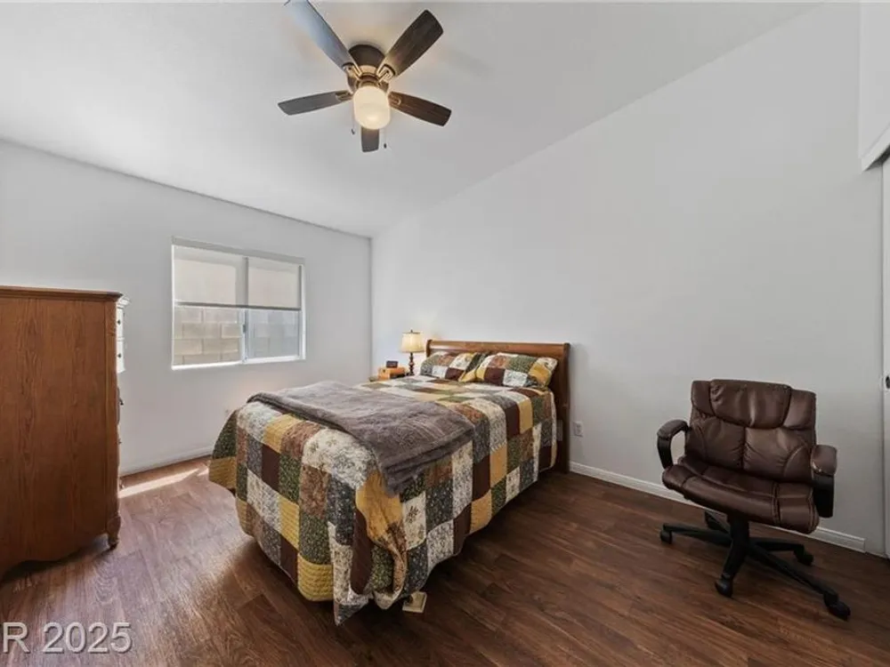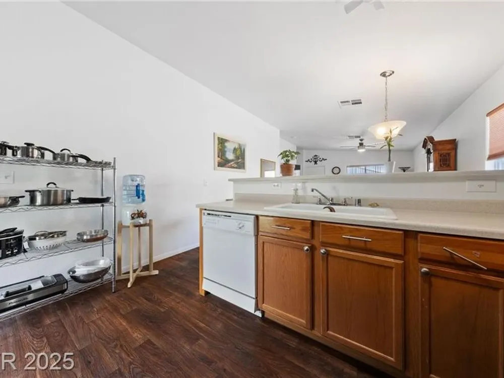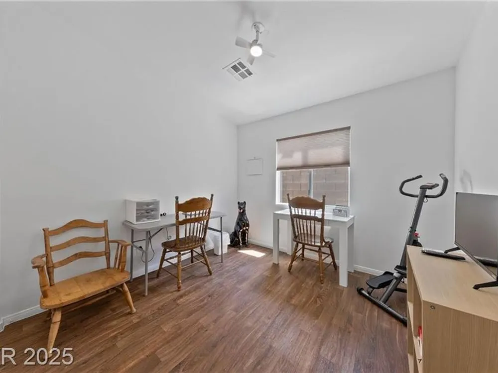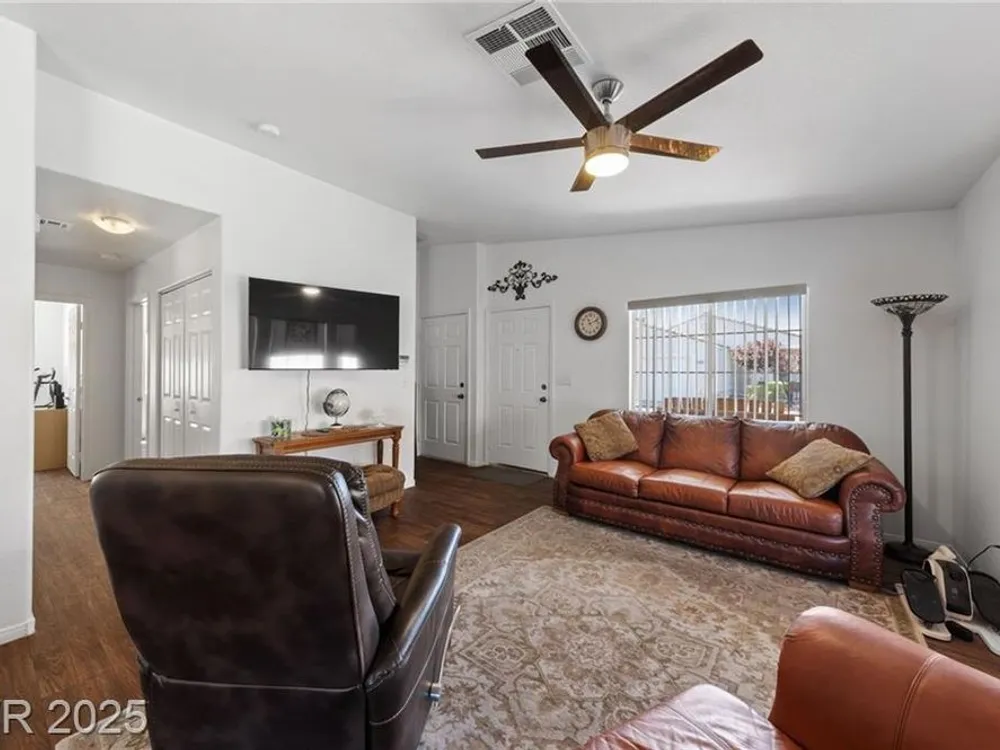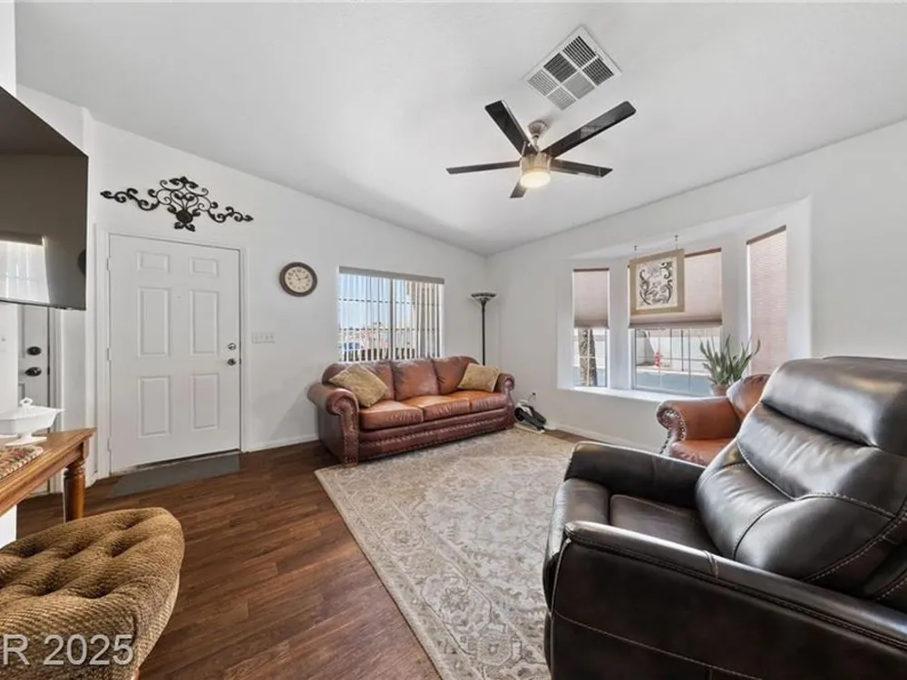 **HIGHLY MOTIVATED SELLER** Nestled in the serene, gated 55+ community of Las Vegas, this stunning single-story home offers the perfect blend of comfort & elegance, with the tranquil wetlands just steps away. Boasting a spacious, open floor plan, the home features beautiful wood laminate flooring throughout, creating a warm and inviting atmosphere. Ceiling fans in every room ensure year-round comfort, while the meticulously maintained interior makes this home truly move-in ready. The clean, low-maintenance backyard, complete with artificial turf, is ideal for relaxing or entertaining. The home has an oversized 2-car garage, providing ample space for vehicles and storage. This well-kept gem combines modern convenience with a peaceful lifestyle, offering easy access to community amenities and the natural beauty of the nearby wetlands. Don’t miss the opportunity to own this pristine retreat in one of Las Vegas’s most desirable senior communities, where luxury and tranquility meet.