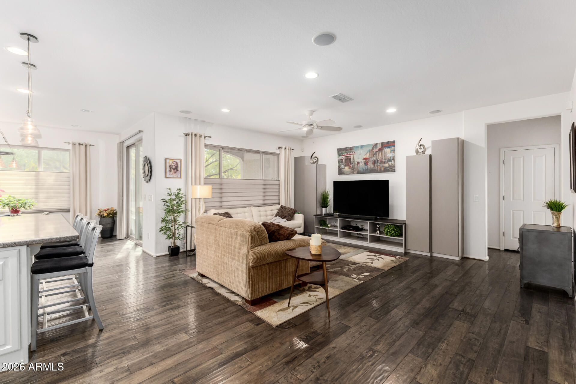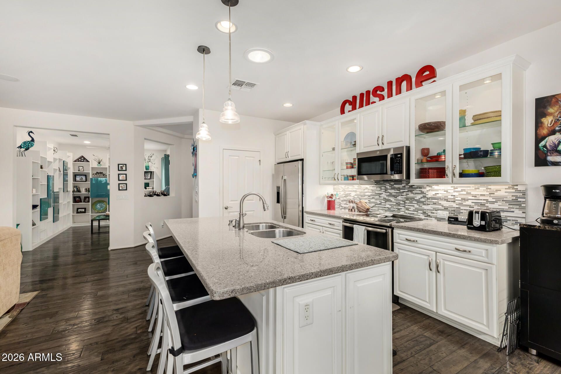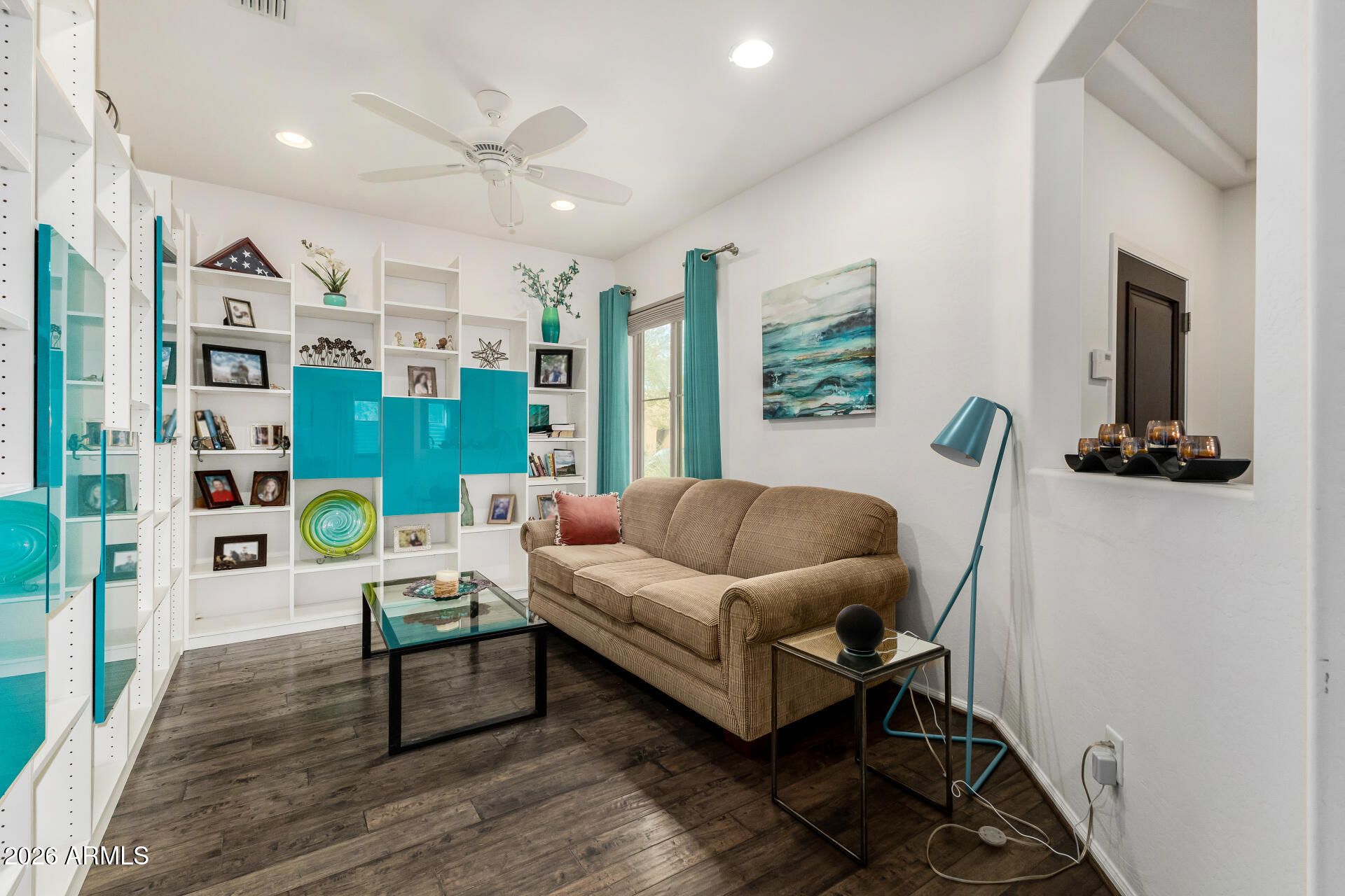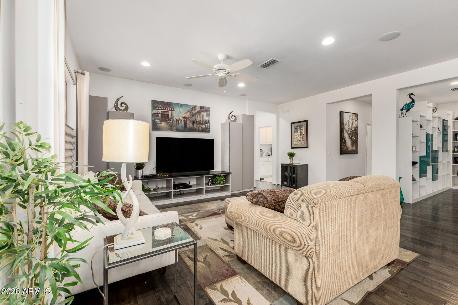 Furnished 2-bedroom, Den, 2 Bath home in Robson Ranch! Thoughtfully designed, the interior showcases an open floor plan with wood floors, contemporary lighting, premium home theater package w/speakers, perfect for entertaining, and stylish neutral tones. The kitchen comes equipped with ample cabinets, tile backsplash, stone counters, SS appliances, and an island. The serene main bedroom promises a good night's rest and features a walk-in closet and a bathroom with dual sinks. You'll find built-in shelves in the den, making it perfect for a home office. Out back, you can enjoy peaceful evenings under the cozy covered patio with well-laid pavers. Don't forget to visit the community's pool, spa, golf, clubhouse, and other amenities to fill your days with fun! Make this gem yours now, So many upgardes such as 42" white Maple cabinets w/upper & under cabinet lighting, new microwave, new dishwasher, soft close drawers, roll out shelves, high end appliances, pendant lights & backsplash. Remote controlled blinds, 4 solar tubes, custom closet systems. Guest bedroom with a Queen Size Murphy Bed. Garage has recirculating pump, water softener, epoxy flooring & built in cabinets. Note - ice-maker does not work.