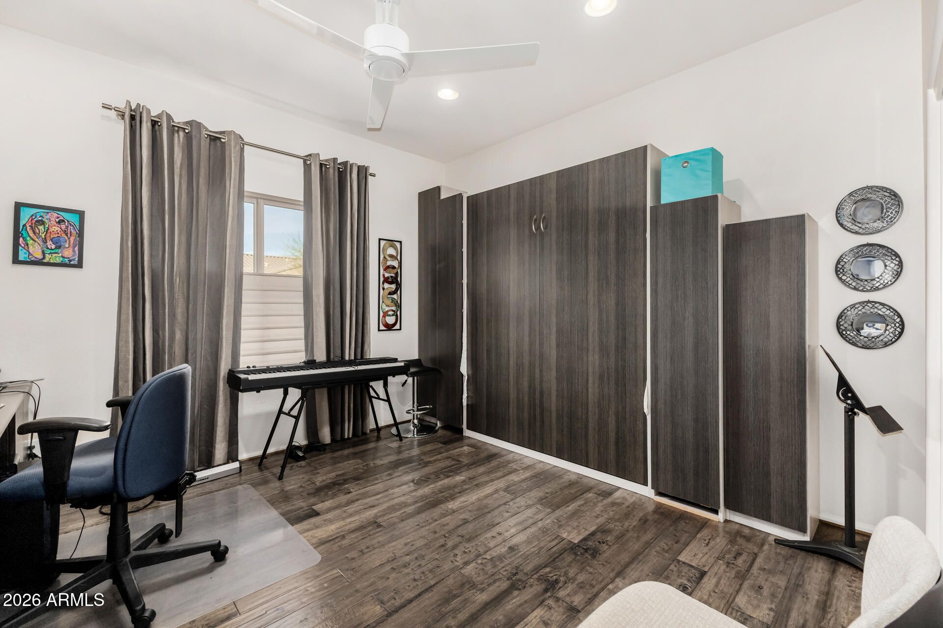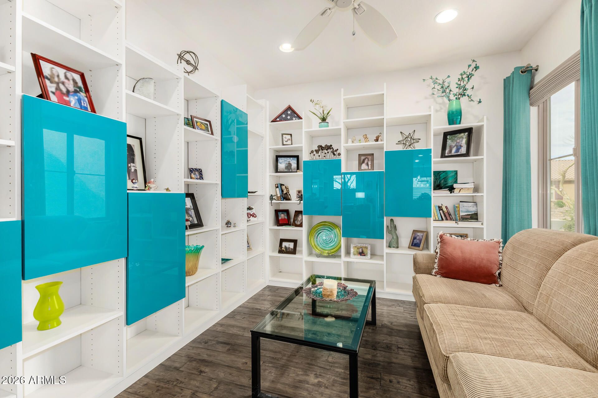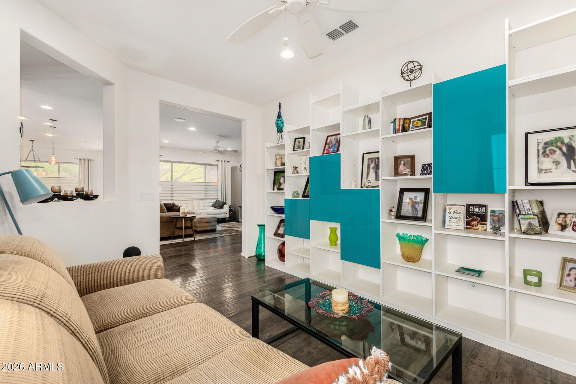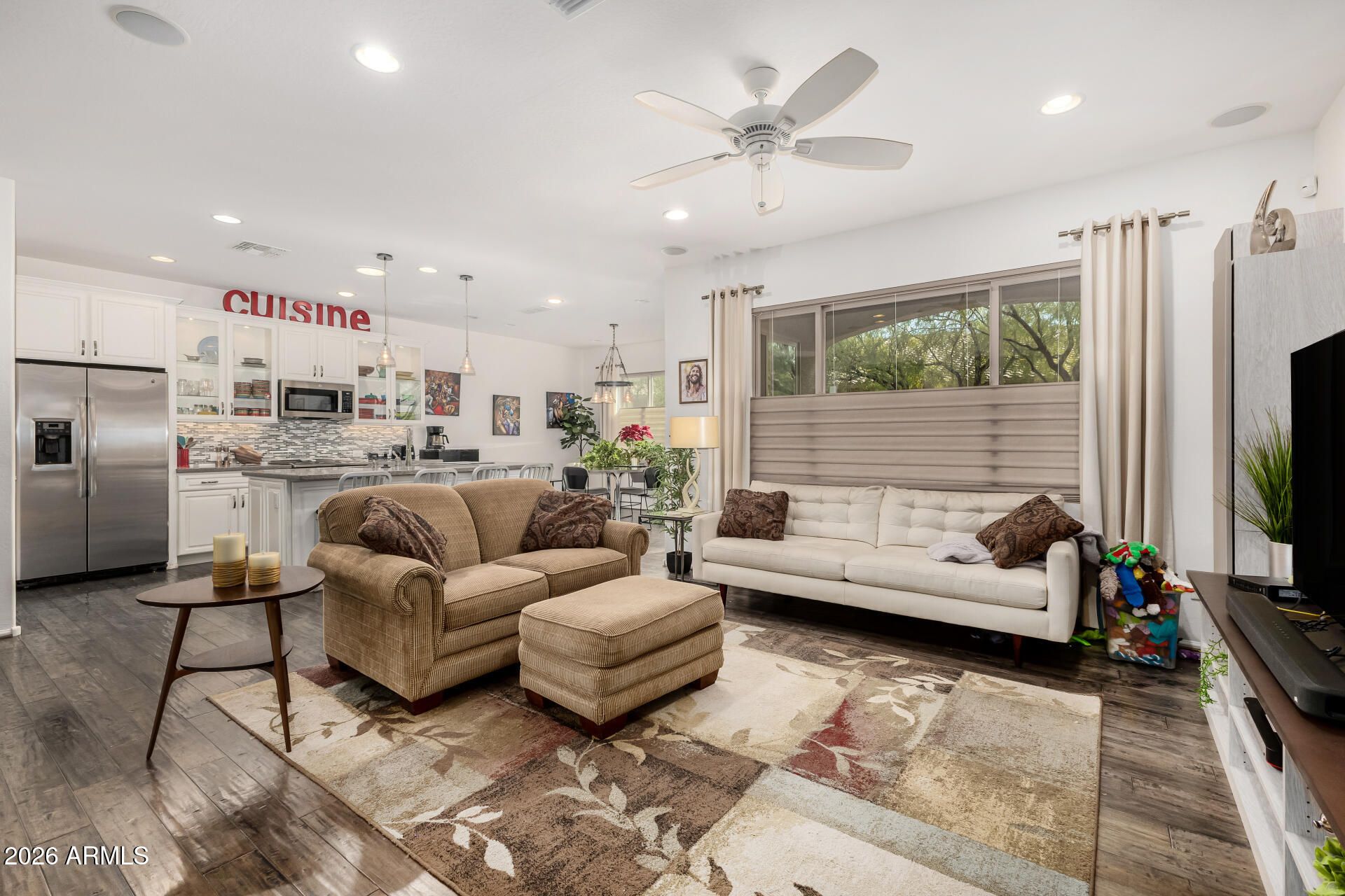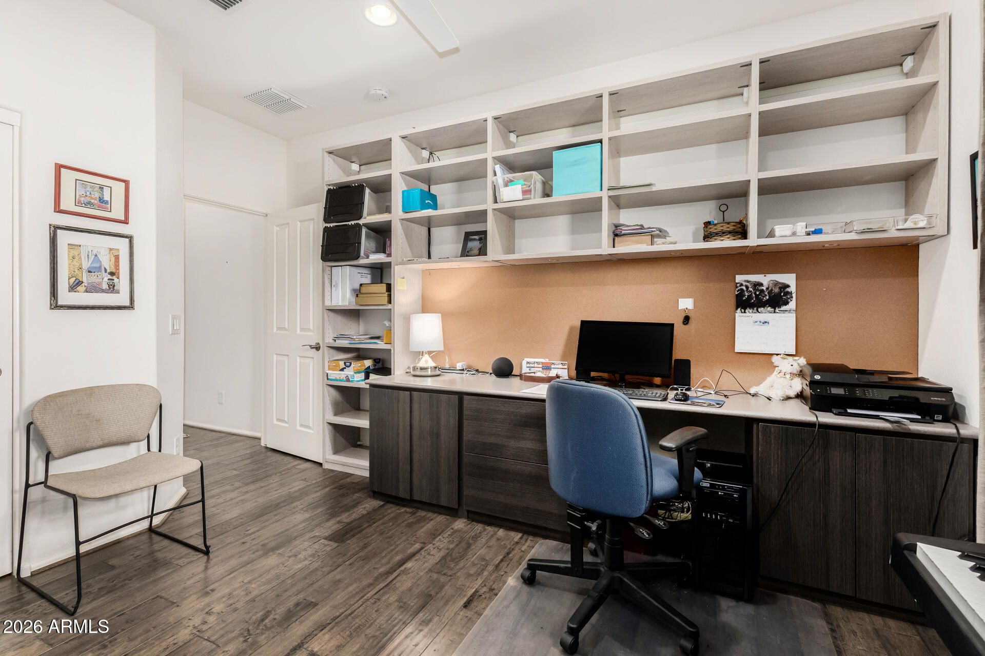 Furnished 2-bedroom, Den, 2 Bath home in Robson Ranch! Thoughtfully designed, the interior showcases an open floor plan with wood floors, contemporary lighting, premium home theater package w/speakers, perfect for entertaining, and stylish neutral tones. The kitchen comes equipped with ample cabinets, tile backsplash, stone counters, SS appliances, and an island. The serene main bedroom promises a good night's rest and features a walk-in closet and a bathroom with dual sinks. You'll find built-in shelves in the den, making it perfect for a home office. Out back, you can enjoy peaceful evenings under the cozy covered patio with well-laid pavers. Don't forget to visit the community's pool, spa, golf, clubhouse, and other amenities to fill your days with fun! Make this gem yours now, So many upgardes such as 42" white Maple cabinets w/upper & under cabinet lighting, new microwave, new dishwasher, soft close drawers, roll out shelves, high end appliances, pendant lights & backsplash. Remote controlled blinds, 4 solar tubes, custom closet systems. Guest bedroom with a Queen Size Murphy Bed. Garage has recirculating pump, water softener, epoxy flooring & built in cabinets. Note - ice-maker does not work.