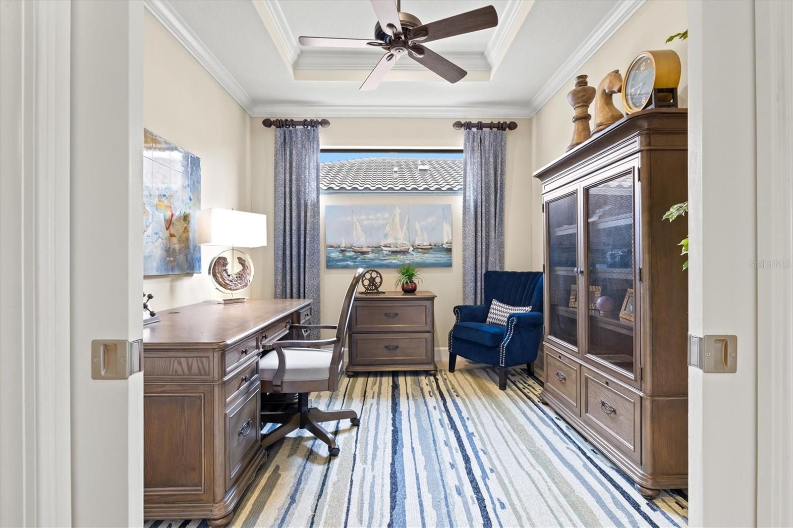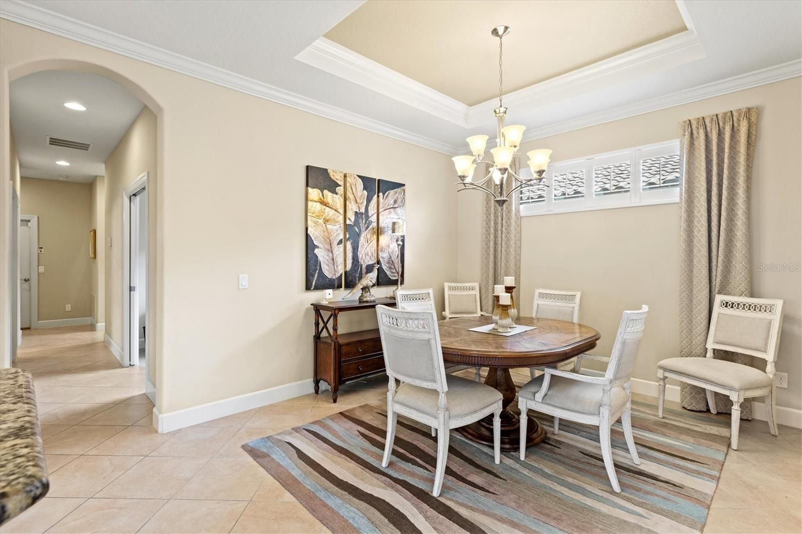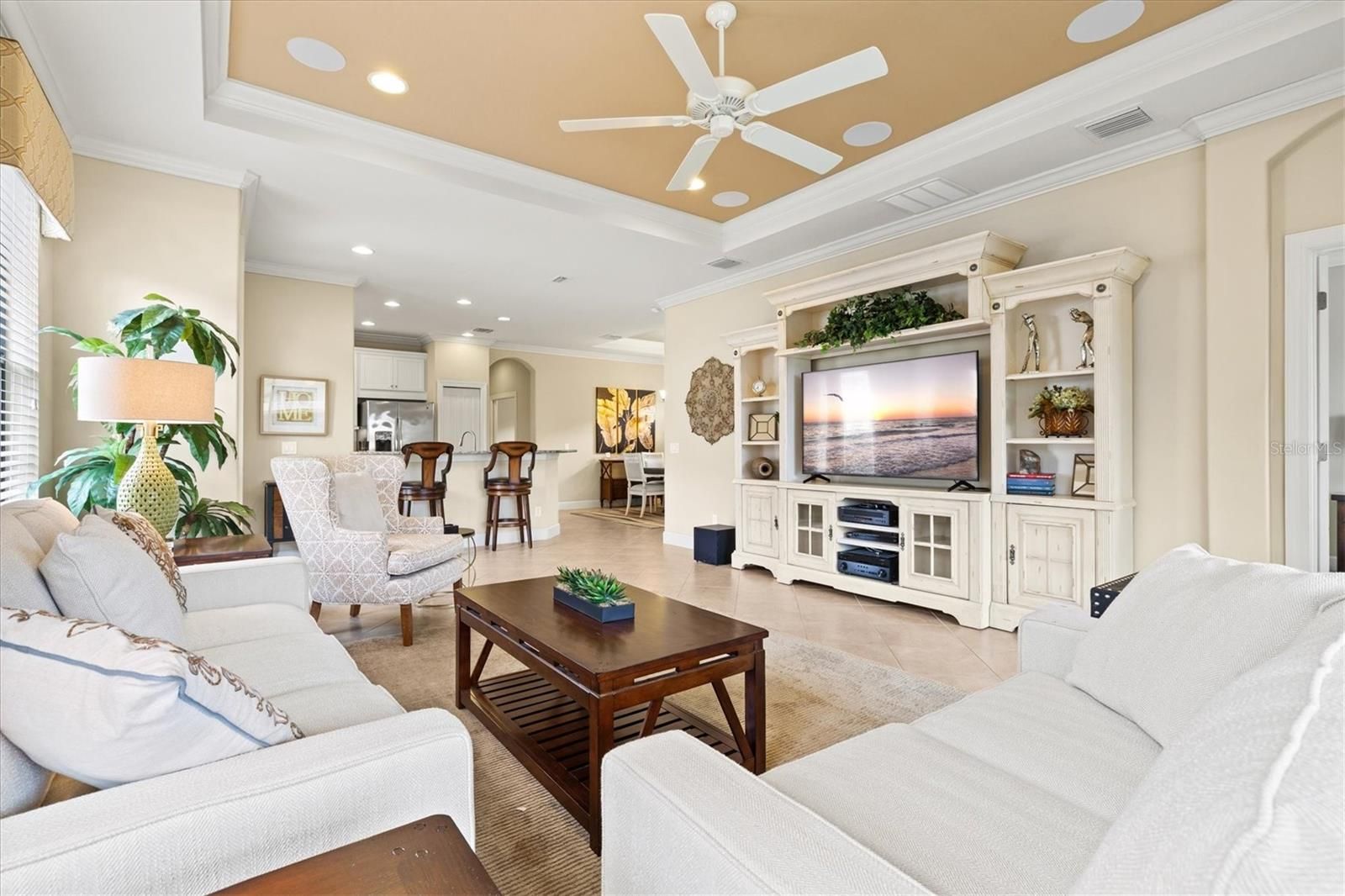 - Ceiling Fan(s), Crown Molding, Eat-in Kitchen, High Ceilings, Kitchen/Family Room Combo, Open Floorplan, Main Level Primary, Solid Surface Counters, Split Bedrooms, Tray Ceiling(s), Window Treatments