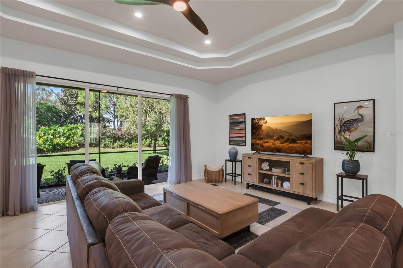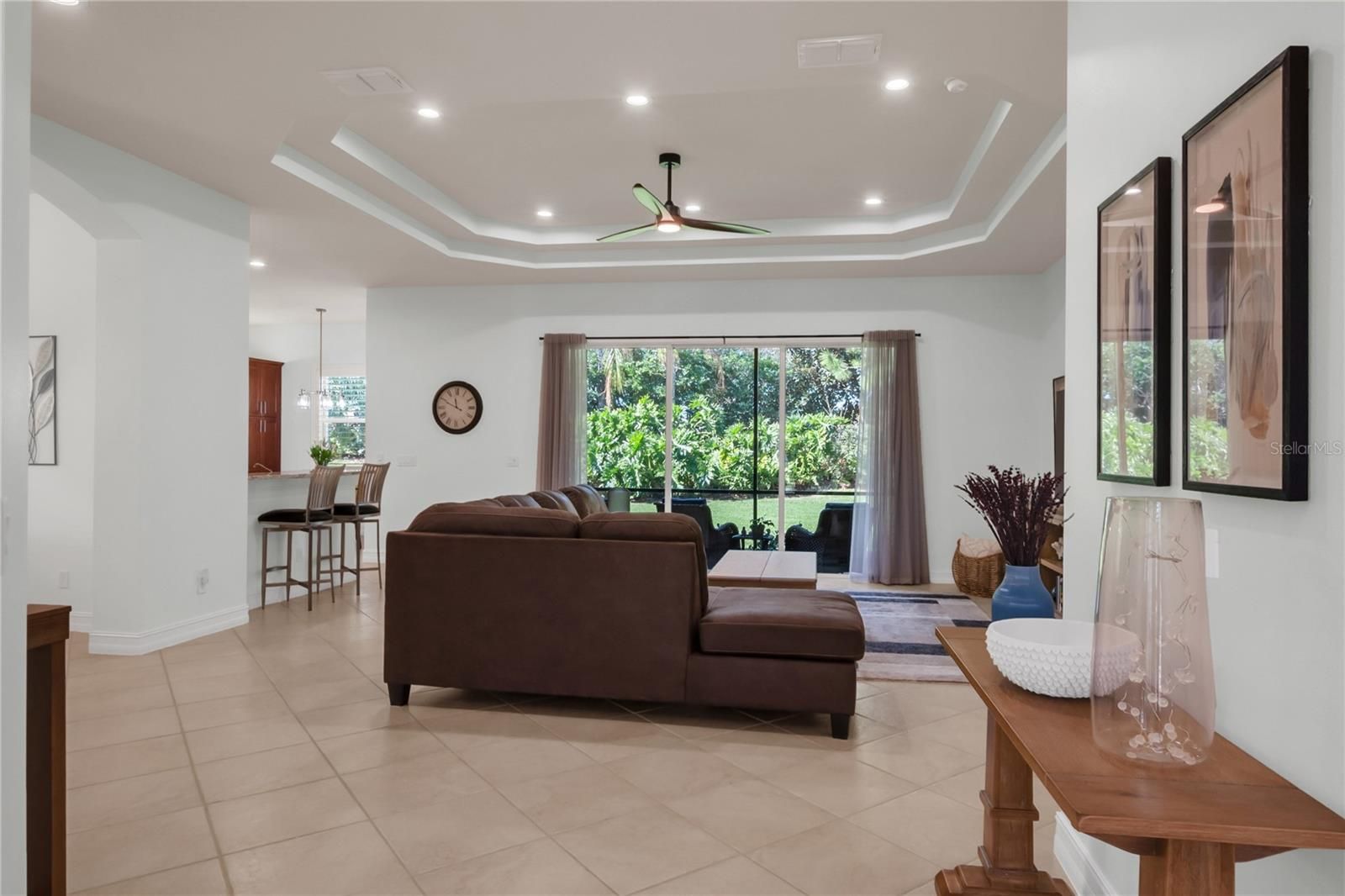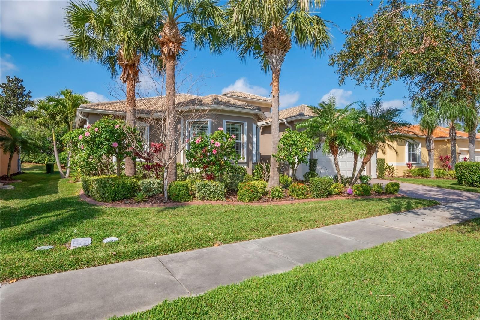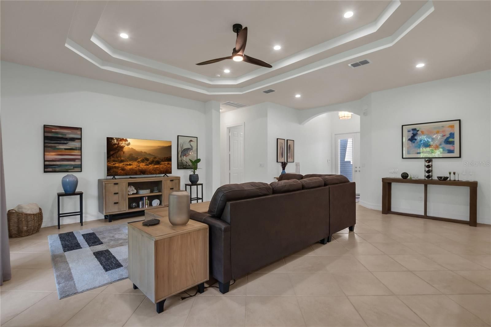 This immaculate, move-in-ready Livorno floor plan offers the perfect blend of comfort and elegance with three bedrooms, two bathrooms, and a two-car garage, all set within the highly desirable 55+ resort-style community of Valencia Lakes. From the moment you arrive, the home impresses with upgraded landscaping, curbing, and a charming bay window that enhance its curb appeal. Recently installed accordion storm shutters provide added protection, and a new HVAC system ensures year-round comfort. Double eight-foot glass entry doors welcome you into a bright foyer filled with natural light and highlighted by soaring fourteen-foot ceilings. The open great room and kitchen create an ideal space for entertaining, with seamless access to the private, covered, screened lanai. The oversized backyard offers ample room to add a pool, surrounded by mature landscaping for enhanced privacy. Inside, large tile flooring runs throughout the entire home—no carpet anywhere—and the interior has been recently repainted for a fresh, airy atmosphere. A double coffered ceiling elevates the great room, adding sophistication and volume to the space. The gourmet kitchen is a chef’s dream, featuring 42-inch maple cabinetry with new hardware, glass cabinet doors with down lighting, upper and lower cabinet lighting, crown molding, granite countertops with an extended serving bar, a subway tile backsplash, upgraded stainless steel appliances including double built-in ovens and a cooktop, and a triple pantry cabinet with roll-out shelves. Additional conveniences include pot and pan drawers, a reverse osmosis system, and more. The formal dining room is perfectly positioned just off the kitchen, creating an ideal setting for gatherings and special occasions. A hallway separates the primary suite from the main living areas to provide maximum privacy. The spacious bedroom includes room for a sitting area, a coffered ceiling, and two custom-built walk-in closets. The spa-inspired bathroom features a walk-in shower with a built-in seat and floor-to-ceiling tile, a Roman soaking tub, dual vanities with granite countertops, and maple cabinetry. Two generously sized secondary bedrooms are thoughtfully split from the primary suite to enhance privacy for guests; one includes a Murphy bed for versatile use. The laundry room offers additional storage with upper cabinets, a new utility sink and cabinet, and high-end washer and dryer. This home is filled with thoughtful upgrades, including an in-ground termite control system, a water softener, reverse osmosis in the kitchen, a newer water heater, rain gutters, a new disposal, designer light fixtures, LED recessed lighting, premium ceiling fans, custom window treatments, plantation shutters, double glass entry doors, overhead storage racks in the garage, and a dedicated outlet in garage for electric vehicle. Certain furniture and furnishings available.) Valencia Lakes delivers an unparalleled lifestyle with a 40,000-square-foot clubhouse, resort-style pools, card rooms, a fitness center, arts facilities, clubs, tennis, bocce ball, pickleball, and abundant green space. Residents enjoy walking, biking, swimming, and full golf cart access throughout the community. The monthly HOA fee covers clubhouse membership, cable TV, internet, security system monitoring, and lawn maintenance and irrigation. Experience exceptional comfort, luxury, and convenience—this stunning home invites you to start living the dream today.
