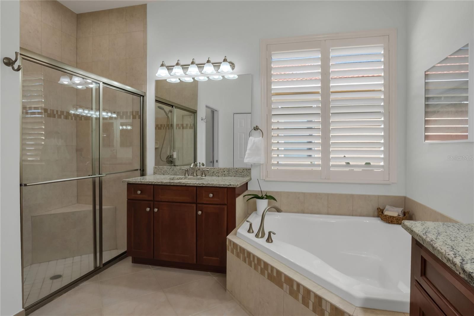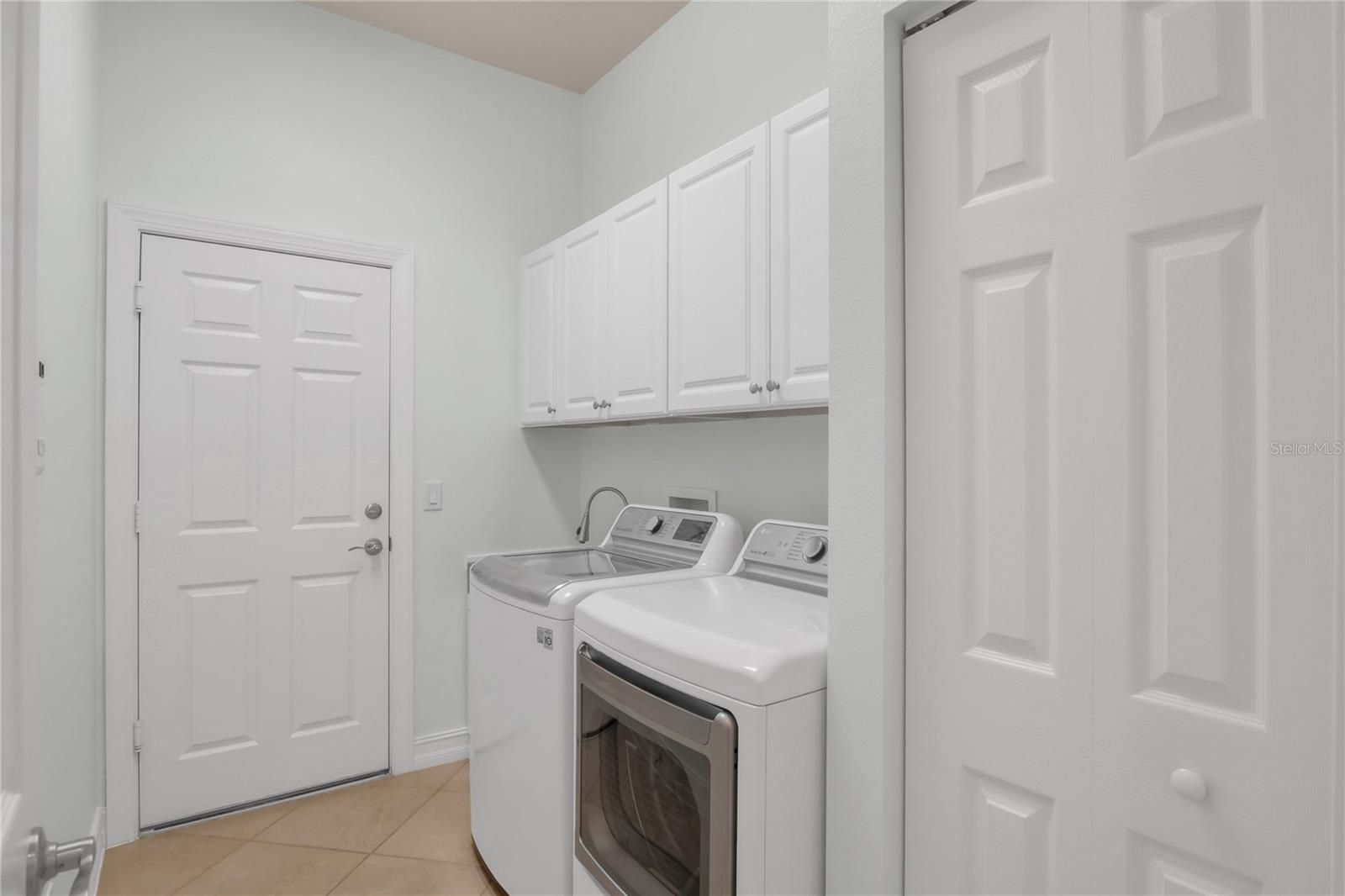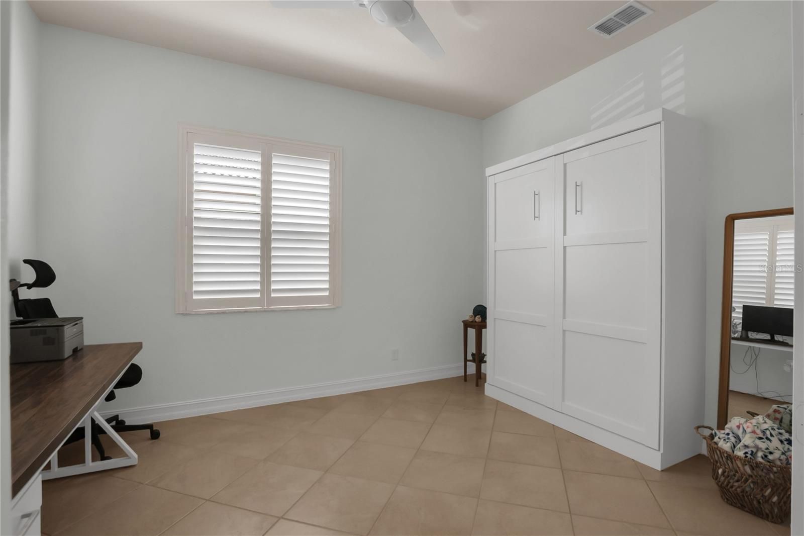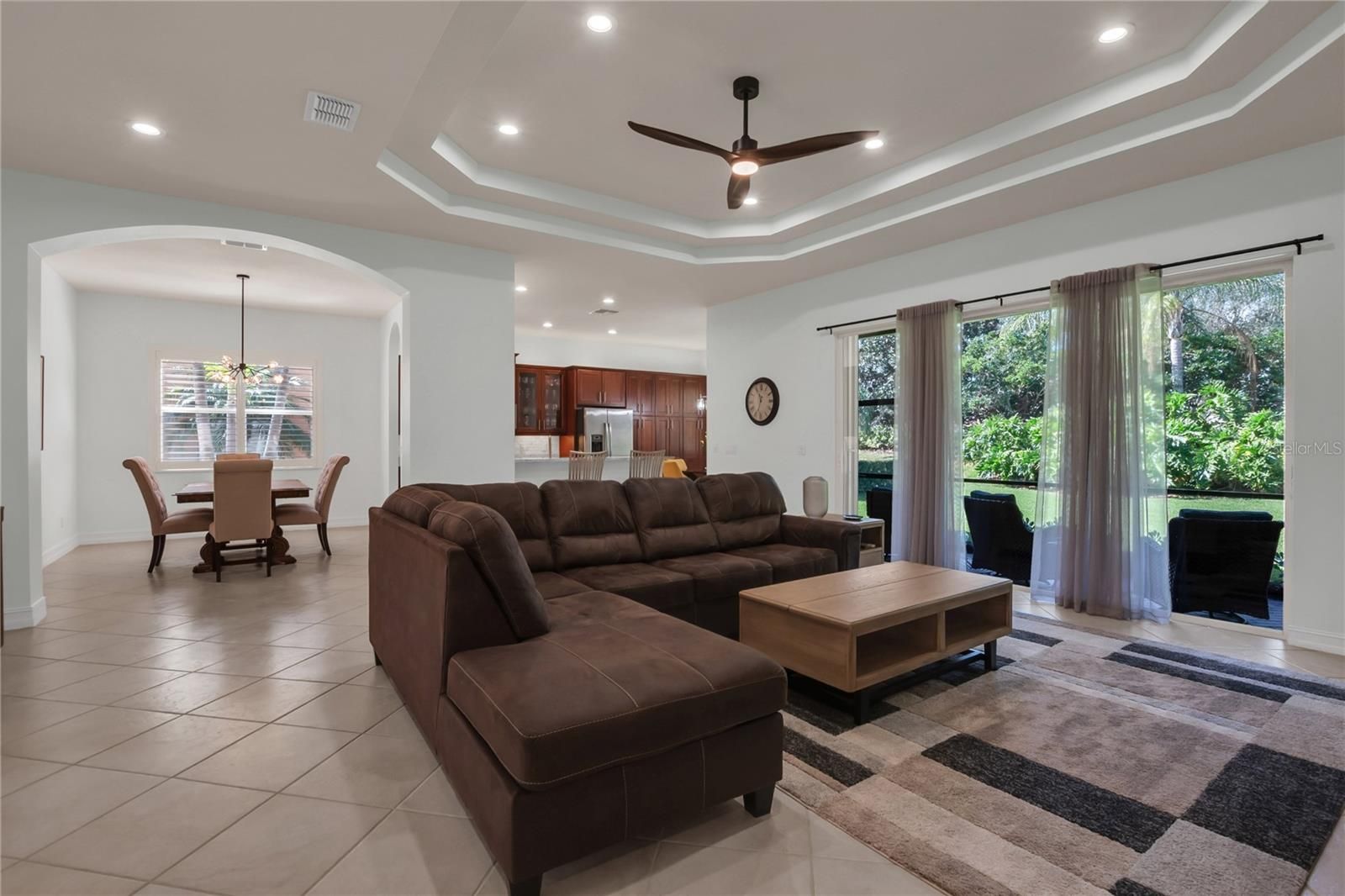 This immaculate, move-in-ready Livorno floor plan offers the perfect blend of comfort and elegance with three bedrooms, two bathrooms, and a two-car garage, all set within the highly desirable 55+ resort-style community of Valencia Lakes. From the moment you arrive, the home impresses with upgraded landscaping, curbing, and a charming bay window that enhance its curb appeal. Recently installed accordion storm shutters provide added protection, and a new HVAC system ensures year-round comfort. Double eight-foot glass entry doors welcome you into a bright foyer filled with natural light and highlighted by soaring fourteen-foot ceilings. The open great room and kitchen create an ideal space for entertaining, with seamless access to the private, covered, screened lanai. The oversized backyard offers ample room to add a pool, surrounded by mature landscaping for enhanced privacy. Inside, large tile flooring runs throughout the entire home—no carpet anywhere—and the interior has been recently repainted for a fresh, airy atmosphere. A double coffered ceiling elevates the great room, adding sophistication and volume to the space. The gourmet kitchen is a chef’s dream, featuring 42-inch maple cabinetry with new hardware, glass cabinet doors with down lighting, upper and lower cabinet lighting, crown molding, granite countertops with an extended serving bar, a subway tile backsplash, upgraded stainless steel appliances including double built-in ovens and a cooktop, and a triple pantry cabinet with roll-out shelves. Additional conveniences include pot and pan drawers, a reverse osmosis system, and more. The formal dining room is perfectly positioned just off the kitchen, creating an ideal setting for gatherings and special occasions. A hallway separates the primary suite from the main living areas to provide maximum privacy. The spacious bedroom includes room for a sitting area, a coffered ceiling, and two custom-built walk-in closets. The spa-inspired bathroom features a walk-in shower with a built-in seat and floor-to-ceiling tile, a Roman soaking tub, dual vanities with granite countertops, and maple cabinetry. Two generously sized secondary bedrooms are thoughtfully split from the primary suite to enhance privacy for guests; one includes a Murphy bed for versatile use. The laundry room offers additional storage with upper cabinets, a new utility sink and cabinet, and high-end washer and dryer. This home is filled with thoughtful upgrades, including an in-ground termite control system, a water softener, reverse osmosis in the kitchen, a newer water heater, rain gutters, a new disposal, designer light fixtures, LED recessed lighting, premium ceiling fans, custom window treatments, plantation shutters, double glass entry doors, overhead storage racks in the garage, and a dedicated outlet in garage for electric vehicle. Certain furniture and furnishings available.) Valencia Lakes delivers an unparalleled lifestyle with a 40,000-square-foot clubhouse, resort-style pools, card rooms, a fitness center, arts facilities, clubs, tennis, bocce ball, pickleball, and abundant green space. Residents enjoy walking, biking, swimming, and full golf cart access throughout the community. The monthly HOA fee covers clubhouse membership, cable TV, internet, security system monitoring, and lawn maintenance and irrigation. Experience exceptional comfort, luxury, and convenience—this stunning home invites you to start living the dream today.