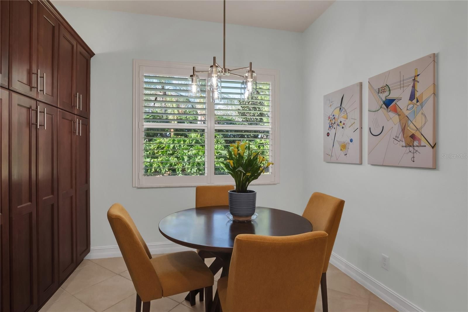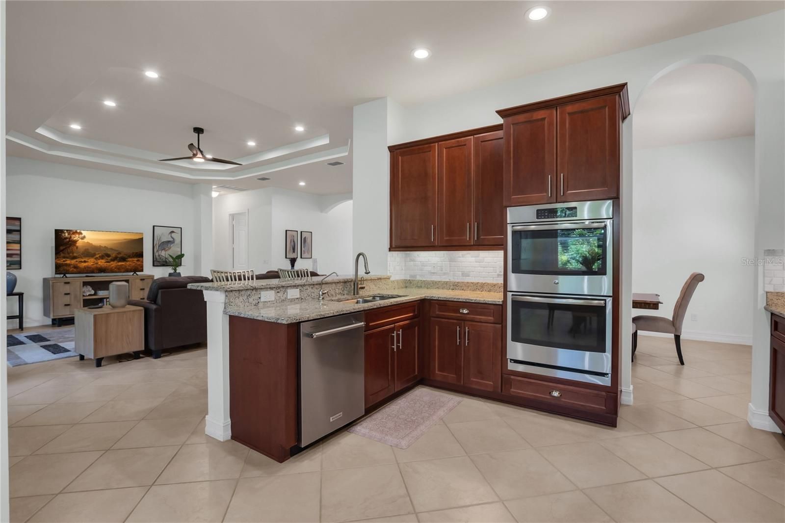 - Built-in Features, Ceiling Fan(s), Coffered Ceiling(s), Eat-in Kitchen, High Ceilings, Open Floorplan, Main Level Primary, Solid-Wood Cabinets, Split Bedrooms, Stone Counters, Thermostat, Walk-In Closet(s), Window Treatments