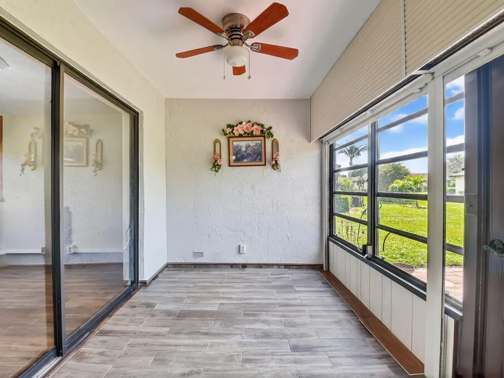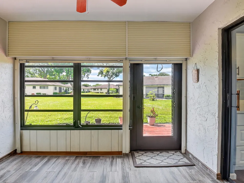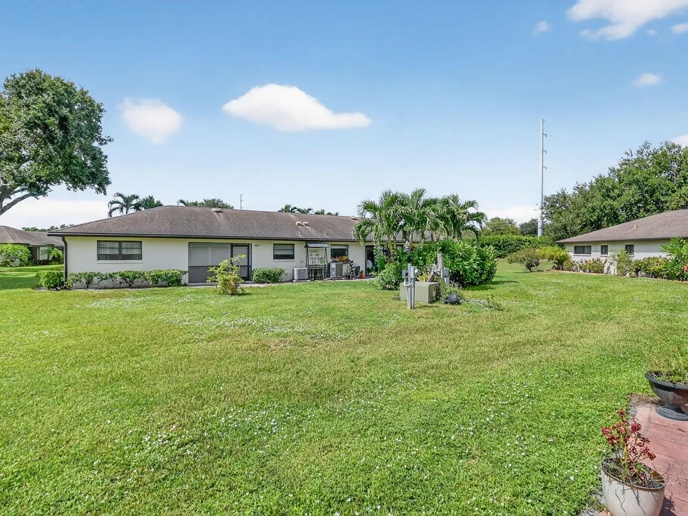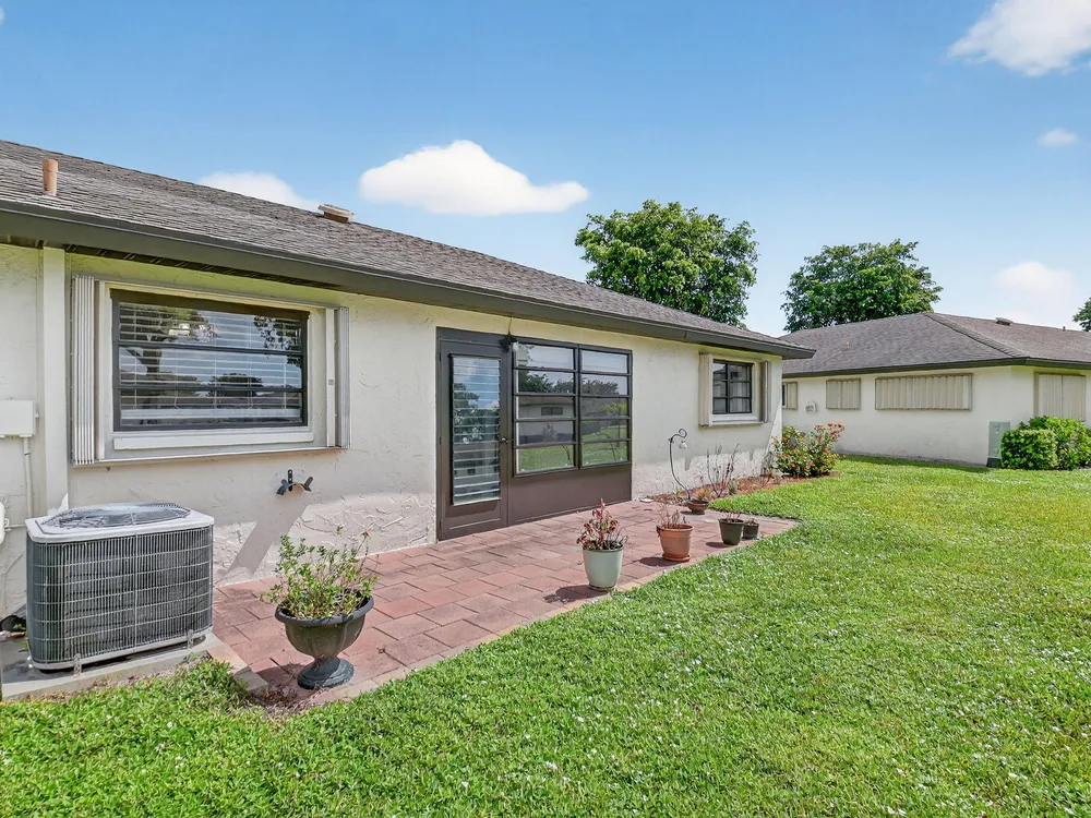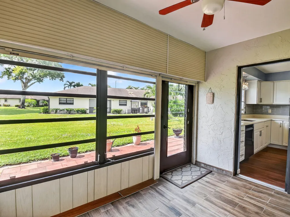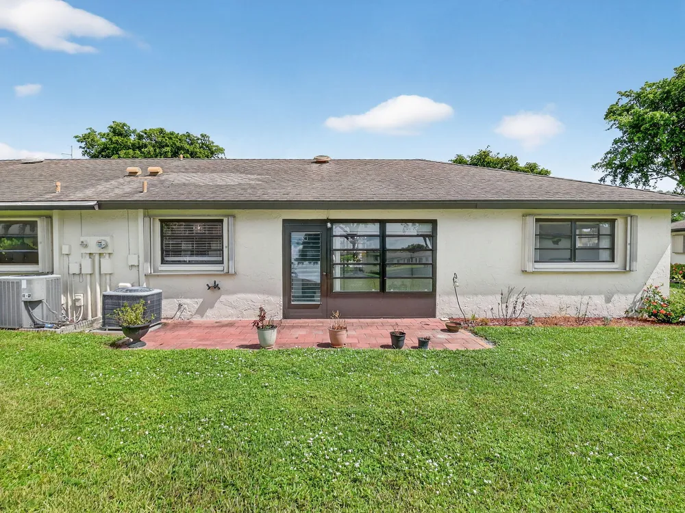 Stunningly upgraded Greentree Villa in the perfect location! This villa features a bright, modern kitchen with white shaker cabinets, quartz countertops, a movable island with extra storage, and brand-new stainless steel appliances. Both bathrooms have been beautifully remodeled, offering a fresh and stylish look throughout. The fully enclosed Florida Room has been leveled with the main living area, providing a seamless open floor plan. For peace of mind, accordion shutters offer maximum storm protection. Outside, enjoy a private patio with plenty of green space behind it--perfect for relaxing or entertaining. Additional updates include a 4-year-old water heater and an AC system installed in 2018, making this home truly move-in ready. Schedule your showing today!