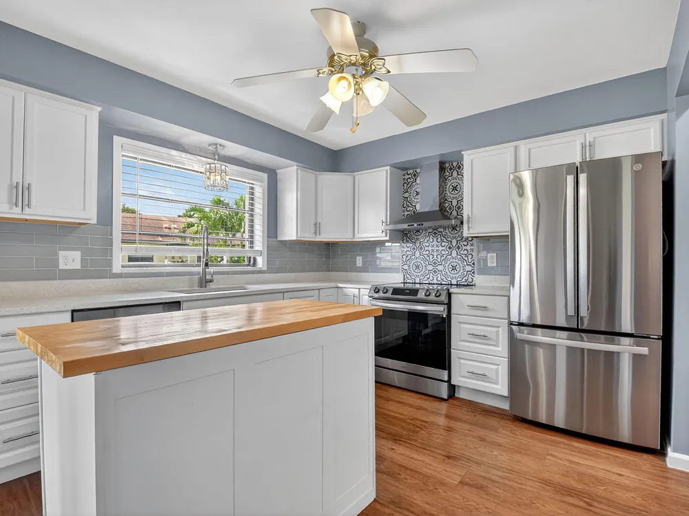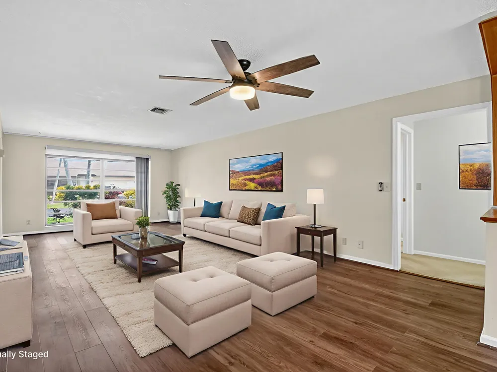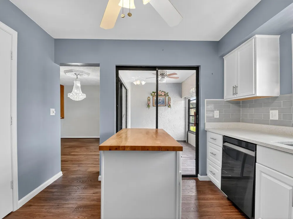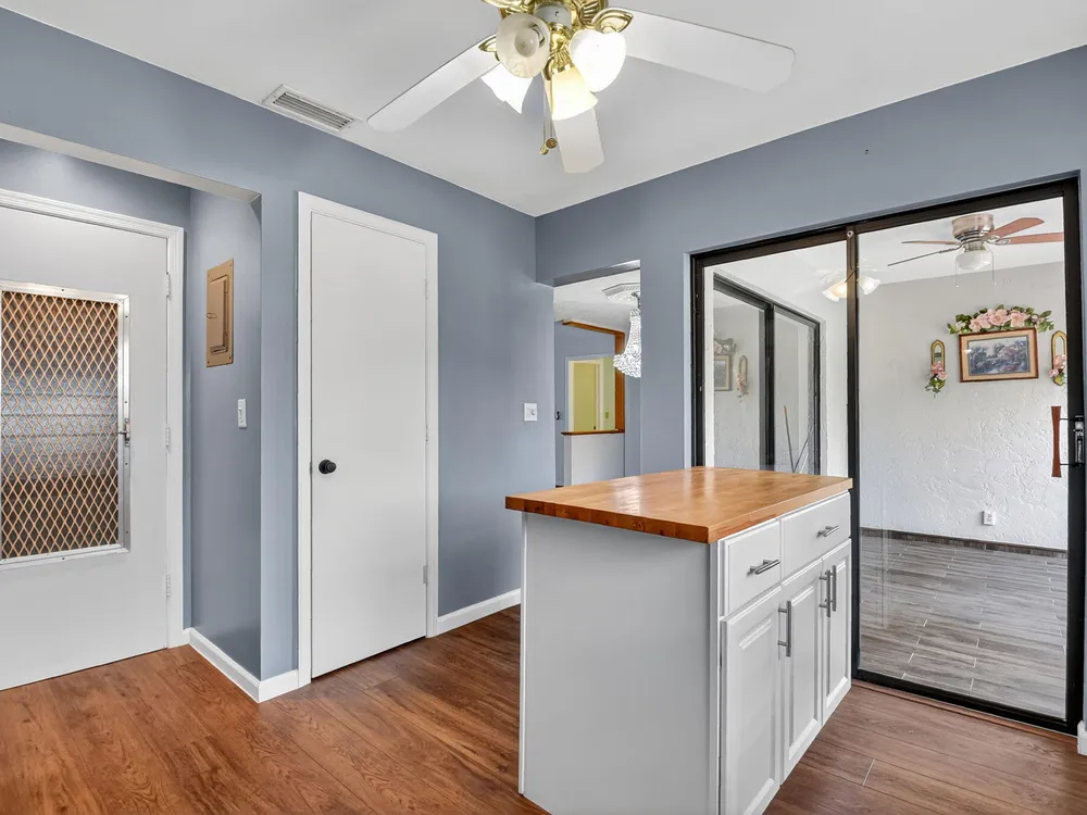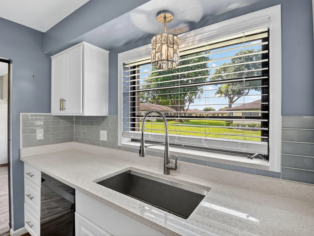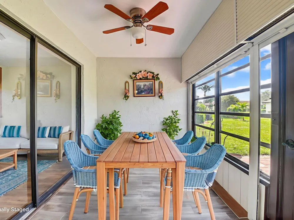 Stunningly upgraded Greentree Villa in the perfect location! This villa features a bright, modern kitchen with white shaker cabinets, quartz countertops, a movable island with extra storage, and brand-new stainless steel appliances. Both bathrooms have been beautifully remodeled, offering a fresh and stylish look throughout. The fully enclosed Florida Room has been leveled with the main living area, providing a seamless open floor plan. For peace of mind, accordion shutters offer maximum storm protection. Outside, enjoy a private patio with plenty of green space behind it--perfect for relaxing or entertaining. Additional updates include a 4-year-old water heater and an AC system installed in 2018, making this home truly move-in ready. Schedule your showing today!