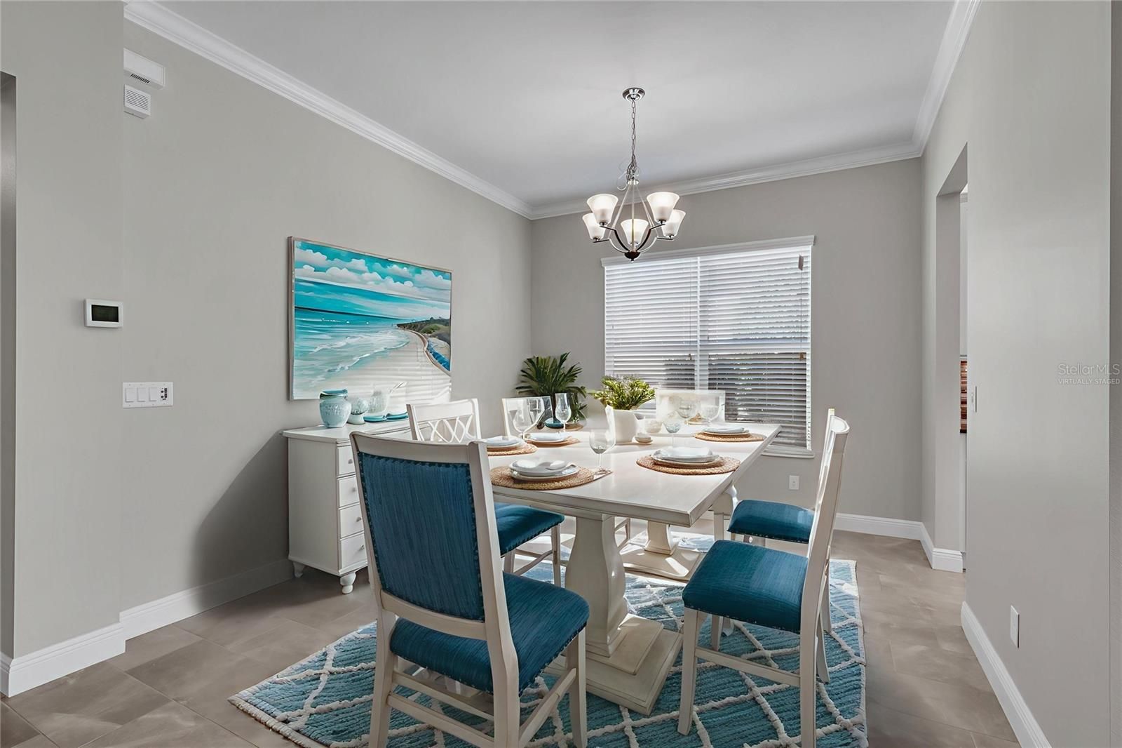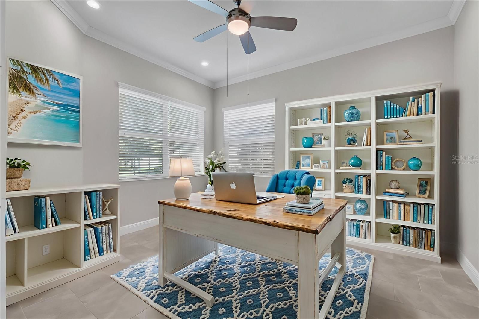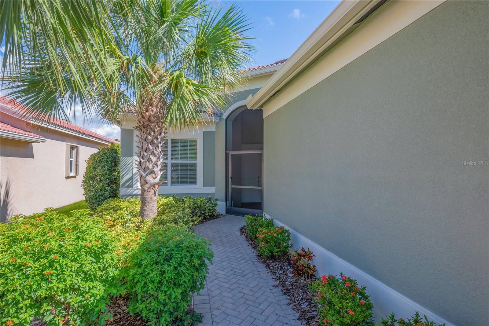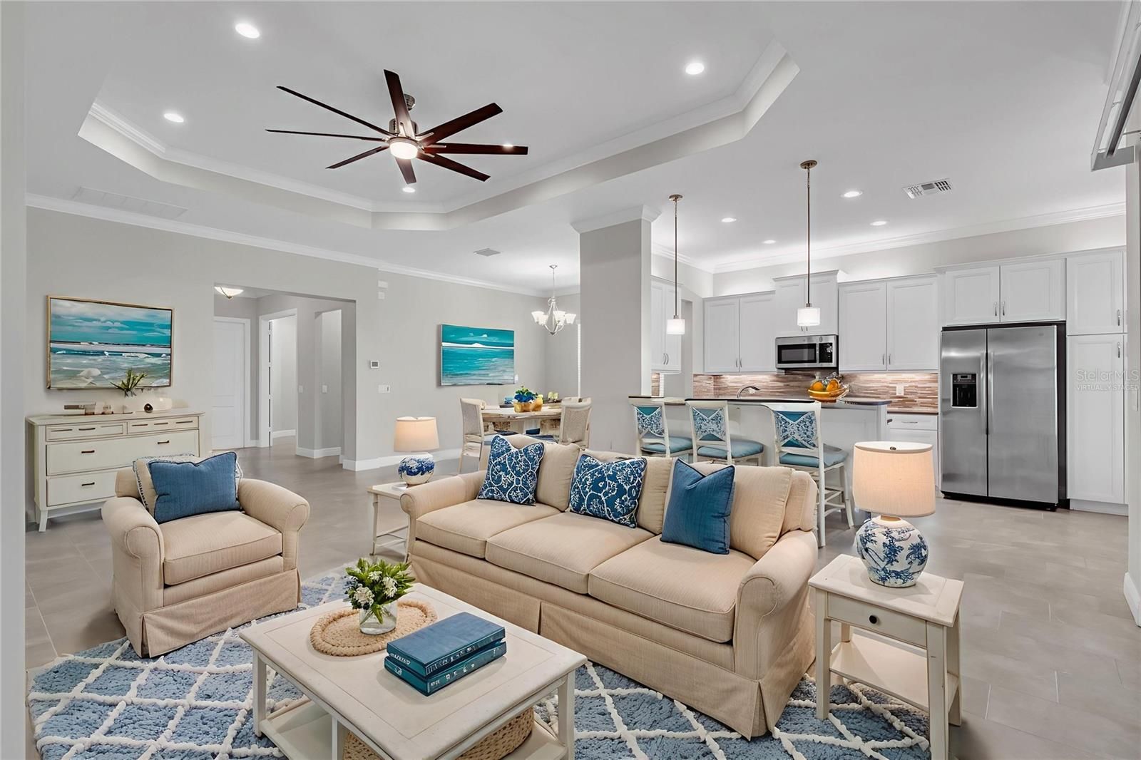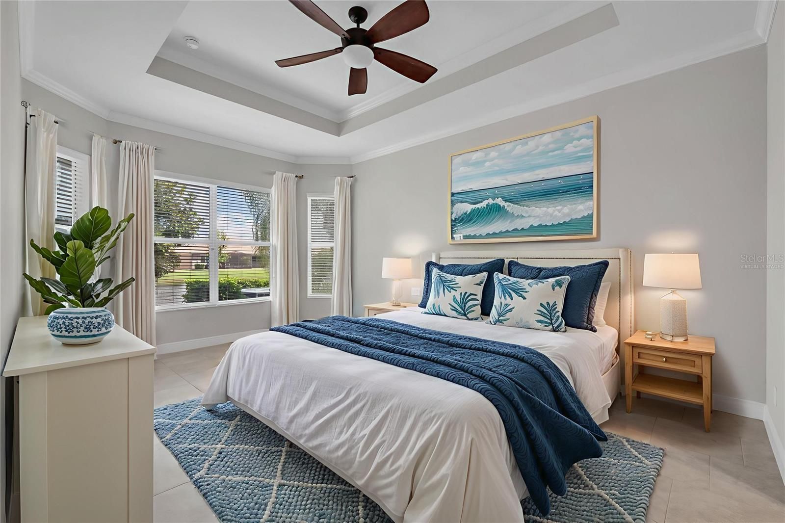 One or more photo(s) has been virtually staged. Welcome to luxury living at its finest in this exquisite move-in-ready Palazzo model by GL Homes, nestled in Valencia Lakes, Tampa Bay's premier 55+ resort-style community. This immaculate home offers a spectacular waterfront setting, enjoyed best from the extended screened lanai—a tranquil space perfect for morning coffee or evening sunsets. From the moment you arrive, the brick paver driveway and walkway, barrel tile roof, and lush landscaping with lighting create stunning curb appeal and a warm welcome home. Step through the double 8-foot entry doors into a grand foyer with 11-foot coffered ceilings and crown molding, setting the tone for the refined style throughout. With 3 spacious bedrooms, a large den that can serve as a fourth bedroom, 2.5 bathrooms, and a 2.5 car garage, this home provides both luxury and functionality. The open concept floorplan includes a great room with a coffered ceiling and striking 12x24 porcelain tile laid in a waterfall pattern, seamlessly connecting to the gourmet kitchen, casual dining area, and formal dining space. The chef's kitchen is a true showstopper, featuring quartz countertops, undermount stainless steel sink, 42” soft-close white maple cabinetry, designer glass backsplash, under and over-cabinet lighting, and premium stainless steel appliances. There’s also a triple cabinet pantry with roll-out shelves, pull-out trash system, and cabinet paneling package for a clean, custom look. For more formal gatherings, the dedicated dining room is conveniently located just off the kitchen. Retreat to the luxurious primary suite, complete with coffered ceiling, two large walk-in closets, tile flooring, and a sitting bay window overlooking the private water view. The primary bath is equally impressive, offering dual vanities, quartz countertops, shaker-style cabinets, and a walk-in shower with a built-in seat and tile to the ceiling. Guest bedrooms are privately situated on the opposite side of the home for optimal privacy. The oversized den with double 8-foot entry doors and tile flooring offers versatility as a home office, media room, or extra guest space. The second full bathroom features quartz counters with a banjo top, upgraded white cabinetry, and a tiled tub/shower combo. A conveniently located powder room includes a built-in linen closet, white cabinets and quartz counters. The laundry room features white cabinetry, a utility sink, and upgraded washer and dryer with direct access to the over-sized garage. This home comes with many upgrades, including designer lighting and ceiling fans, whole house water softener and filtration system, epoxy garage flooring, overhead garage storage racks, extended screened lanai with paver extension, gutters, additional landscaping and more. Beyond your doorstep lies the unmatched lifestyle of Valencia Lakes—a gated, vibrant community with a 40,000 sq. ft. clubhouse, 24-hour fitness center, resort-style pools, on-site bistro, pickleball and tennis courts, bocce ball, walking trails, clubs, live entertainment, arts and crafts, cooking classes, and so much more. Don't miss your chance to own this exceptional home in one of the most sought-after active adult communities in the Greater Tampa Bay area. Schedule your private showing today and start living your best life at Valencia Lakes.