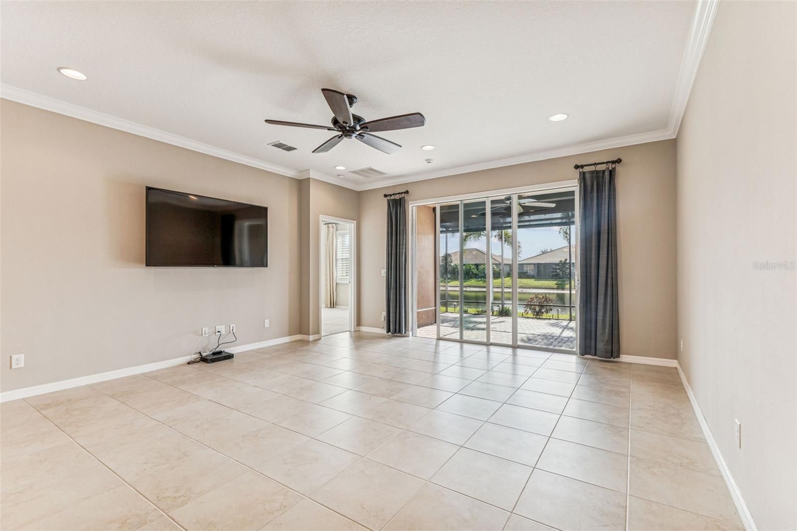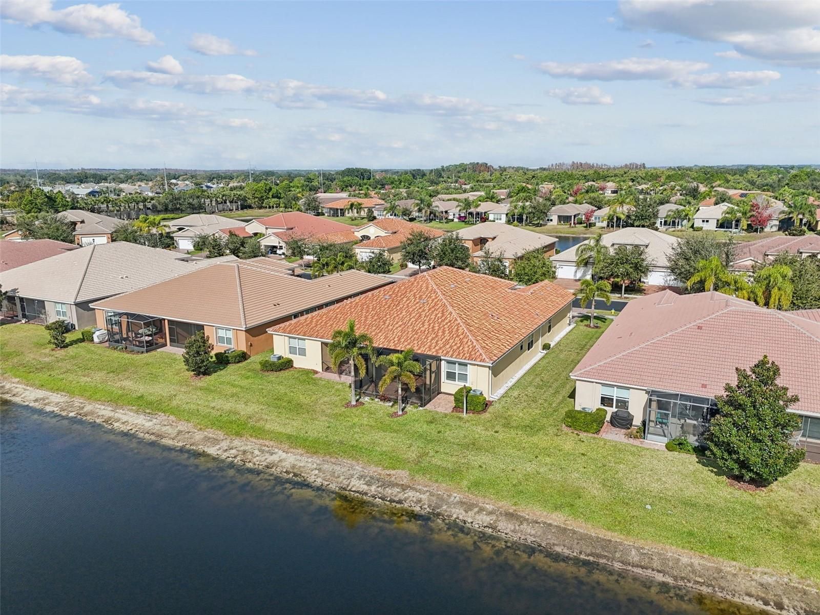 Spectacular views are yours from this 2 bdrm and den/3rd bdrm, 2 bath exemplary Julia model from the renowned GL Homes Regal Twin Villas Collection located in the newest section of Valencia Lakes. The back of the house provides a serene water view, and the front offers lush curb appeal with a widened driveway and paved landscaping borders. Hardwired lights illuminate the yard at night. A large screened front patio creates an additional private outdoor space to relax/entertain on lovely Florida days. A 12’ high ceiling in the elegant foyer leads to the heart of the home with an open floor concept that is ideal for both daily living and entertainment. High-end ceramic tiles are installed in all main areas. Engineered hardwood floors are in the den/3rd bdrm and upgraded carpeting in pristine condition is in 2 brms. Crown molding, enhancing the main areas, and plantation shutters plus electric blinds over the sliding door leading to the lanai, add even more charm and quality to this home. Large gourmet kitchen has granite countertops offering an 18” extended serving bar with high quality natural glass/stone linear backsplash and upgraded stainless style appliances including a stove, microwave, dishwasher and double door refrigerator. The 42" wood cabinets with crown molding feature over/under lighting, sliding drawers, a custom-made cabinet pantry and large pots and pans drawers. The kitchen offers a sizable breakfast area with space for informal dining. There is a dedicated space for a formal dining room that could sit at least 8-10 persons. The large primary bedroom in the back of the house, designed as a private en-suite, offers 2 walk-in closets with tastefully designed built-in cabinetry. The luxurious bath has two separate vanities with lots of cabinet space and drawers. The glass door shower features floor-to-ceiling tiles installed with a decorative listello and a corner built-in bench for both comfort and mobility. 2nd bdrm and the guest bath are located in the front section of the house, away from the main areas, providing additional comfort and privacy for you and your guests. An 8’ tall sliding door leads to a large extended screened lanai (10x20 ft) where you can enjoy lovely and breezy days with beautiful water and nature views capturing the essence of Florida living. The lanai is equipped with an additional electric sun/rain screen and lights that add a festive atmosphere at night! Interior/exterior have been recently painted. Additional features include hurricane shutters with an addition of accordion shutters added to the back of the house, water softener system, epoxy floor in the garage and plenty of storage and a 5 YR HOME WARRANTY ON ALL APPLIANCES, ELECTRICAL AND PLUMBING GOOD THROUGH 2/9/2029 transferable to new owners! Valencia Lakes is a 55 and better active adult golf cart community, 40-acre waterfront outdoor recreation area with resort-style heated pool, lap and resistance pool, 40,000 sq. ft. clubhouse, deluxe Bistro coming soon, arts and crafts studio, har-tru tennis courts, gym, half-court basketball, pickleball, bocce courts, dog park, baseball park, community garden, hundreds of clubs and activities, RV/boat parking. Over 100 acres set aside as nature preserves; enjoy the quiet and solitude of peaceful views, birds & wildlife by the water. Great sense of community with great friendly neighbors. Tampa, St. Pete and Sarasota 30-45 minutes away. Close to the airport, medical facilities, shopping and golf.