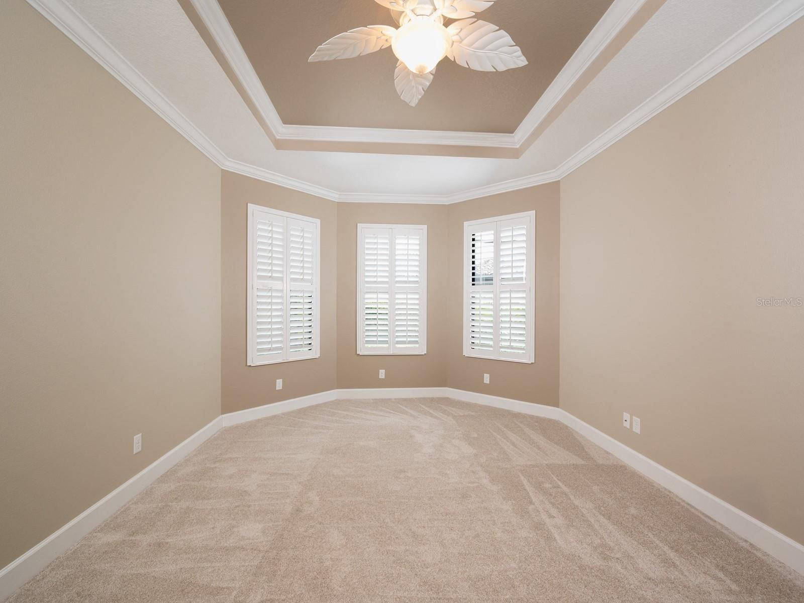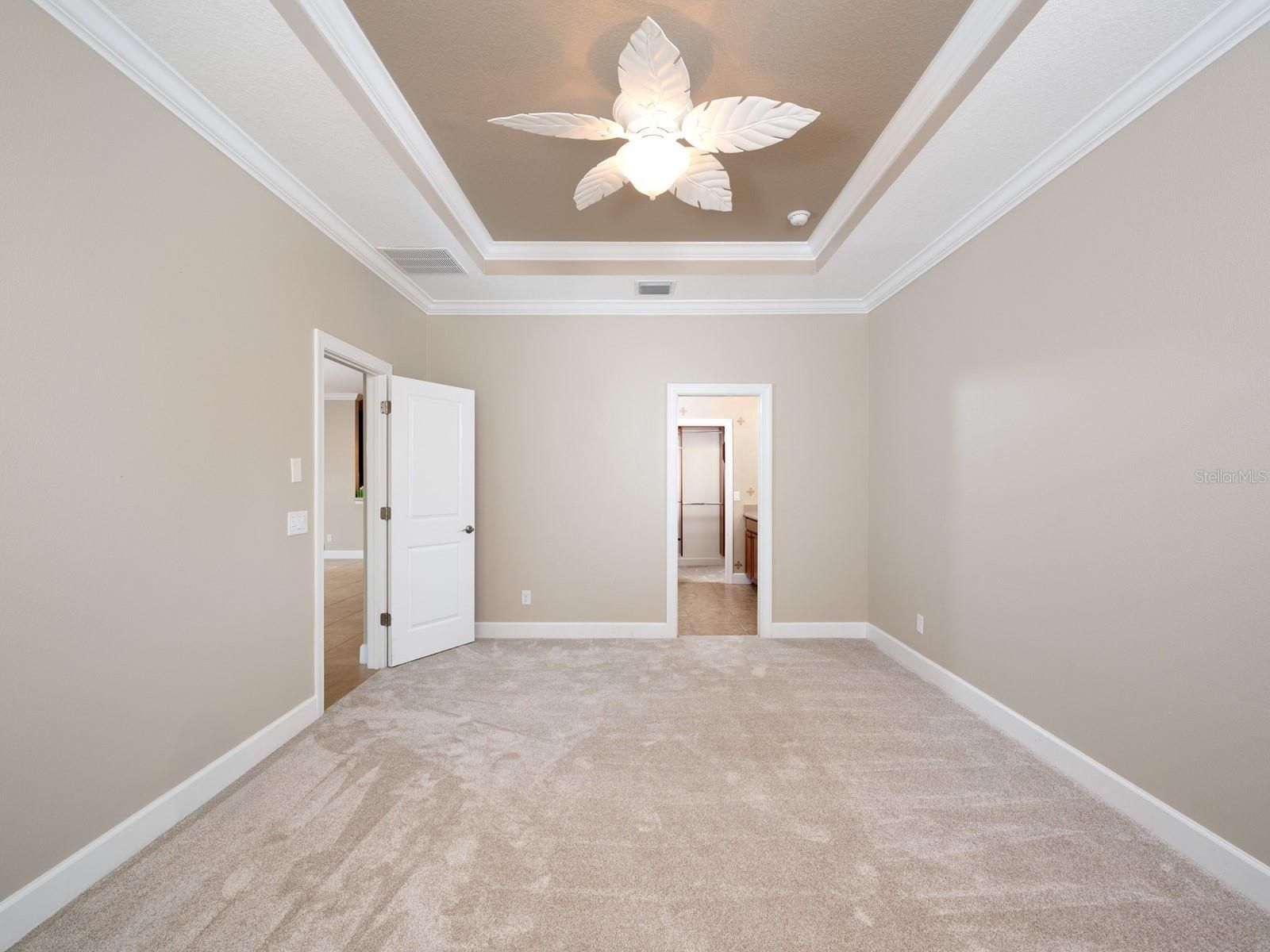 - Built-in Features, Ceiling Fan(s), Crown Molding, Eat-in Kitchen, High Ceilings, Open Floorplan, Solid Surface Counters, Solid-Wood Cabinets, Split Bedrooms, Stone Counters, Tray Ceiling(s), Walk-In Closet(s), Window Treatments