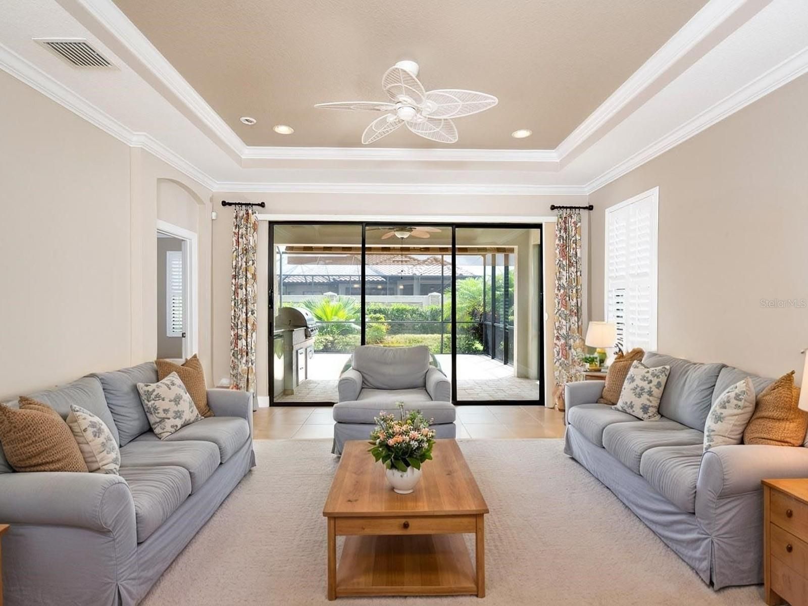 One or more photo(s) has been virtually staged. MAINTENANCE FREE! Move in now to embrace the incredible Florida lifestyle! You’ll be about a quarter of a mile from the beautiful Esplanade Golf & Country Club and less than half a mile from the exclusive Amenity Center, perfect for relaxation and recreation. This home boasts an attractive design with a 2-car garage facing southwest and a front porch oriented toward the southeast. Inside, you'll find two bedrooms, a den/study, and two bathrooms, arranged in an open floor plan that distinguishes the living area from the flex room or dining area. The architectural features of the home include elegant tray ceilings, sophisticated crown molding, striking clerestory windows, plantation shutters, recessed lighting, stylish fixtures, arched entryways, and practical pocket doors. Most rooms are finished with ceramic tiled flooring, while the bedrooms include brand-new carpet. Enjoy seamless indoor-outdoor living with beautiful triple sliding glass doors that lead to an extended, screened brick-paver lanai. An inviting outdoor space includes a covered area with an additional awning for extra shade, as well as a fully equipped summer kitchen, making it the perfect setting for entertaining or relaxing in style. The beautifully designed open kitchen offers Corian countertops, a breakfast bar, and rich wood cabinetry, all enhanced by a stylish tiled backsplash. It has a built-in pantry and a gas range that complement modern stainless-steel appliances. The den/study, or guest room provides privacy with double pocket doors. There is a front bedroom with an en suite bath and a walk-in closet featuring built-ins, which has direct access to the secondary bath. The primary suite includes a large walk-in closet with custom built-ins. The private en-suite bathroom features wood cabinetry, Corian countertops, dual sinks, a water closet, and a walk-in shower with glass doors. As a final touch, the home is finished with a well-appointed laundry room. At Esplanade at Lakewood Ranch, your fees include not only lawn mowing but also access to a variety of wonderful amenities, including a special 'Resident Only' area. This private section has its own pool, a clubhouse with a fitness center, sports courts, a fire pit, and a gazebo by the water. Additionally, there is a park and a playground for all residents to enjoy. As part of your fees, you gain access to the Esplanade Golf and Country Club. Here, you can unwind at the Health and Wellness Center, featuring a cutting-edge gym and a relaxing spa. Enjoy racquet sports such as tennis and pickleball, take advantage of the clubhouse, and dine at the culinary center. Don't miss the tropical pool complete with a tanning ledge. For golf lovers, you have the option to play on the 18-hole championship course for a fee (a golf membership is not included and is not required). Additionally, the facility includes a driving range and a pro shop. Just minutes away from I-75, making commuting north or south a breeze. The Lakewood Ranch area boasts its own Main Street, featuring charming boutique shops, dining options, and medical facilities. Additionally, it’s a short drive to the University Town Center Mall and the vibrant new Town Center at Waterside.