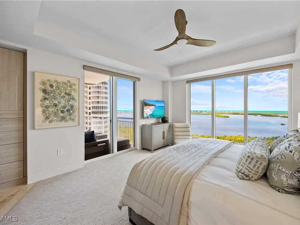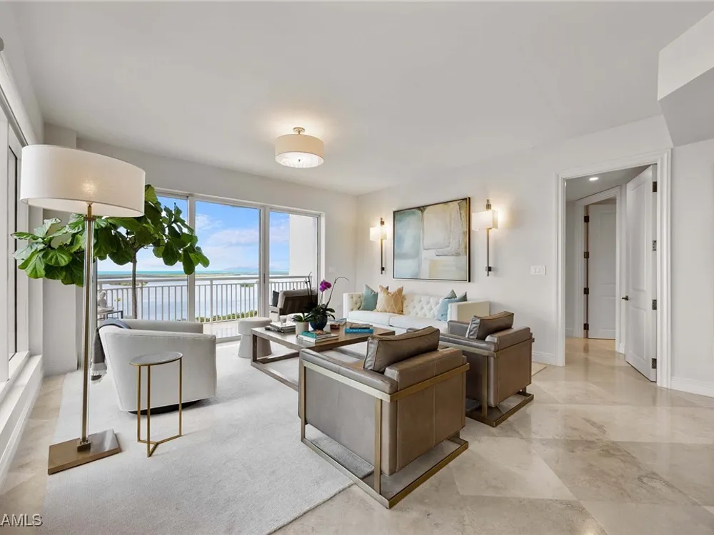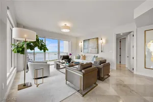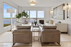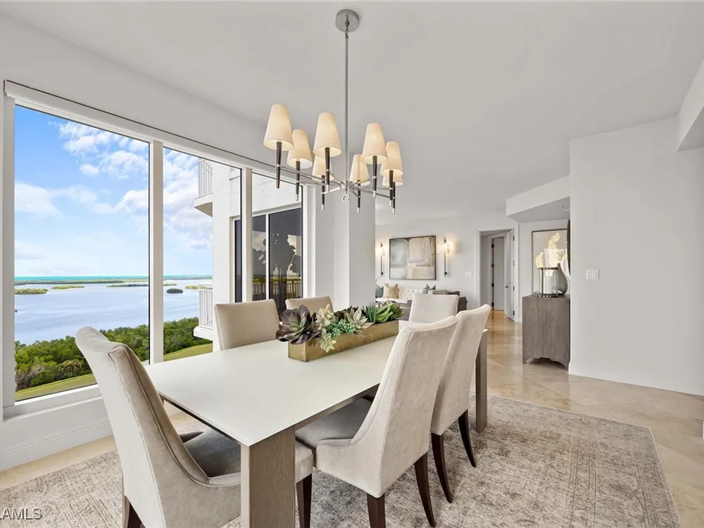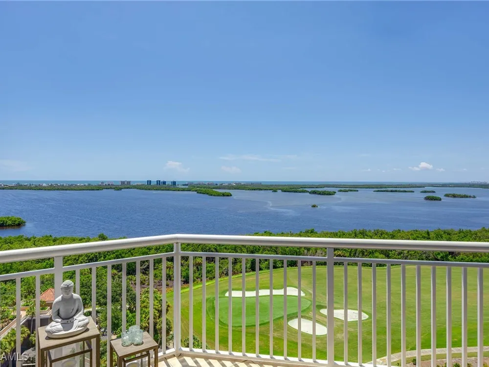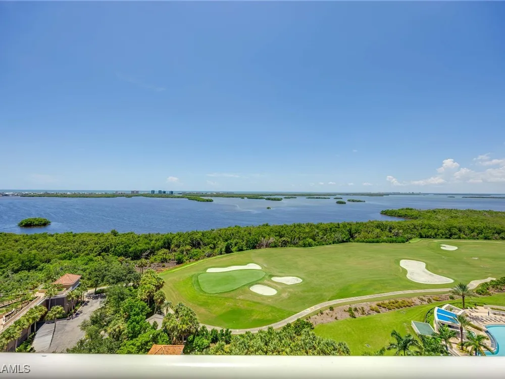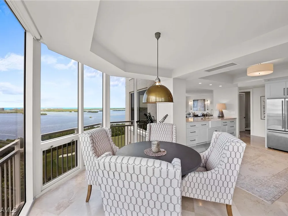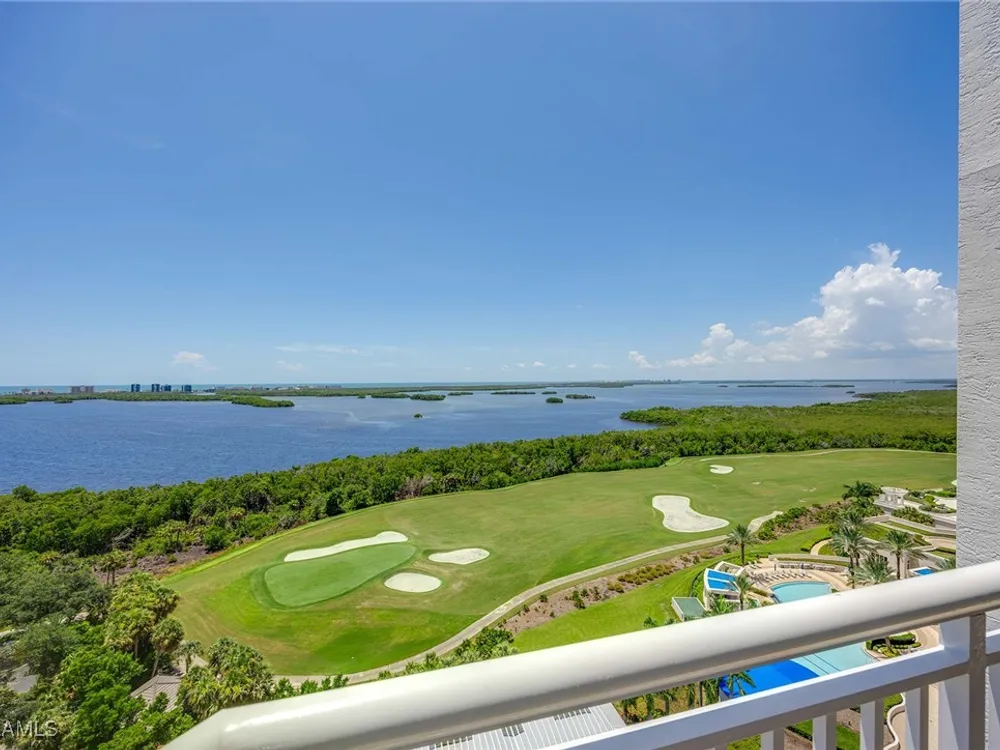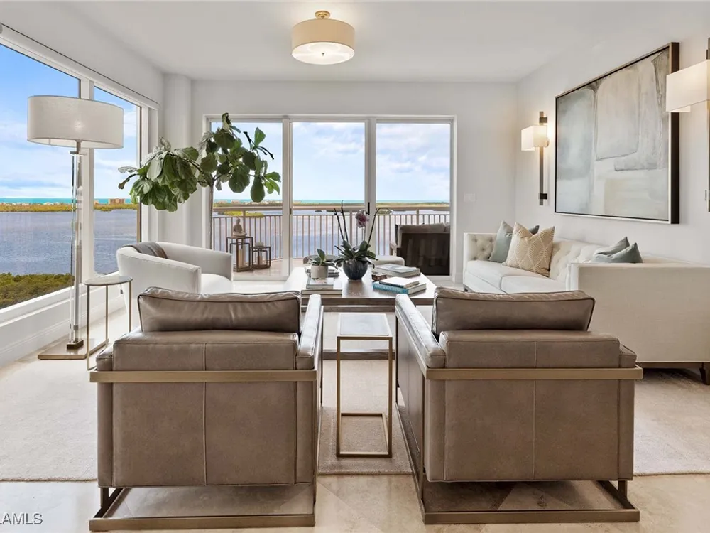 Prepare to fall in love at first sight with this extraordinary waterfront residence, where panoramic views of Estero Bay and the Gulf create an enchanting backdrop for your everyday life. This exquisite end unit, bathed in natural light, offers a move-in-ready experience with its sought-after coastal transitional design and high-end finishes throughout, all tastefully curated by a professional decorator. Enter the stunning living area, which seamlessly transitions to a covered balcony, ideal for enjoying waterfront views and sunsets. The space flows effortlessly into the elegant dining room and spacious, fully updated chef’s kitchen. It also features an impressive glass-enclosed bonus space with floor-to-ceiling windows, delivering breathtaking views of the water, golf course and community beyond. The luxurious primary suite is a sanctuary, boasting unparalleled views, a beautifully updated spa-like bath, a new custom walk-in closet and built-in storage wall. The generously sized guest room includes an updated en-suite bath and walk-in closet, while an additional bedroom, used as a den, offers versatility and convenience with a nearby updated full bath. This condominium is complete with new electric shades throughout, a secure elevator with a private entrance foyer and two garage parking spaces on the second level. Amenities include secured entry, on-site manager, resort-style pool with spa, cabana bar and grills, state-of-the-art fitness center, clubhouse, card and billiards rooms, a theater and guest suites. Bonita Bay spans 2,400 acres and features a guarded and gated entrance, a private Gulf-front beach park with shuttles, and 12 miles of recreational and biking trails. Residents enjoy three recreational parks that include a butterfly garden, bocce, tennis, pickleball, basketball, playground, picnic areas, pet water stations, and kayak/canoe launch and storage. The community also boasts over 30 resident clubs, social events and a fabulous on-site marina with the charming Backwater Jack’s Restaurant, Sweet Water Boat Club and Gulf access. Proximity to The Promenade at Bonita Bay with great dining, shopping and fabulous farmers market. Bonita Bay Club membership is optional. The club offers exceptional services, amenities and facilities, including a stunning clubhouse, restaurants, dining options from casual to fine, full-service bars and five world-class golf courses. three on the main property and two in Naples. It features practice ranges, a short game practice area, a sports center with a saltwater pool, lap lanes and a sundeck, as well as 18 Har-Tru tennis courts, 10 pickleball courts and a new croquet court. The luxurious full-service spa and salon, along with the lifestyle center's nearly 20,000 square feet dedicated to fitness, were ranked #2 in Club + Resort Business for the 2023 Top-Ranked Fitness and Wellness Experience!