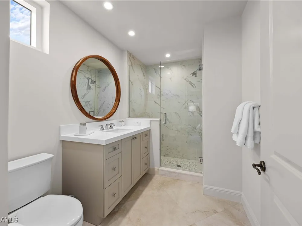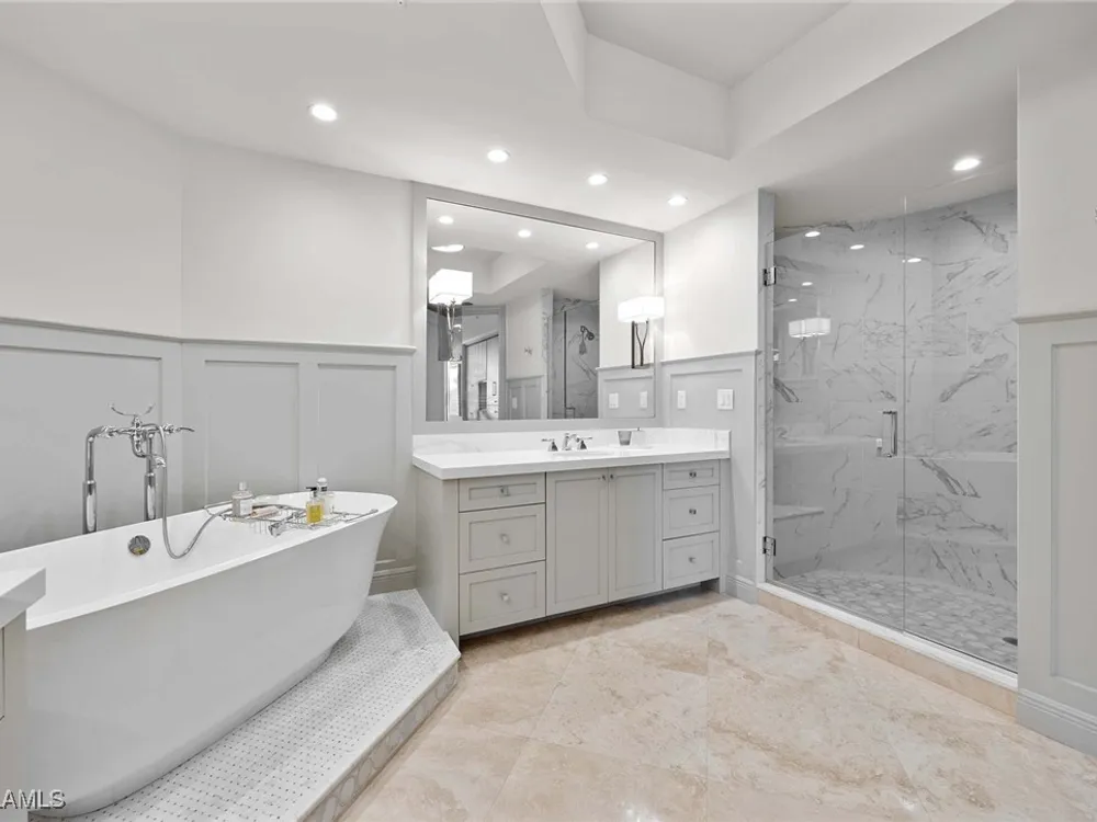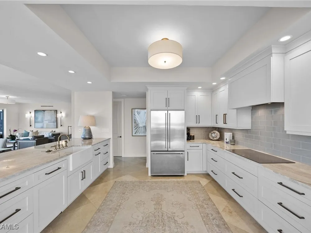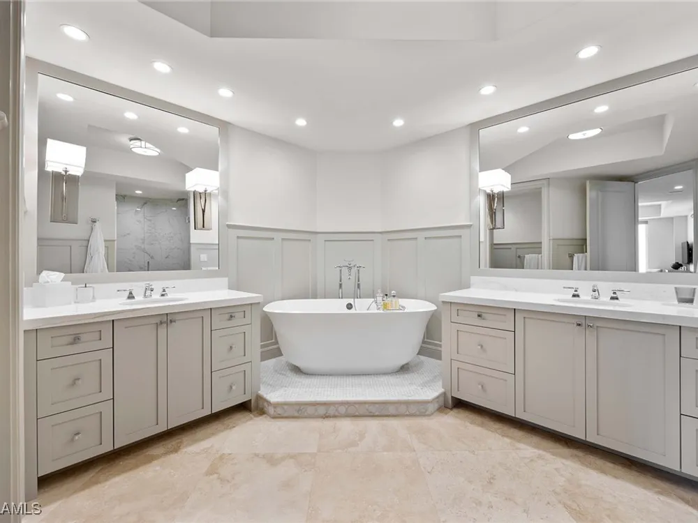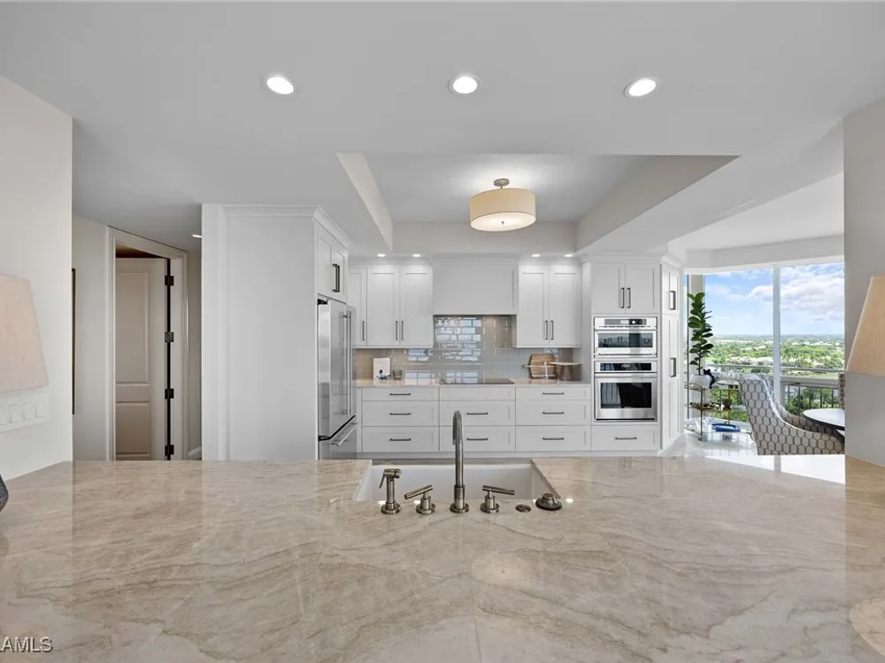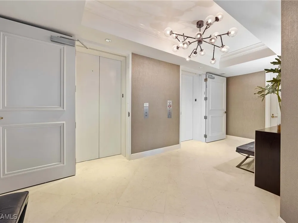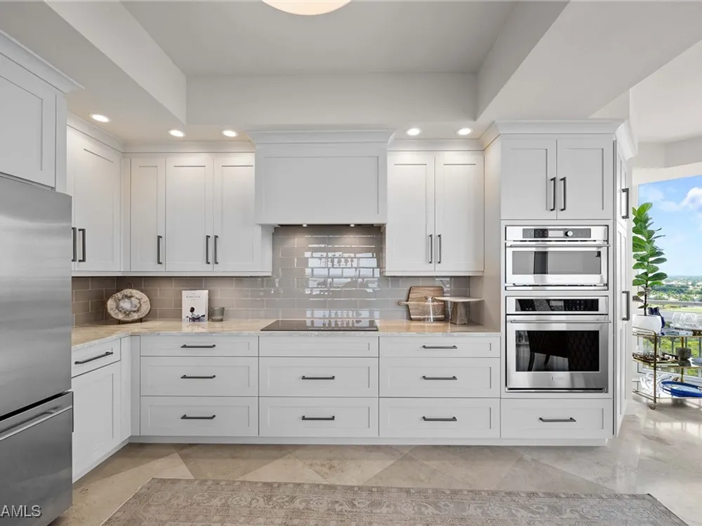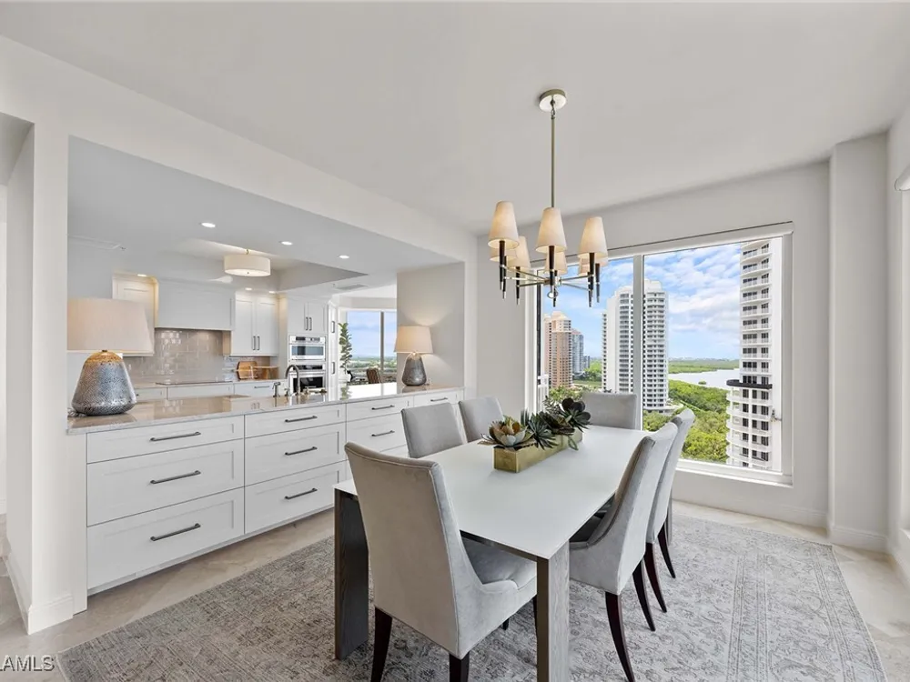 Prepare to fall in love at first sight with this extraordinary waterfront residence, where panoramic views of Estero Bay and the Gulf create an enchanting backdrop for your everyday life. This exquisite end unit, bathed in natural light, offers a move-in-ready experience with its sought-after coastal transitional design and high-end finishes throughout, all tastefully curated by a professional decorator. Enter the stunning living area, which seamlessly transitions to a covered balcony, ideal for enjoying waterfront views and sunsets. The space flows effortlessly into the elegant dining room and spacious, fully updated chef’s kitchen. It also features an impressive glass-enclosed bonus space with floor-to-ceiling windows, delivering breathtaking views of the water, golf course and community beyond. The luxurious primary suite is a sanctuary, boasting unparalleled views, a beautifully updated spa-like bath, a new custom walk-in closet and built-in storage wall. The generously sized guest room includes an updated en-suite bath and walk-in closet, while an additional bedroom, used as a den, offers versatility and convenience with a nearby updated full bath. This condominium is complete with new electric shades throughout, a secure elevator with a private entrance foyer and two garage parking spaces on the second level. Amenities include secured entry, on-site manager, resort-style pool with spa, cabana bar and grills, state-of-the-art fitness center, clubhouse, card and billiards rooms, a theater and guest suites. Bonita Bay spans 2,400 acres and features a guarded and gated entrance, a private Gulf-front beach park with shuttles, and 12 miles of recreational and biking trails. Residents enjoy three recreational parks that include a butterfly garden, bocce, tennis, pickleball, basketball, playground, picnic areas, pet water stations, and kayak/canoe launch and storage. The community also boasts over 30 resident clubs, social events and a fabulous on-site marina with the charming Backwater Jack’s Restaurant, Sweet Water Boat Club and Gulf access. Proximity to The Promenade at Bonita Bay with great dining, shopping and fabulous farmers market. Bonita Bay Club membership is optional. The club offers exceptional services, amenities and facilities, including a stunning clubhouse, restaurants, dining options from casual to fine, full-service bars and five world-class golf courses. three on the main property and two in Naples. It features practice ranges, a short game practice area, a sports center with a saltwater pool, lap lanes and a sundeck, as well as 18 Har-Tru tennis courts, 10 pickleball courts and a new croquet court. The luxurious full-service spa and salon, along with the lifestyle center's nearly 20,000 square feet dedicated to fitness, were ranked #2 in Club + Resort Business for the 2023 Top-Ranked Fitness and Wellness Experience!