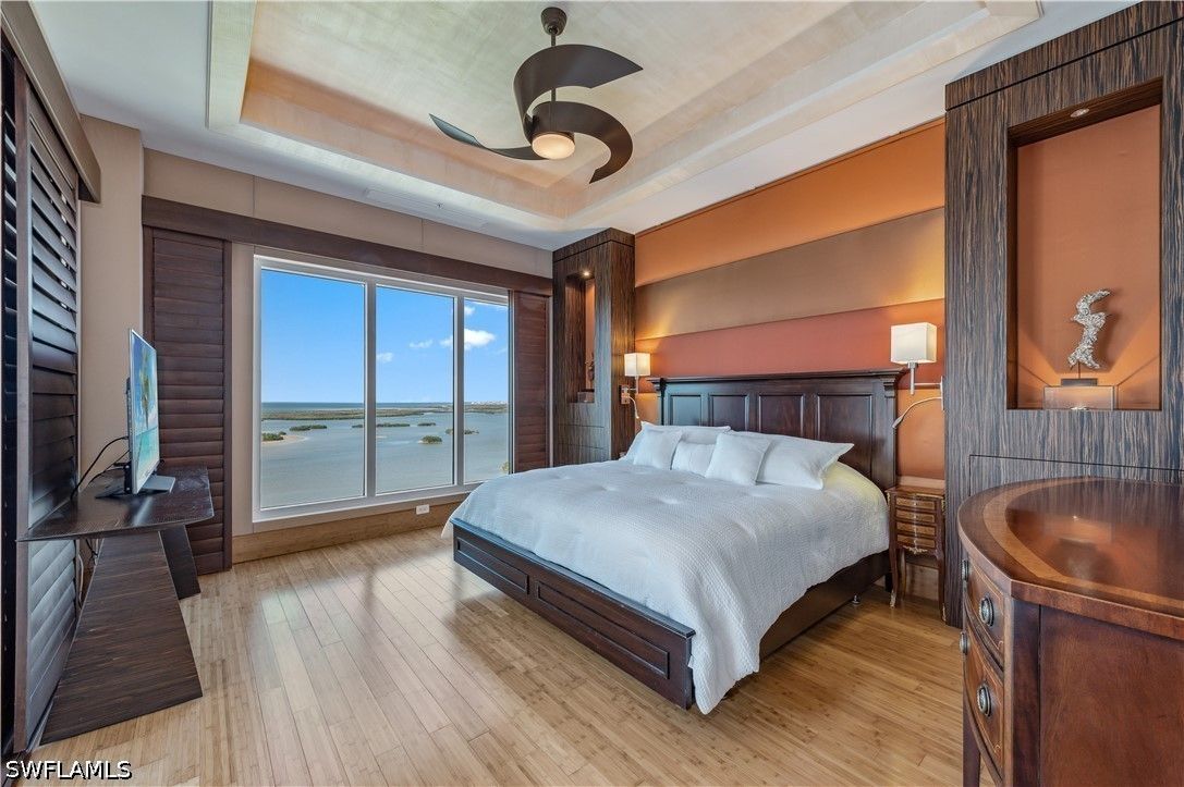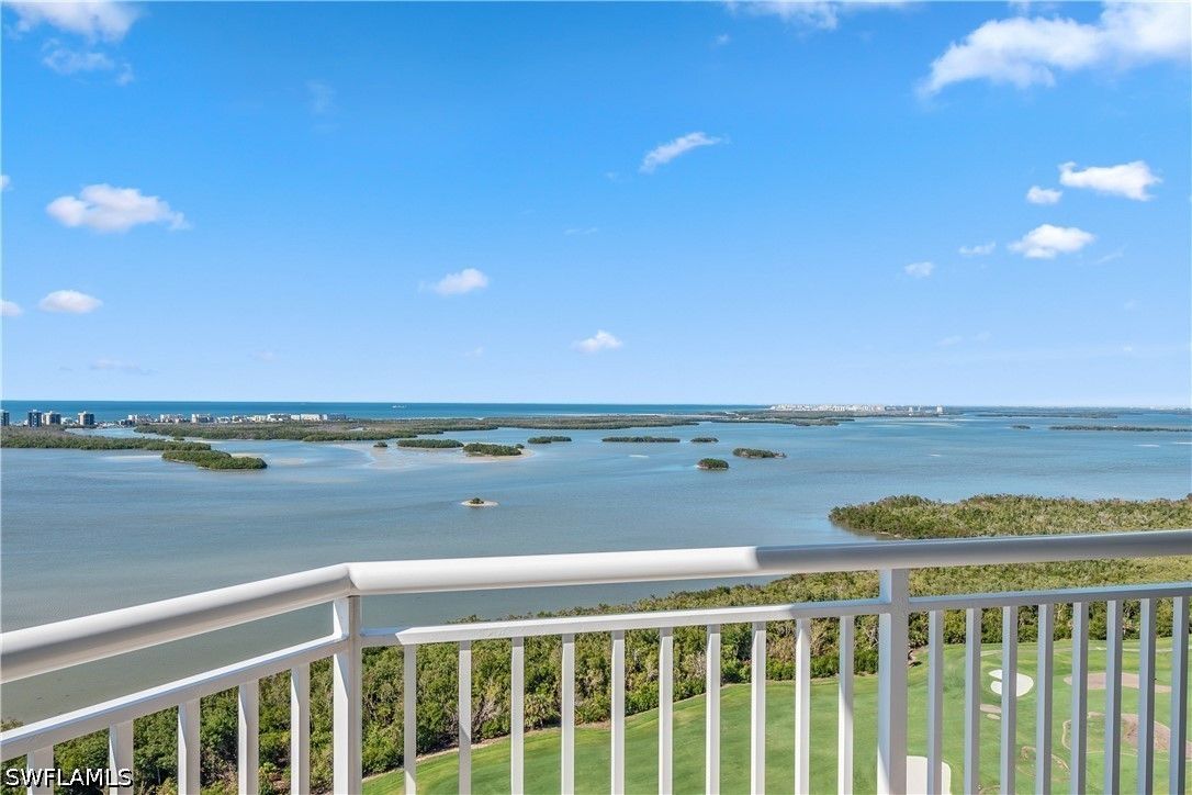 One or more photo(s) has been virtually staged, AI generated or rendered. A unique and exceptional home in the sky. This 25th-floor unit in Esperia at Bonita Bay offers exceptional panoramic views of the Estero Bay and the Gulf of Mexico. Private entry alcove. Dramatic 11 foot ceilings throughout. 3 Bedroom/3 Baths. Open balcony with picturesque views to the West and dramatic sunsets. The second balcony is screened with a built-in grill, perfect for casual outdoor dining and entertaining. Wall coverings are Venetian plaster and soft linen. Travertine/marble floors in main living areas and bamboo wood floors/baseboards in bedrooms. Many high end custom features with a contemporary flair. Offered furnished. Esperia's special amenities include an oversized resort-style pool and spa with cabana/entertainment area and excellent fitness center--with professional management. Bonita Bay offers a private beach park on the Gulf with free shuttle service, a full-service marina with wet and dry storage, and 12 miles of walking paths through nature. The optional Bonita Bay Club features five 18-hole golf courses, tennis, pickleball, and croquet; also, state-of-the-art fitness center, spa/hair salon, and restaurants. Please don't miss seeing the photos!