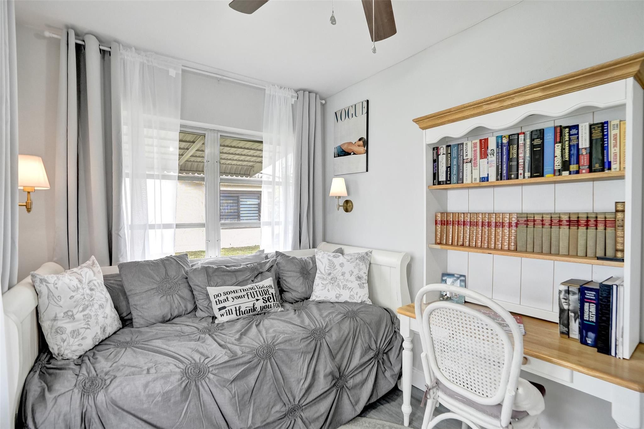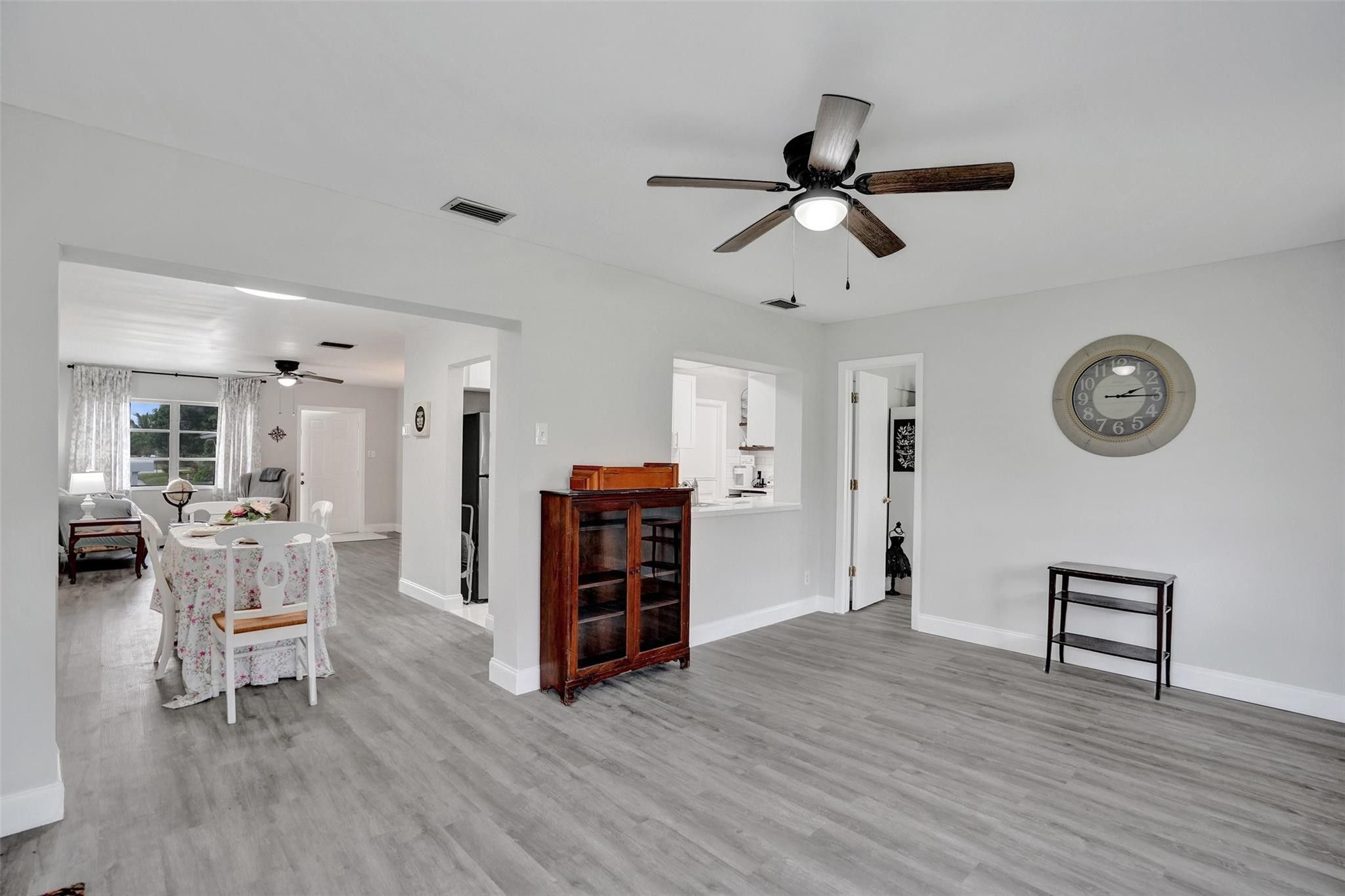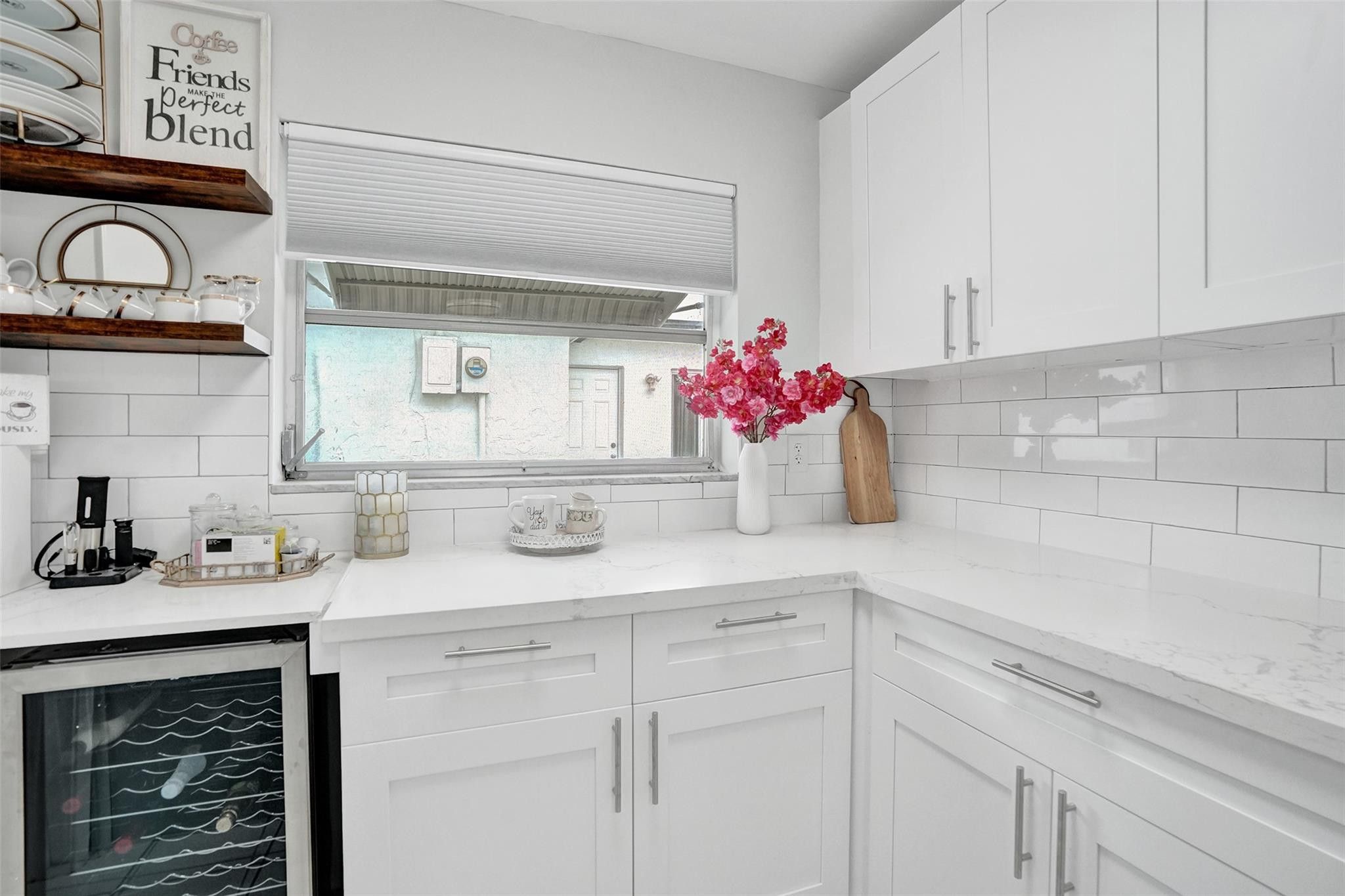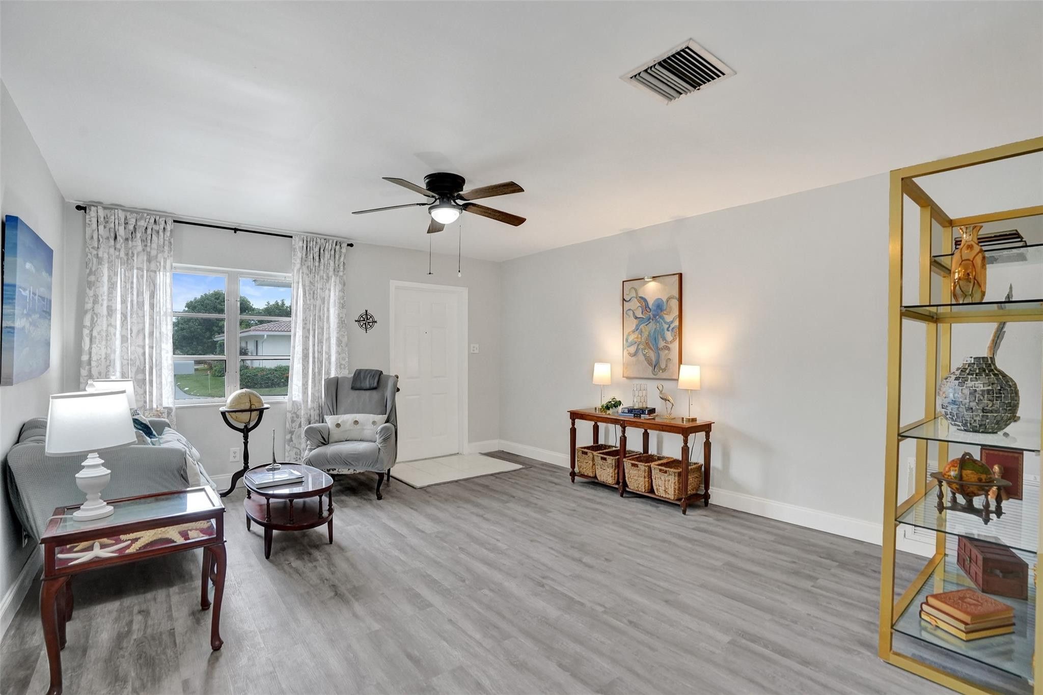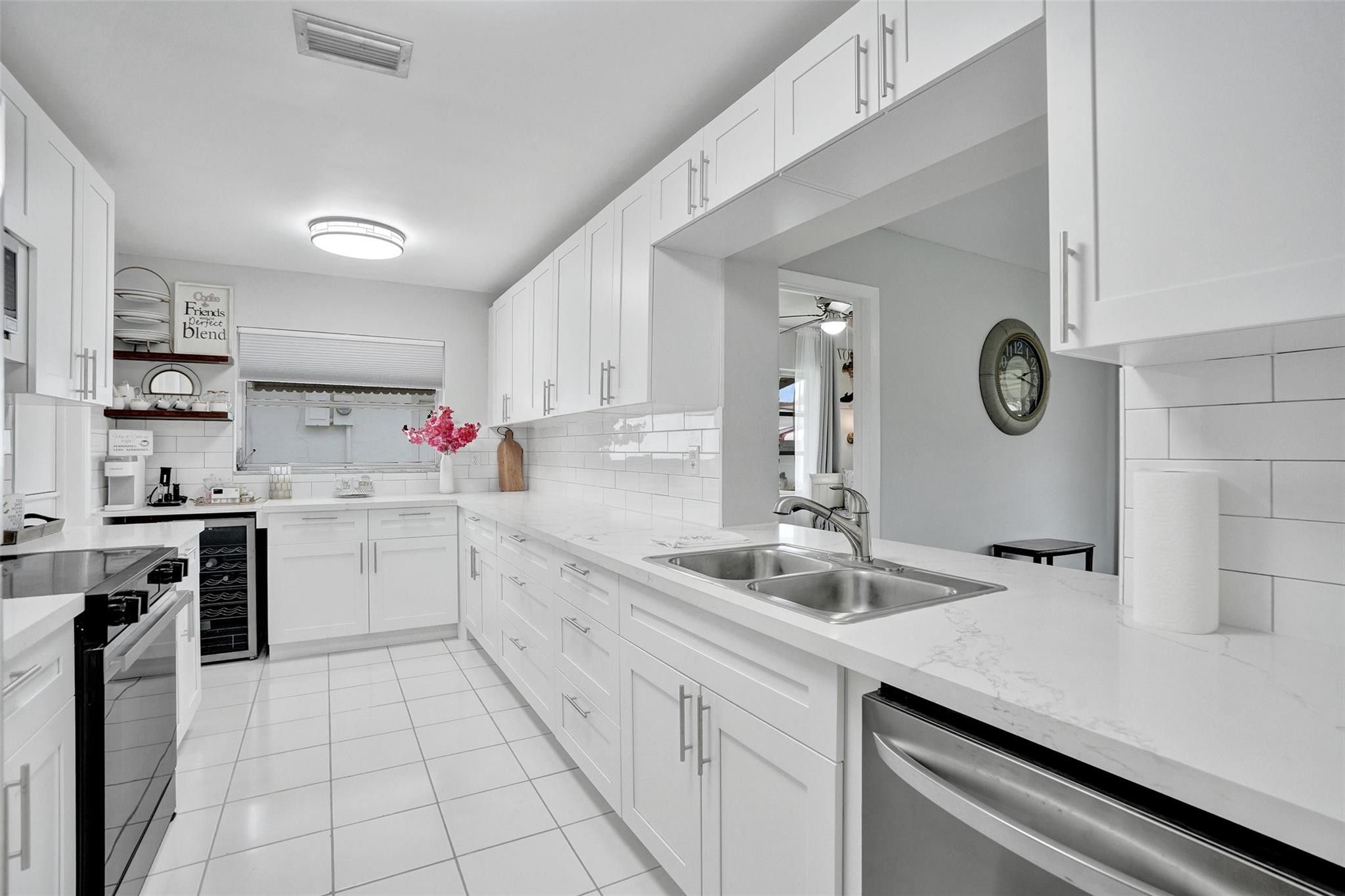 Located within a welcoming 55+ community, Imagine incredible ease of living in this adorable home with newly expanded kitchen and coffee bar feature, stainless steel appliances, white Shaker cabinets and shiny quartz countertops. Spacious primary suite and guest suite are complemented by the bonus office/den bedroom currently featuring a desk and daybed. Meticulously maintained and luxuriously upgraded, this charming Mainlands cottage is a remarkable opportunity. Enclosed Florida room means two large living areas plus formal dining. The plethora of storage extends into the converted garage featuring workshop, storage and and laundry room. Garage can easily be converted back to full single car plus laundry. This community offers amenities including park, clubhouse, and 2 pools.