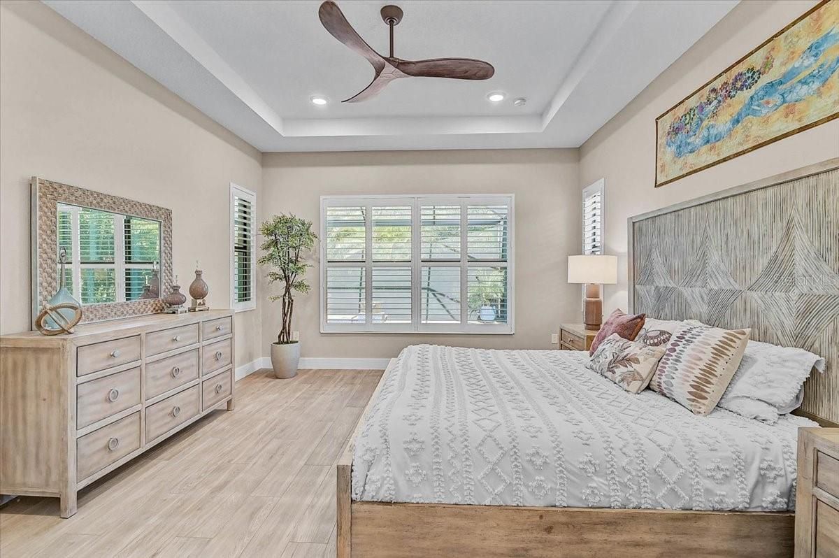 - Ceiling Fan(s), High Ceilings, In-Wall Pest Control, Living/Dining Room, Open Floorplan, Main Level Primary, Solid Surface Counters, Tray Ceiling(s), Walk-In Closet(s), Window Treatments