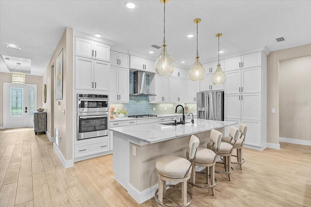 Need Space & Quiet? This beautifully designed home delivers Both! 4 Bedrooms, 4 Bathrooms & Den + a Smart Split Bedroom Floor Plan...Located in a Gated 55+ Community with resort-style amenities & Full-Time LifeStyle Director. An Entertainer’s Kitchen anchors the main living space with Quartz Countertops, Stacked White Cabinetry, Upgraded Appliances (Convection Oven)+ Custom Pantry. The Owner’s Suite is spacious & private, featuring Split Vanities, a large Zero-Entry Shower & Closet System. 1 Guest Ensuite + Shower is tucked away for added Privacy. Upstairs, you'll find a Large Bonus Room = No Rules Zone—Ideal for crafts, movies, hobbies, or shutting the door and doing your own thing—plus a Private Bedroom & Adjacent Full Bath. The Outside Steals the Show! A Custom Pool + Spillover Spa Invites to Unwind++ Private Lanai that feels more like a boutique resort than a backyard. The Outdoor Kitchen, Lush Landscaping & Professionally Designed Lighting turn evenings into an Experience. Quiet. Relaxed. Completely Private. It’s the kind of space where time slows down & plans get canceled because you’d rather stay home. 3 Car-Attached Garage=Space for the Florida Lifestyle. There's so much more to see!