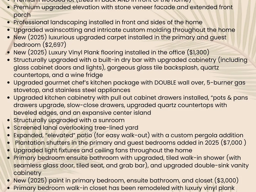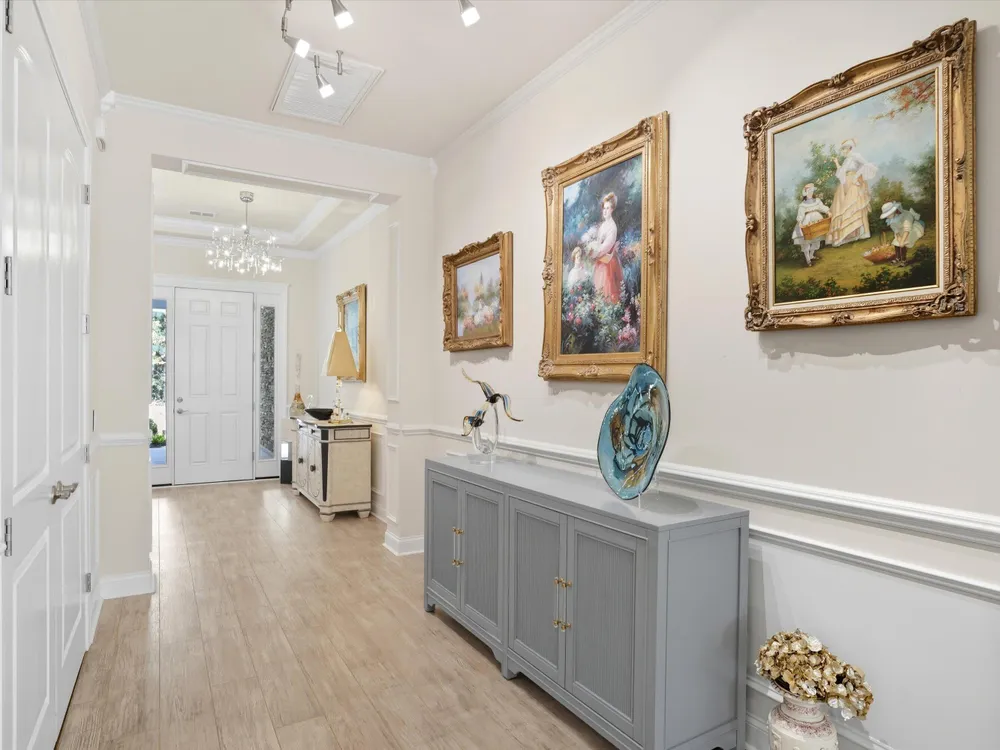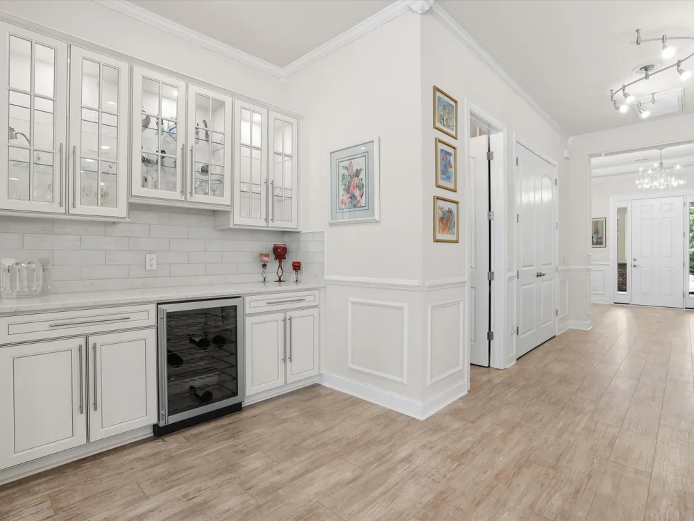 Rare opportunity to own the highly sought MONT BLANC floor plan! Impeccably kept and loaded with custom upgrades, this home is a true stand-out and is sure to capture quick attention. Situated on a premium wooded lot with tranquil views from nearly every room in the home, you will be thrilled with the added bonus of a wooded conservancy in front as well! Upgrades begin with a top-tier elevation which includes an expanded porch and beautiful stone veneer facade. Upgraded luxury vinyl plank flooring can be found throughout the main living areas and office, with new (2025) highly-upgraded, luxurious plush carpeting in the primary and secondary bedroom suites. Custom finishes and ornate molding can be found high and low. The gourmet chef's kitchen is a culinary dream with a double wall oven,5-burner gas stovetop, upgraded cabinetry, HUGE center island, upgraded quartz countertops with beveled edging, soft-close drawers, upgraded cabinet drawers, pull-out cabinet shelving, stainless steel appliances, TWO pantries (with one being an extra large walk-in pantry), and so much more! You will also enjoy the unique upgrade of the built-in dry bar with upgraded cabinetry (with glass doors and lights), gorgeous glass tile backsplash, and a wine fridge. The open floor plan allows for a seamless transition from the kitchen to the spacious great room which includes a sizeable family room, designated dining area, and an upgrade addition of a sunroom (currently used as an additional dining space). With SO MANY special finishes and upgrades to take in, don't forget to pause and appreciate the extra intricate molding details that can be found around all windows, doors, and even wall corners. The primary bedroom suite is a true haven for total relaxation. There is plenty of space for all of your favorite bedroom furniture with enough room left to create a cozy nook for reading in a comfy chair or watching the resident deer who come out from the woods to to say hi now and then! The primary ensuite bathroom with an expansive double-sink vanity, more upgraded cabinetry, large linen closet, separate "water closet", and upgraded walk-in shower is rivaled only by the newly remodeled (2025) primary suite walk-in closet with luxury vinyl plank flooring and a custom closet system. But wait, there's more! It's not just the interior of the home that will check all of your "dream home wish-list" boxes... Your favorite living spaces are sure to extend outdoors as well! The screened porch with pull-down shade will offer you a welcoming retreat to enjoy your morning coffee or evening nightcap, and the upgraded / expanded patio with shaded pergola provides the perfect outdoor living space for kicking back or entertaining. Yes, this home is as beautiful as it is functional, but if you are also looking for extra storage options then you have found your golden ticket! If the abundance of closets and cabinets throughout the home aren't quite enough for you, you will find all the storage space you need (and then some) in the enormous laundry room featuring an entire wall-length of additional cabinetry (upper and lower), AND an over-sized utility closet. While the large mud room provides even more space with endless options. Speaking of mudroom... wait until you walk through the mudroom and set your eyes on the newly updated garage. Freshly painted walls with the addition of tall baseboard molding, freshly installed epoxy floor covering, and attached ceiling racks make this garage the envy of the neighborhood! Four Seasons 55+ community offers residents a resort-style amenity center complete with all of your favorite outdoor activity courts, a refreshing outdoor pool, a pavilion with outdoor kitchen and seating, a kayak launch for easy water-way exploration, and so much more. The well-appointed clubhouse provides an indoor lap pool, hot tub, exercise gym, billiards and game rooms, event room and kitchen, craft rooms, and much, much more! Four Seasons is located in the master-planned community of Cane Bay Plantation, which offers miles of walking/biking/golf-car trails that connect with all neighborhoods, the community YMCA, and the Cane Bay Market Plaza (shopping and dining options, gas station, bank, and multiple businesses). Don't delay... it's time for you to live your best life at 497 Four Seasons Blvd in Summerville, SC! ** many items in the home are available for sale. Please inquire with your agent if you are interested in purchasing any furnishings, decor, art, etc.. ** a contractor quote has been obtained for framing and door installation for the office. We are happy to provide this quote if you would like to consider future options for creating a closed office or 3rd bedroom. We have placed this contractor quote in the document section of the MLS listing to ensure that your real estate agent has easy access and can share it with you.