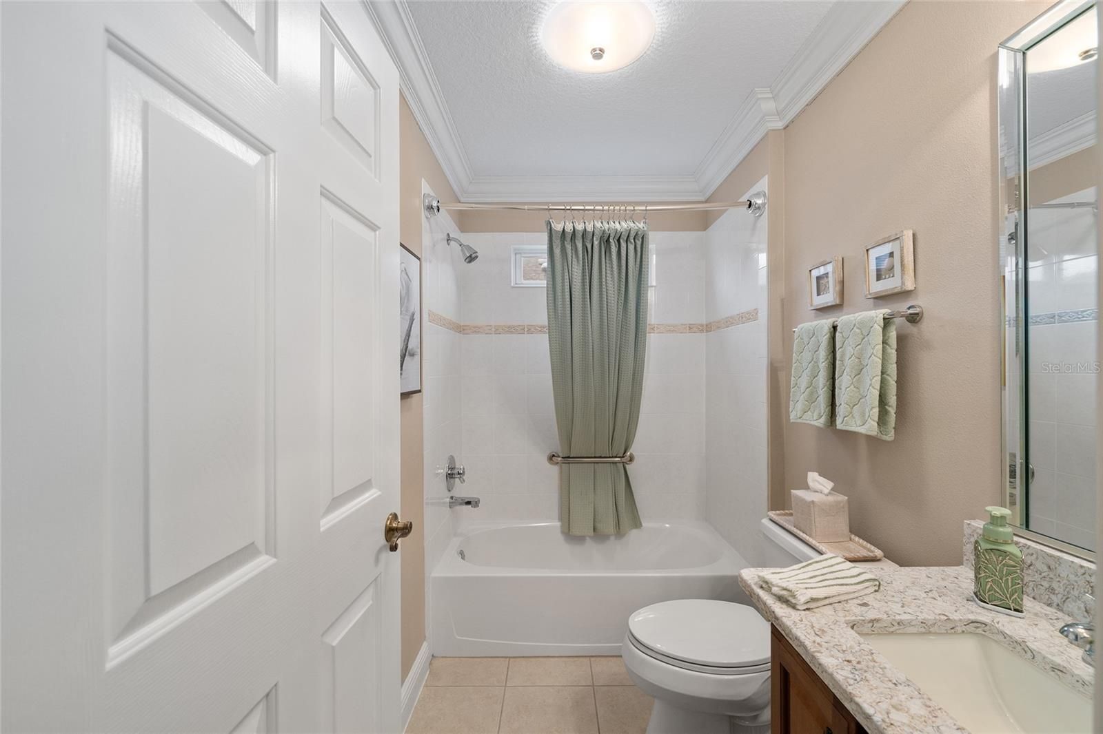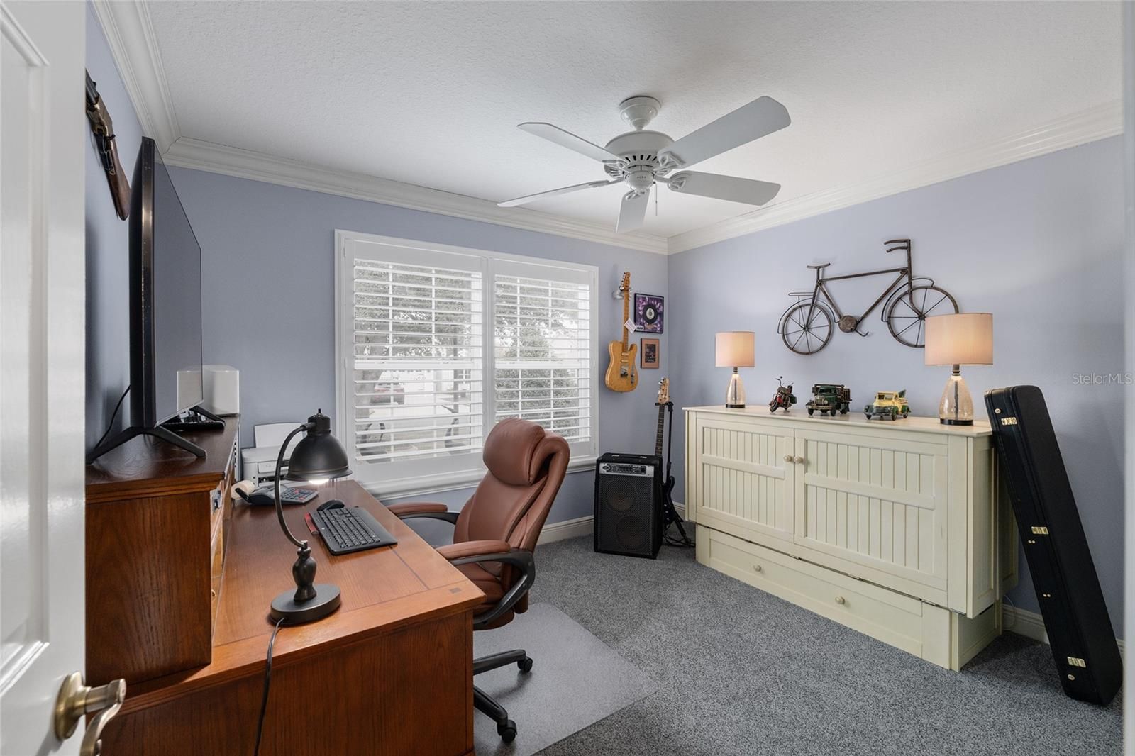 - Ceiling Fan(s), Crown Molding, Eat-in Kitchen, High Ceilings, Main Level Primary, Stone Counters, Thermostat, Walk-In Closet(s), Window Treatments