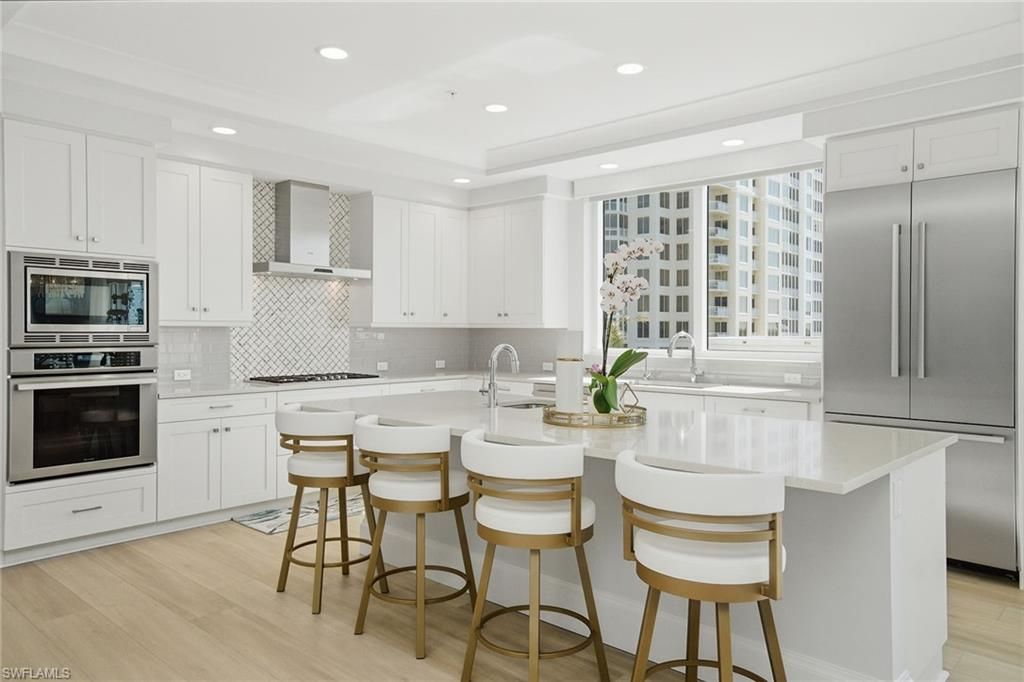 Welcome to an expansive fourth-floor residence in Seaglass at Bonita Bay, showcasing the highly sought after 01 floorplan and a top-of-the-line furnishing package, where refined design meets panoramic views and sophisticated high-rise living. A private, secured elevator opens directly into the residence’s foyer, setting the tone for the quality found throughout. Luxury vinyl flooring spans the property, leading into a beautifully appointed kitchen designed for both everyday living and entertaining. Featuring stainless steel appliances, a gas cooktop, quartz countertops, soft-close cabinetry and drawers, and thoughtfully selected finishes, the kitchen flows seamlessly into the open living and dining areas—creating a space that is both elegant and inviting. Expansive impact glass fills the residence with natural light while showcasing sweeping views of the golf course, mangroves, and Estero Bay whilst bathing the interiors in natural light. Sliding glass doors extend the living space to a generous lanai, perfect for enjoying sunsets and coastal breezes, complete with electric hurricane shutters and a built-in gas grill. The primary suite offers a tranquil retreat with ample closet space and a well-appointed bath, while guest suites on the other side of the residence provide comfort and privacy for visitors. A recently installed Water Cop leak detection system adds an additional level of peace of mind. Residents of Bonita Bay enjoy access to a private Gulf-front beach park, miles of scenic walking and biking trails, a full-service marina, optional golf memberships, and a lifestyle rich in wellness, dining, and social experiences. Seaglass further elevates the offering with resort-style amenities including a spectacular pool deck, state-of-the-art fitness center, theater, guest suites, and elegant common spaces. For buyers seeking a move-in-ready residence within one of Southwest Florida’s most prestigious communities, this Seaglass unit is an exceptional opportunity.